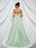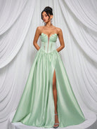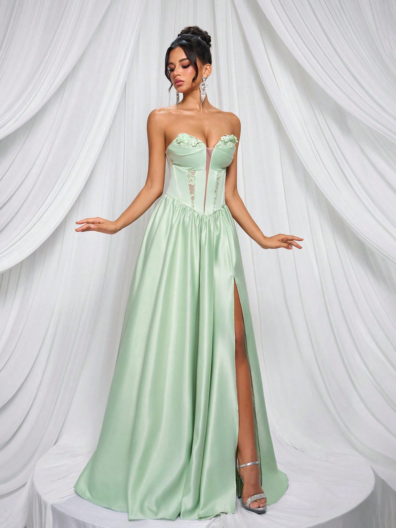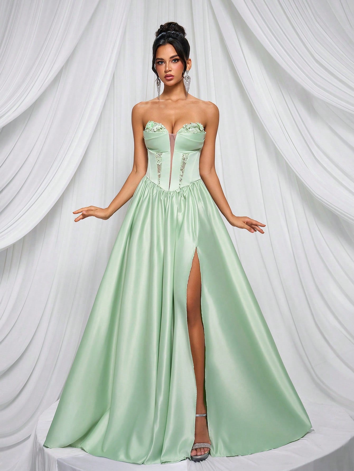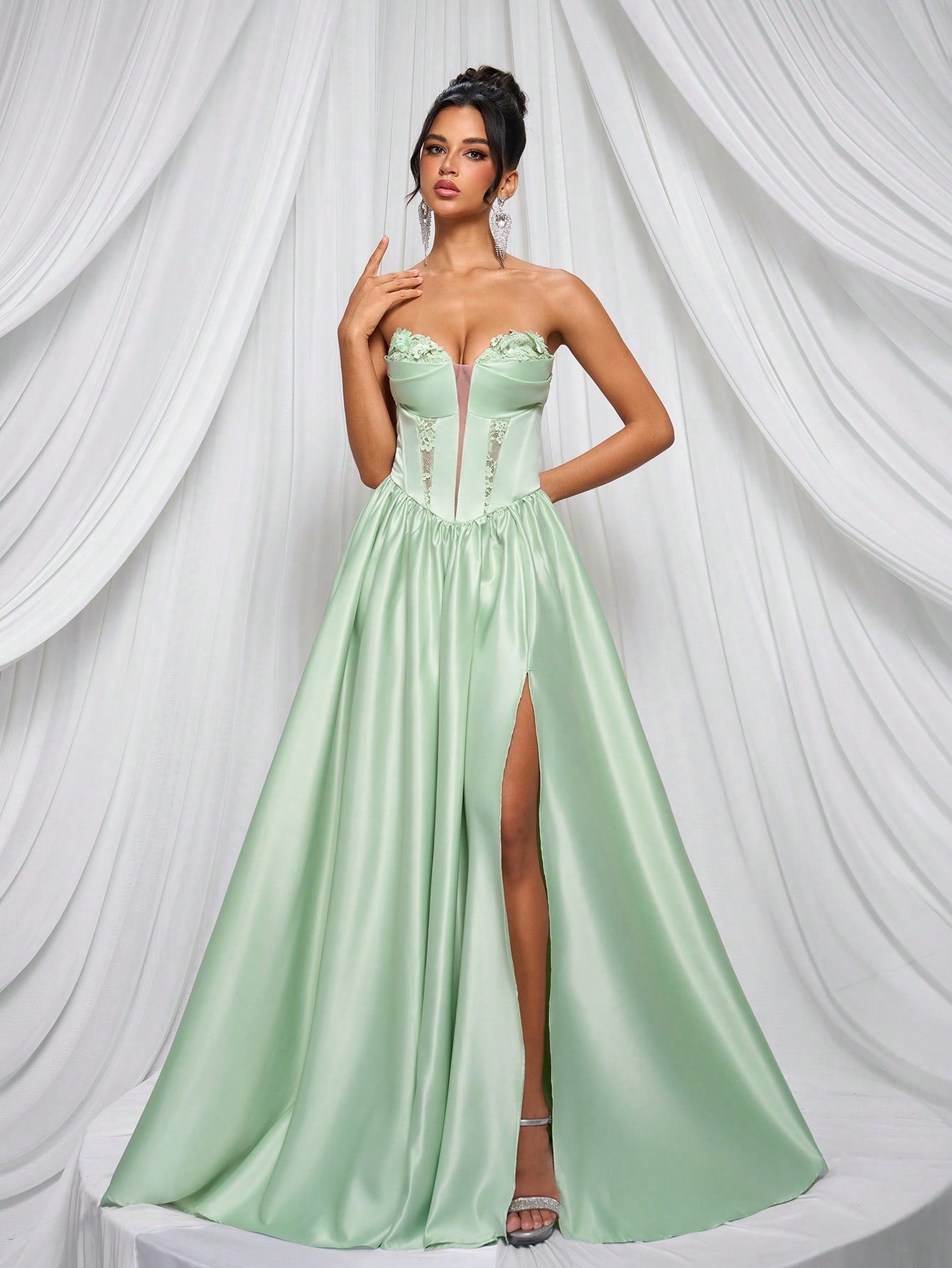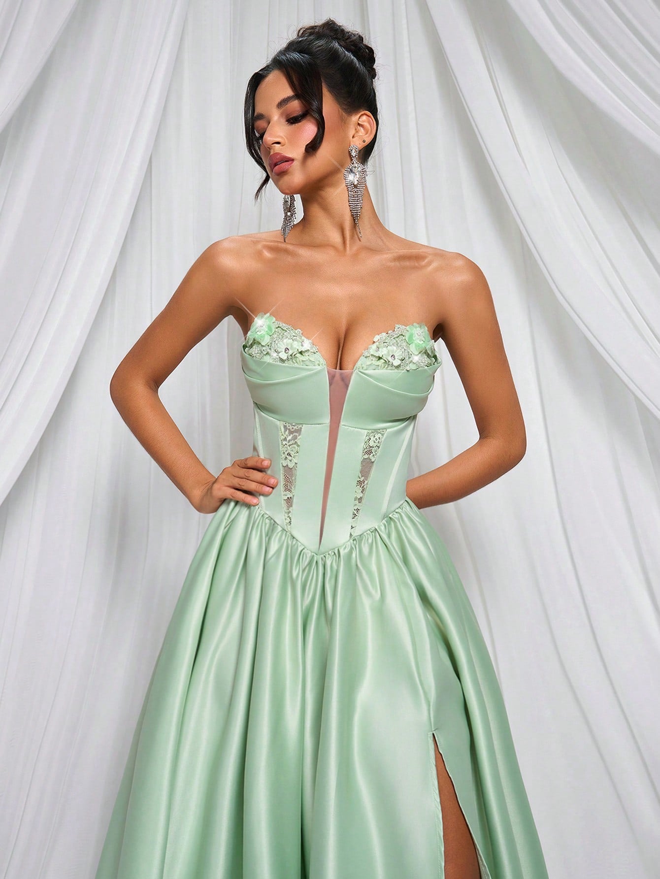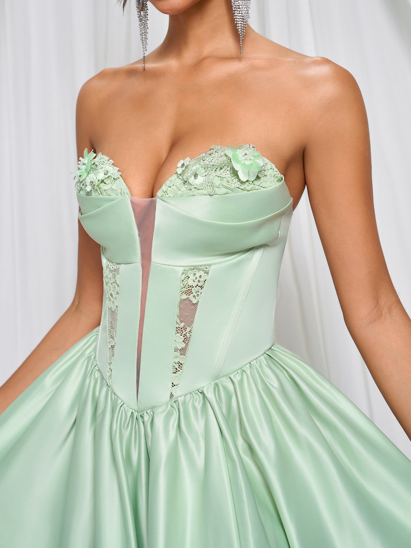 Glamrae Elegant & Romantic Green Luxury Satin Contrast Lace Sheer Handcraft Applique Deep V Neck Underwire