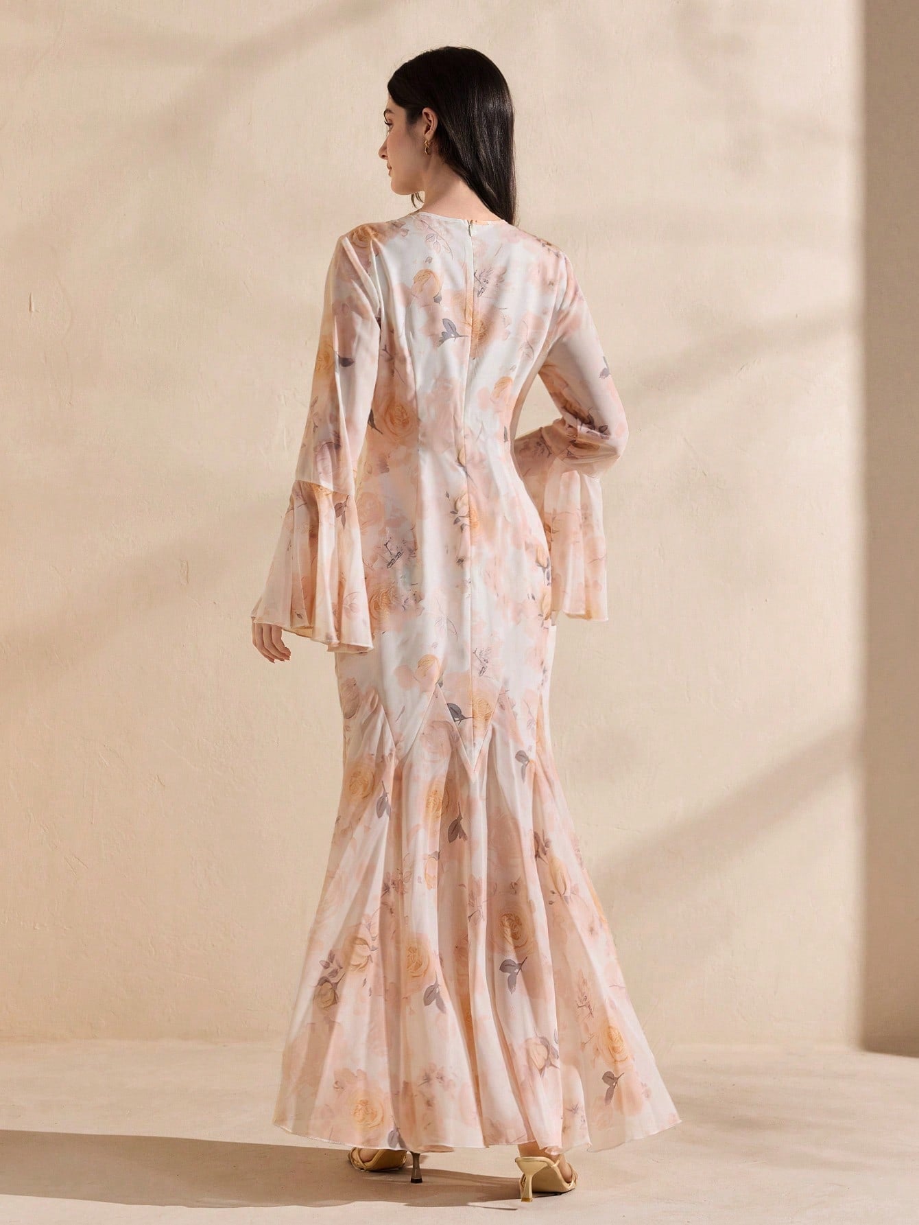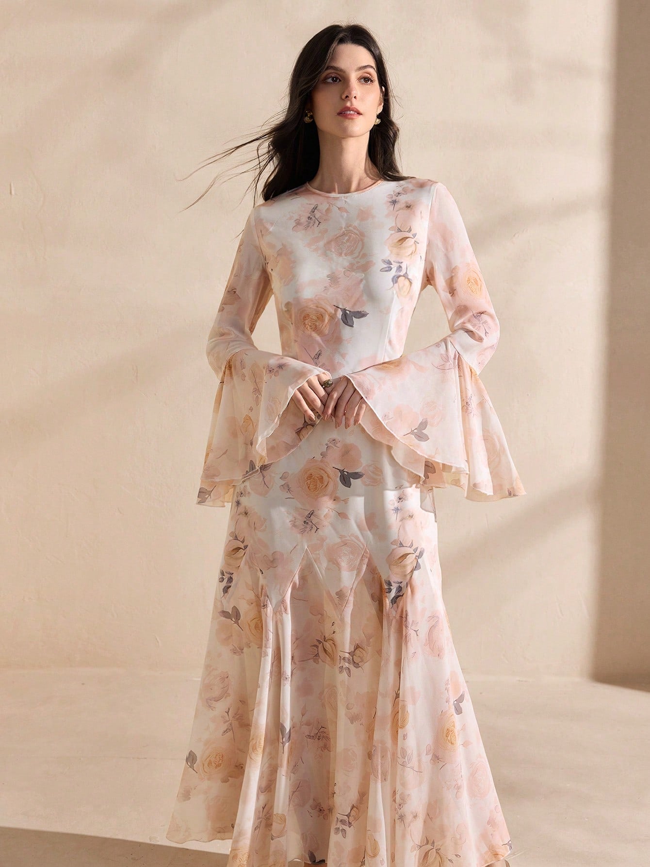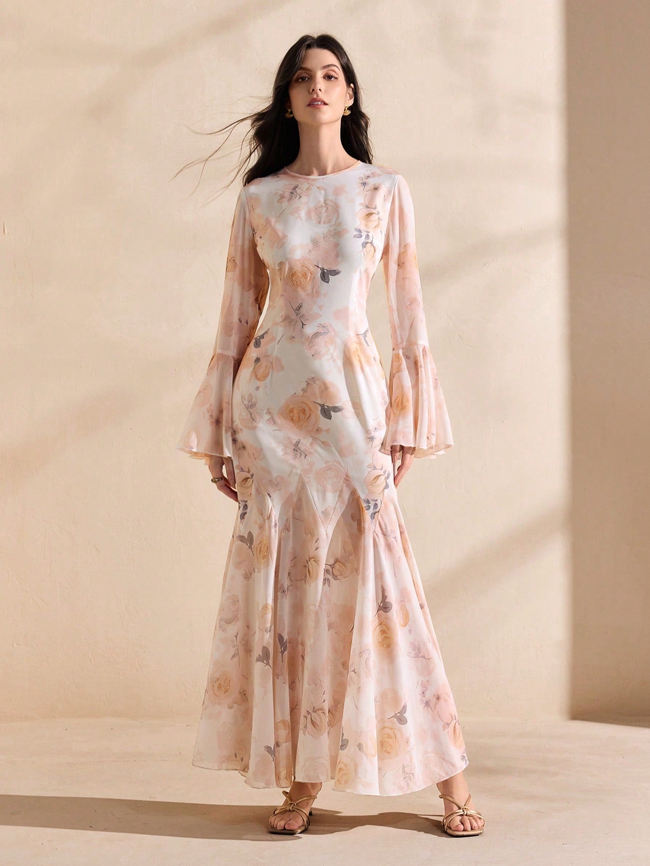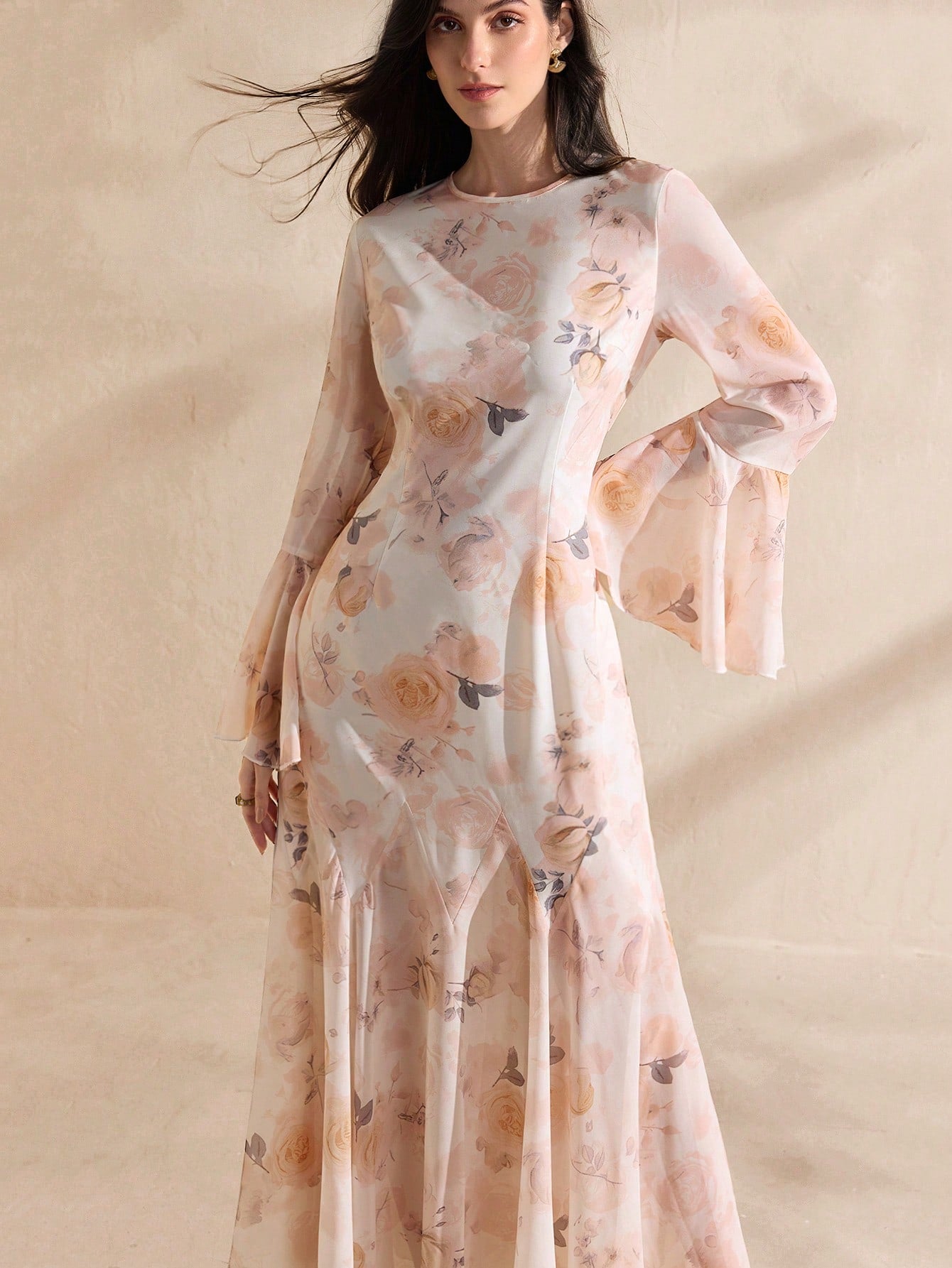 Graceveil Women's Spring Summer Chiffon Long Romantic Floral Patchwork Flare Sleeve Modest Elegant Fashion
