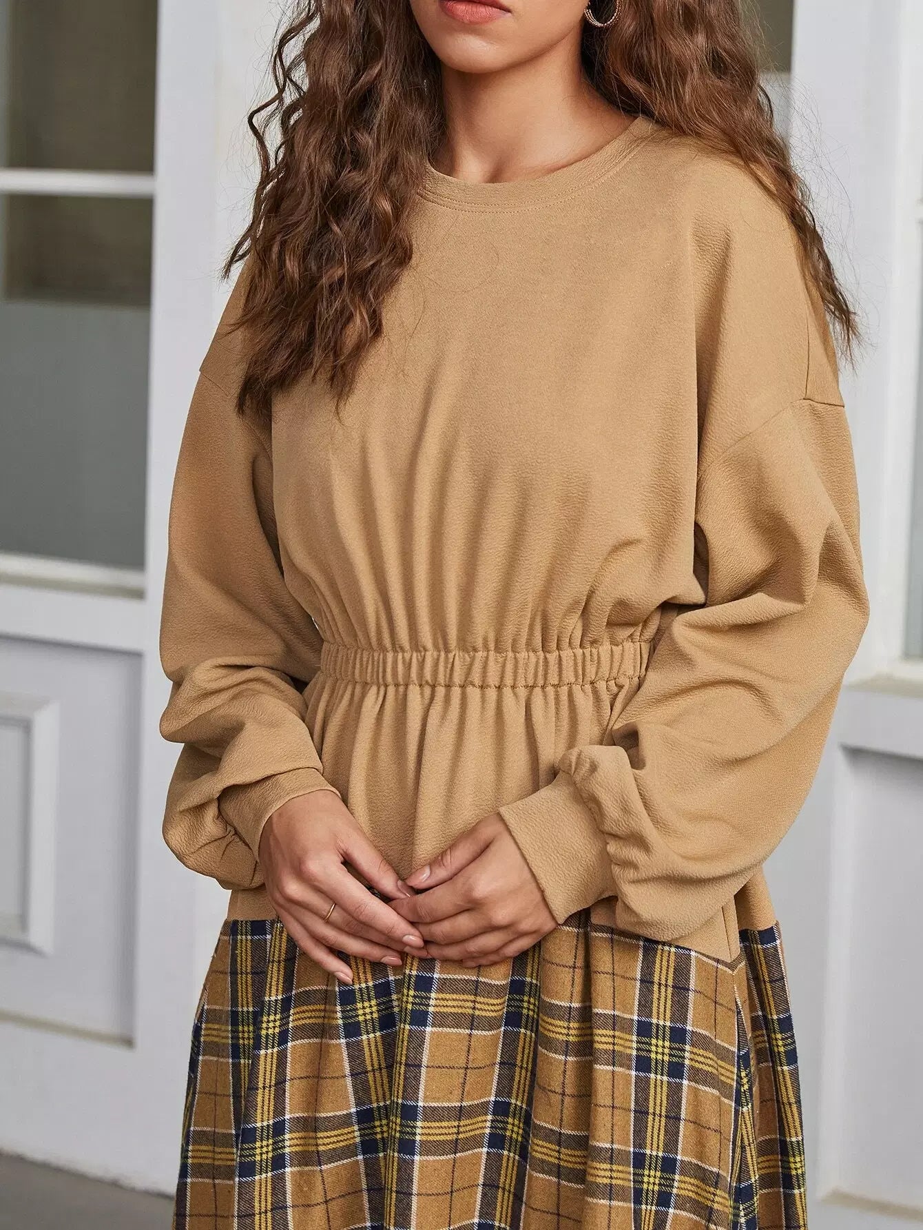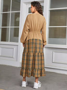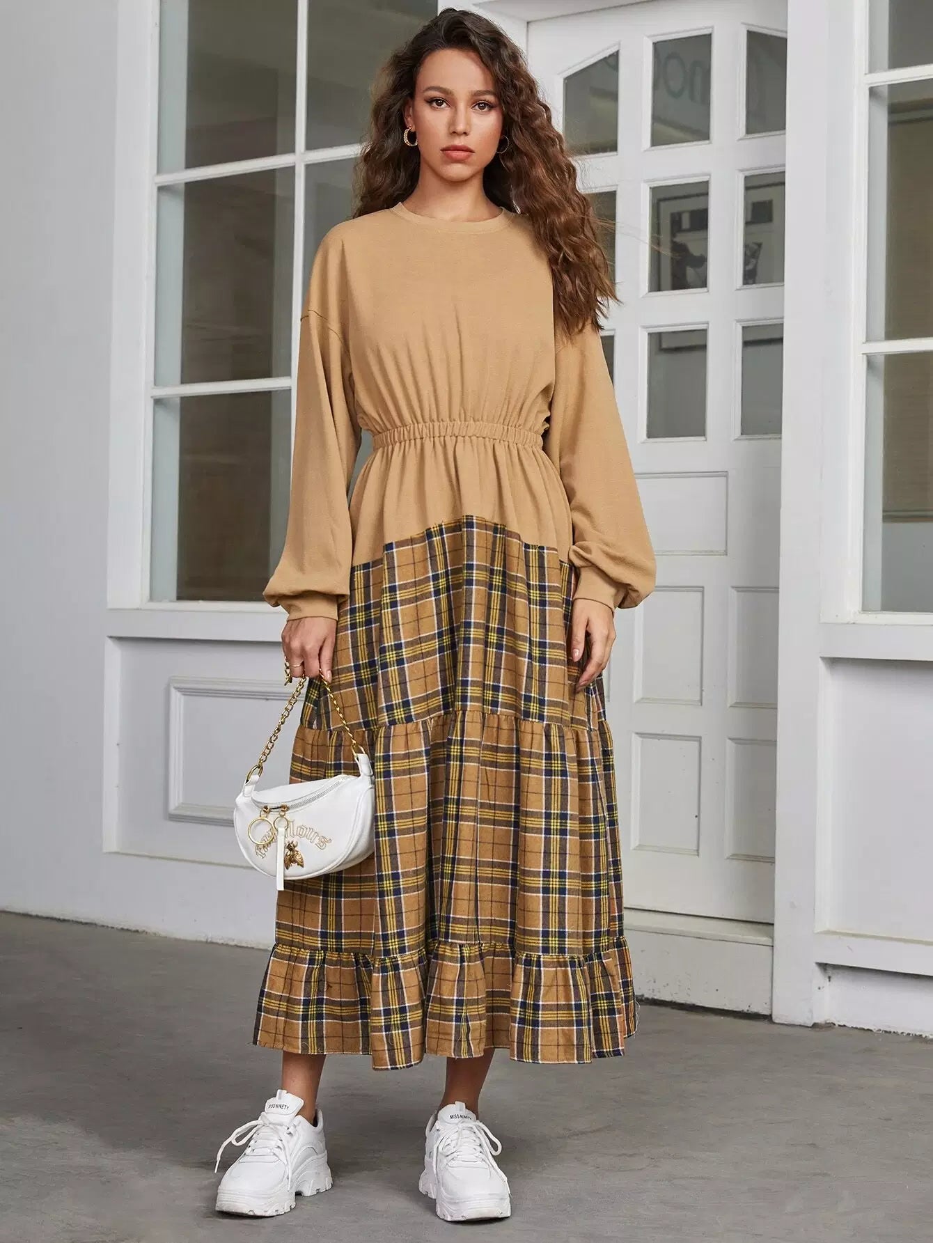 Lantern Sleeve Flounce Hem Tartan Spliced Dress