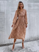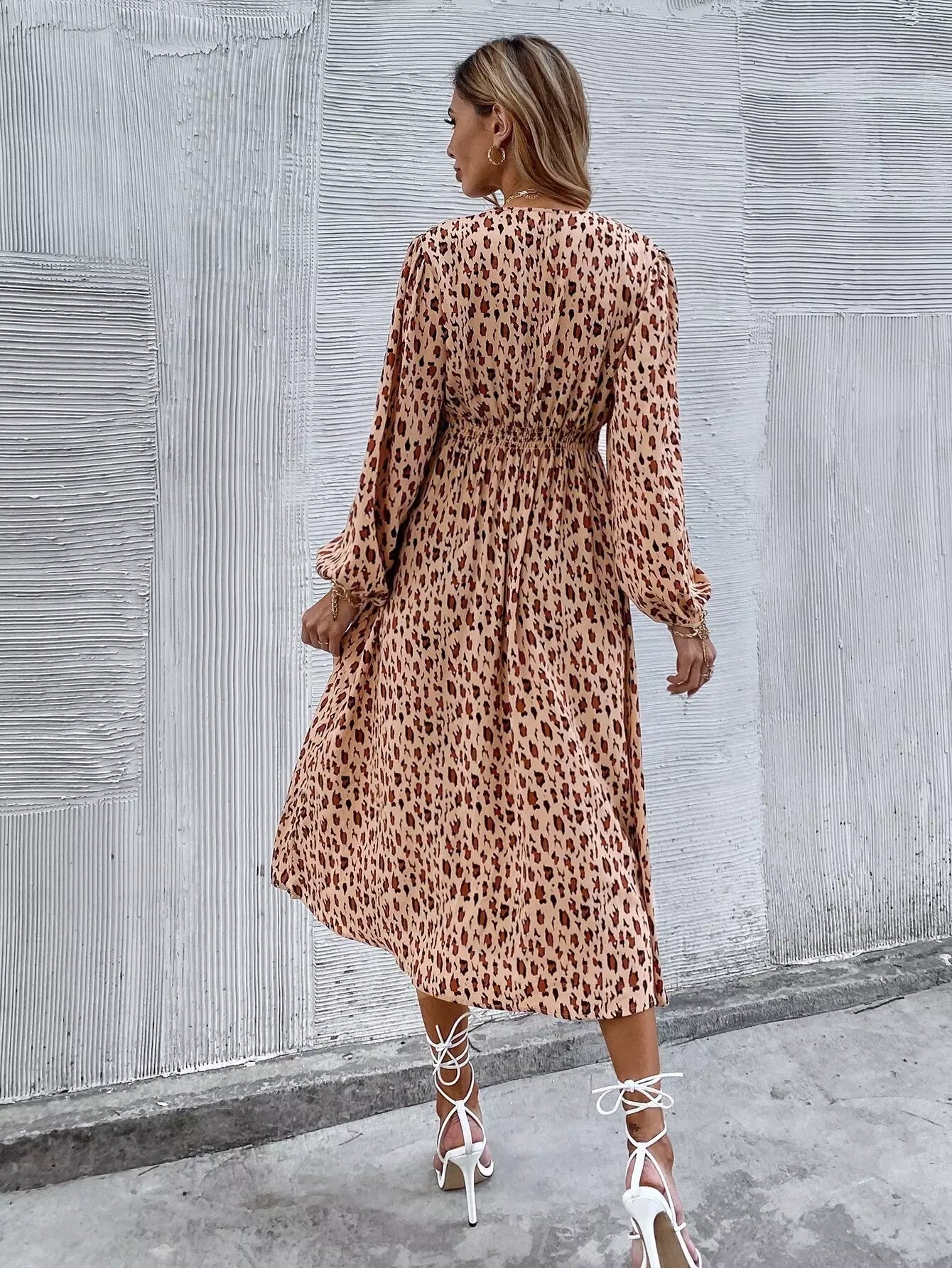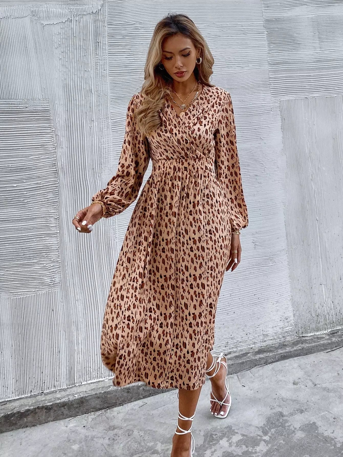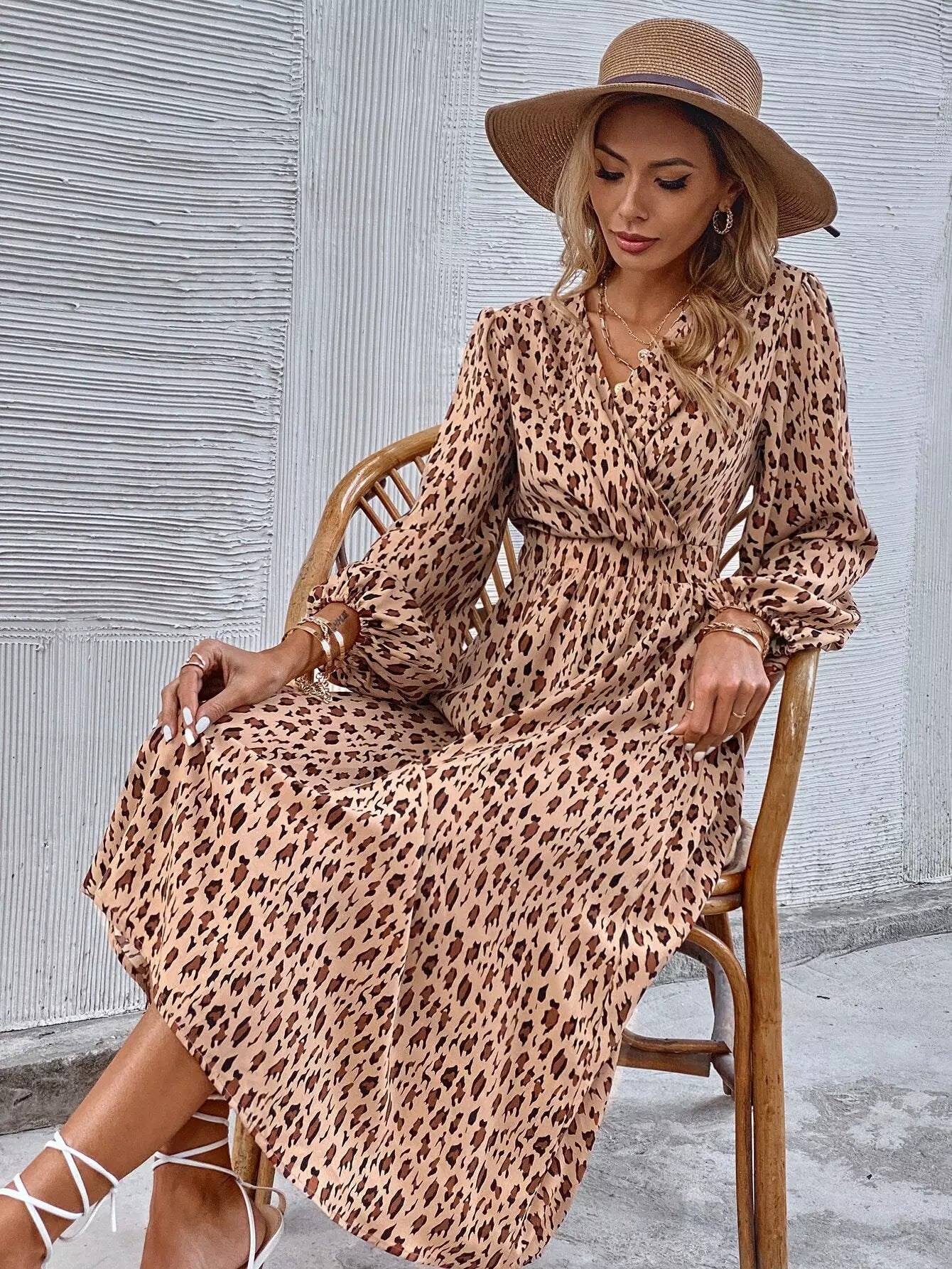 Leopard Print Bishop Sleeve Surplice Neck A-line Dress