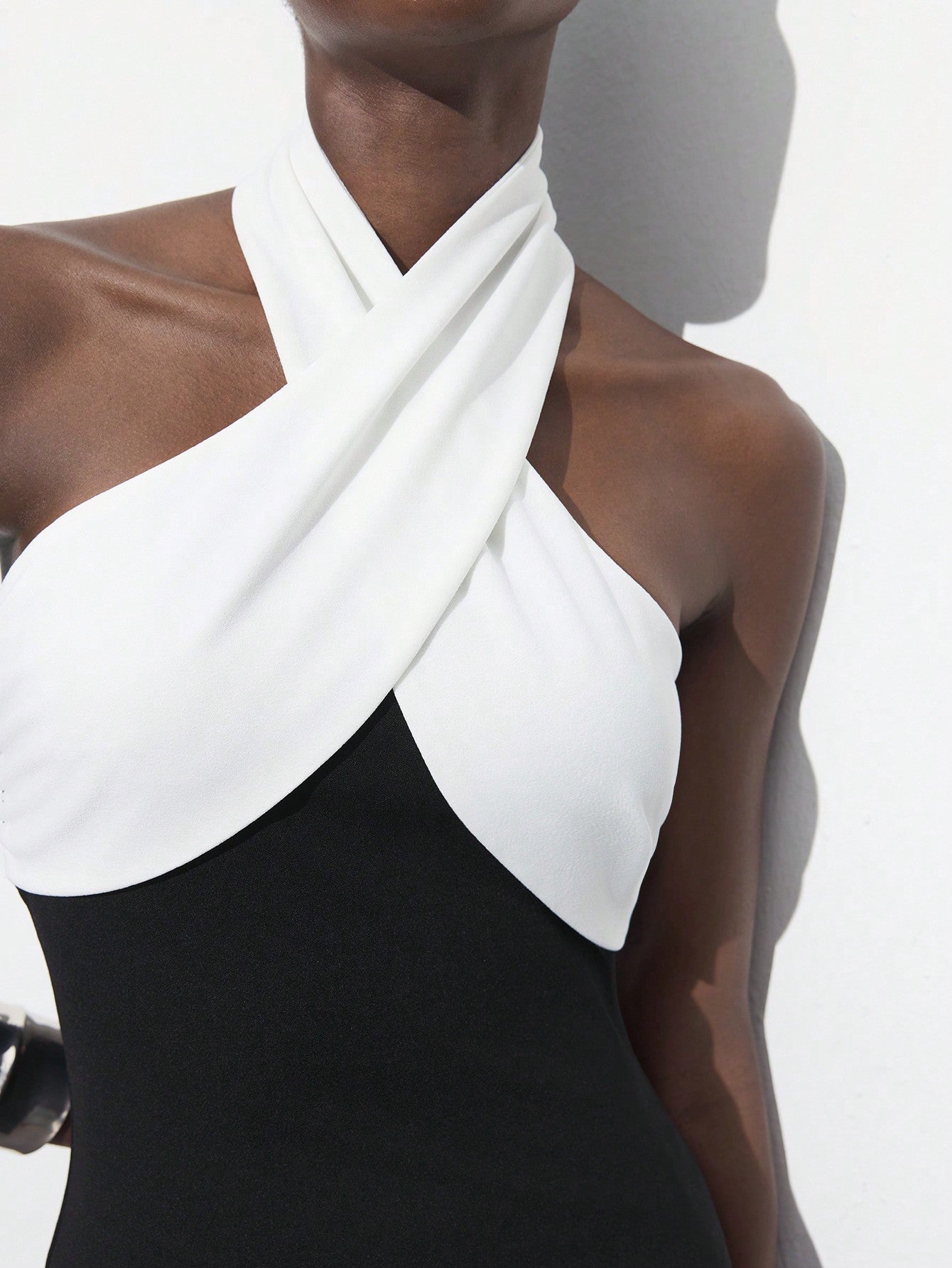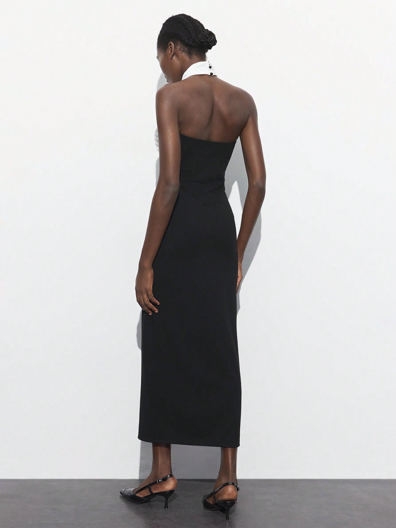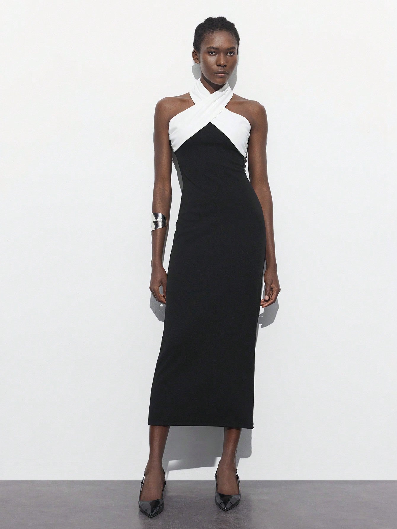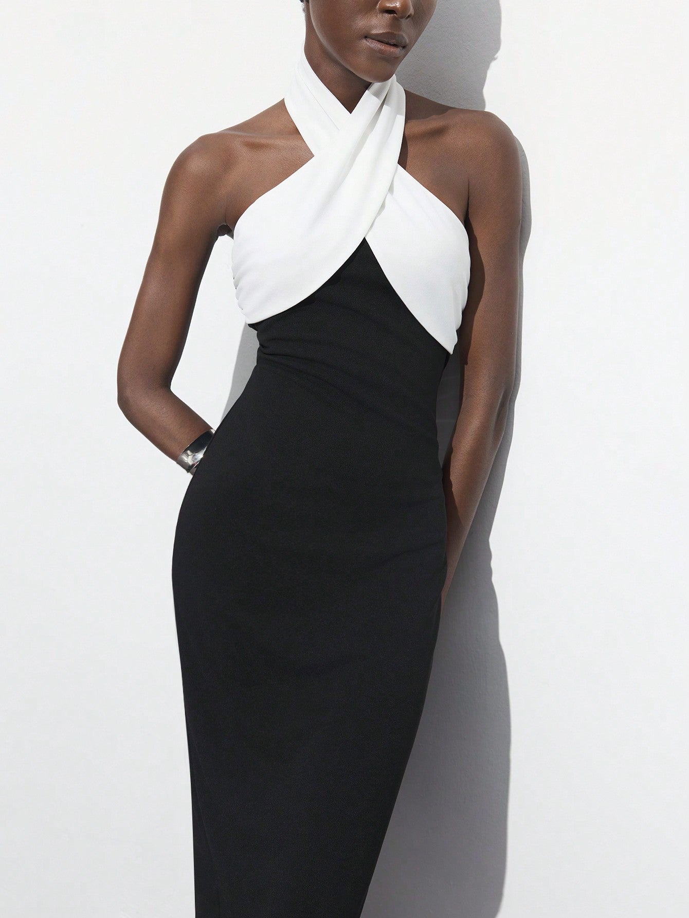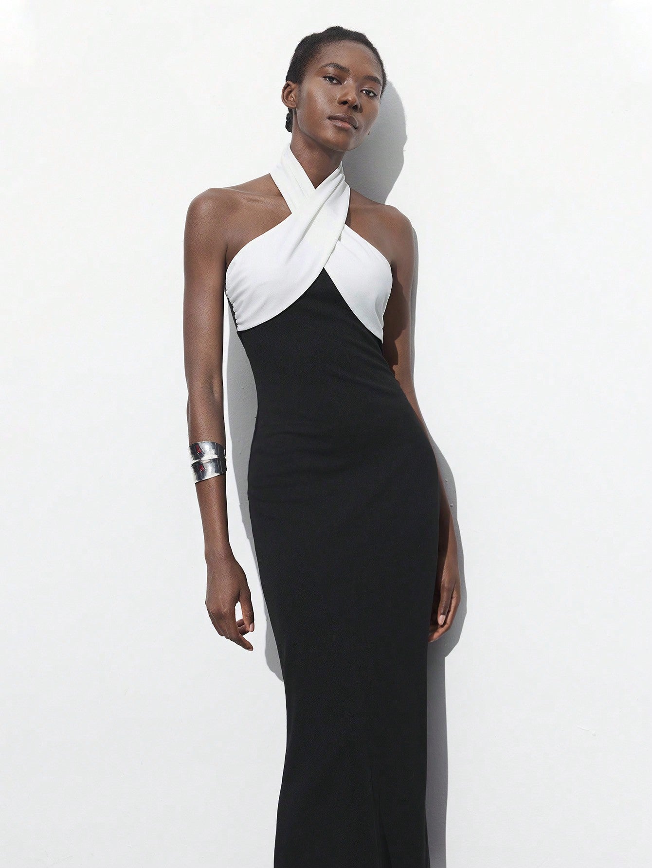 Maija Black & White Patchwork Twist Detail Slim Fit Elegant Long Dress For Women, Suitable For Party,