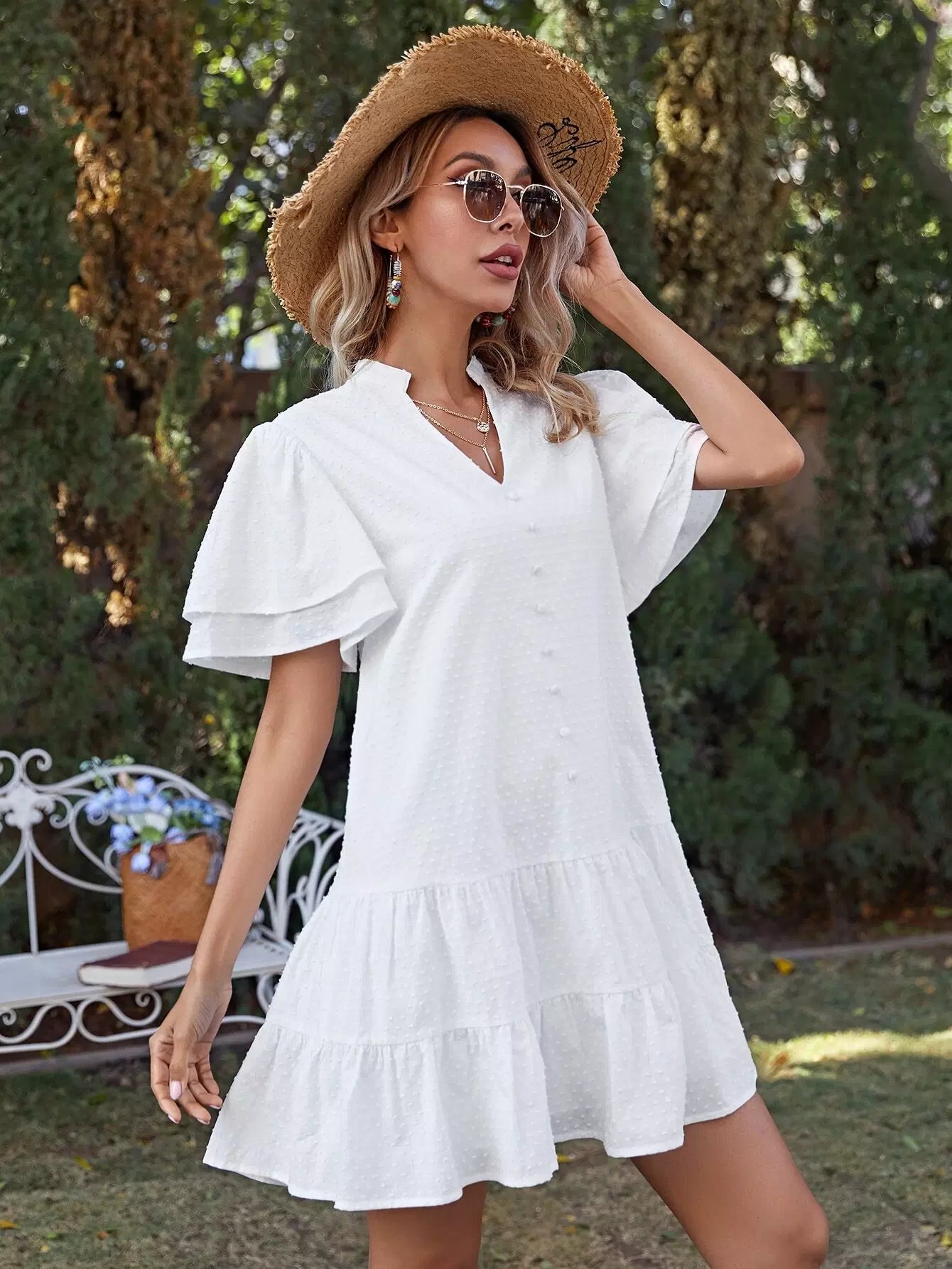 Women - Notch Neck Butterfly Sleeve Swiss Dot Smock Dress