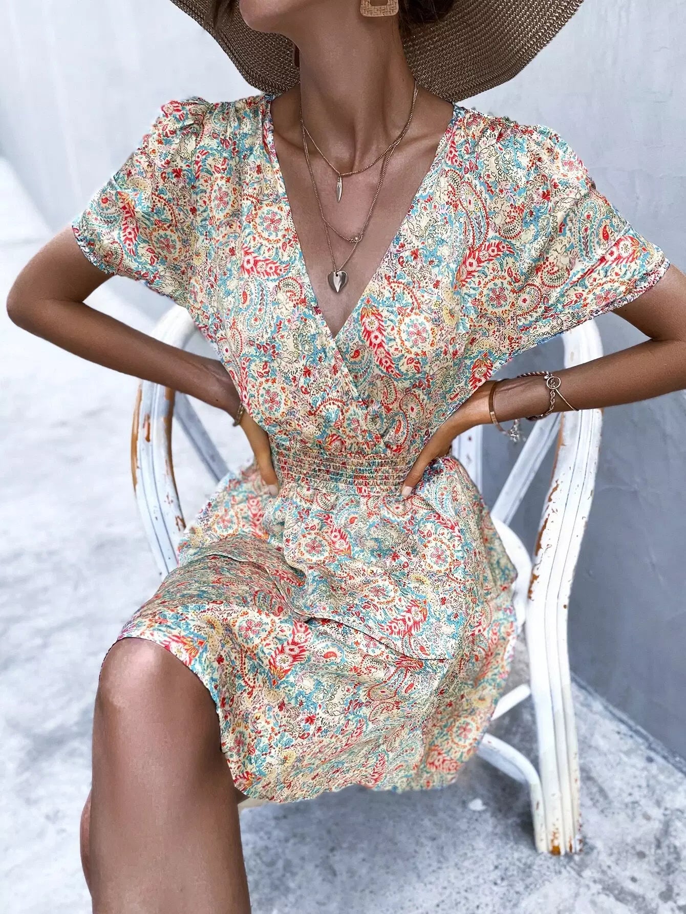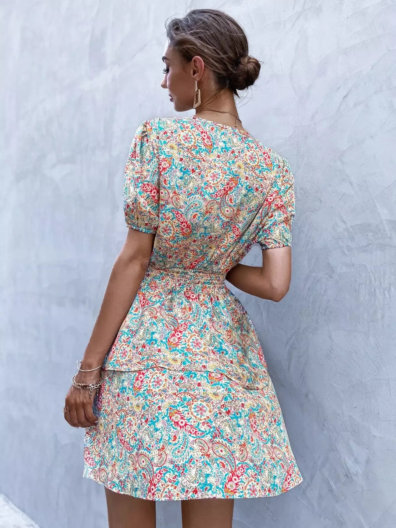 Paisley Print Surplice Neck Layered Hem A-line Dress