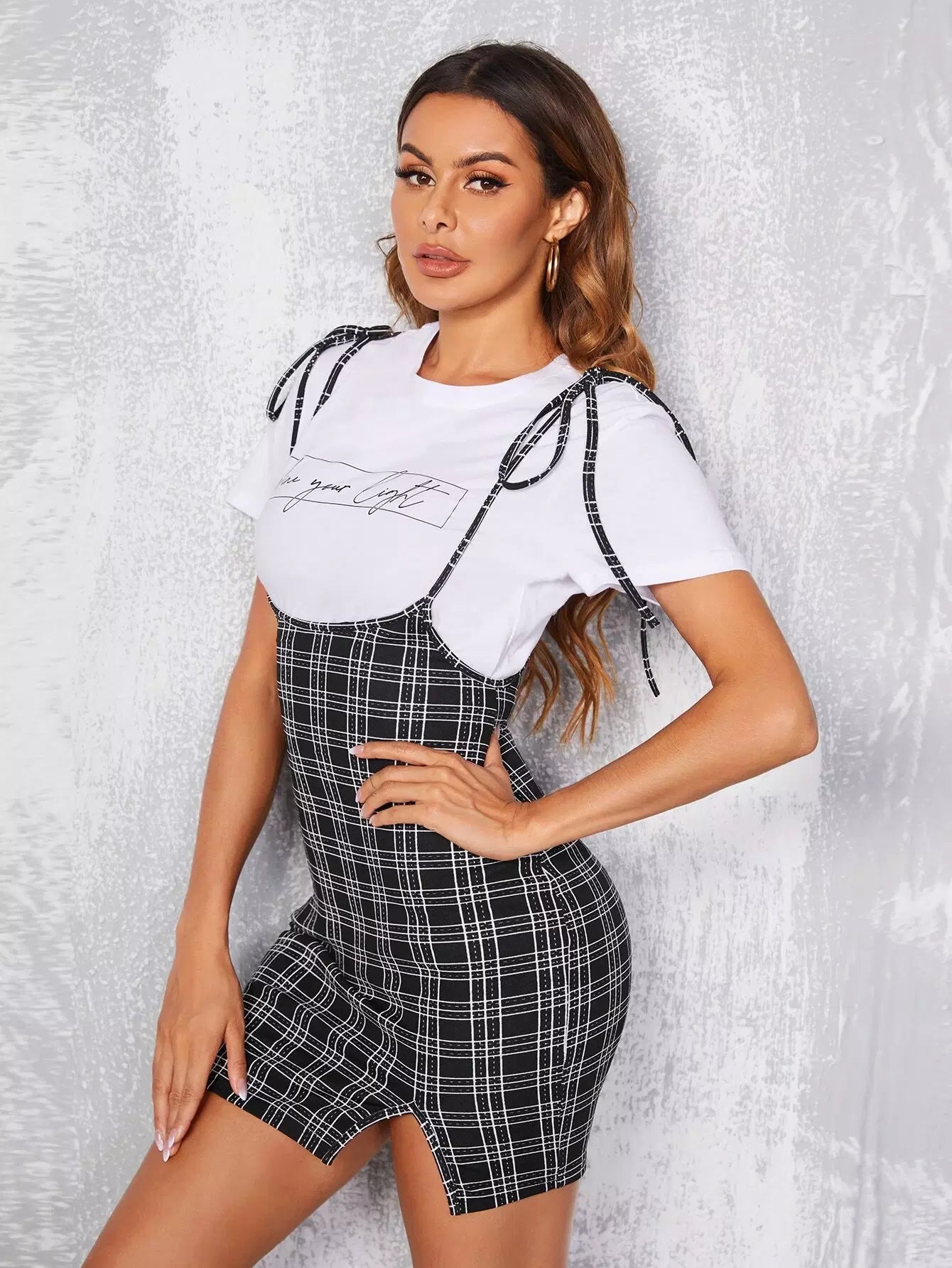 Plaid Tie Shoulder Slit Hem Suspender Dress Without Tee