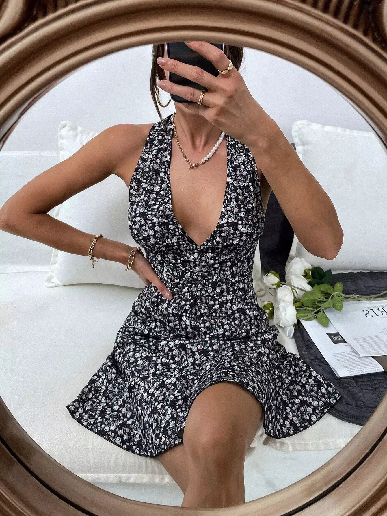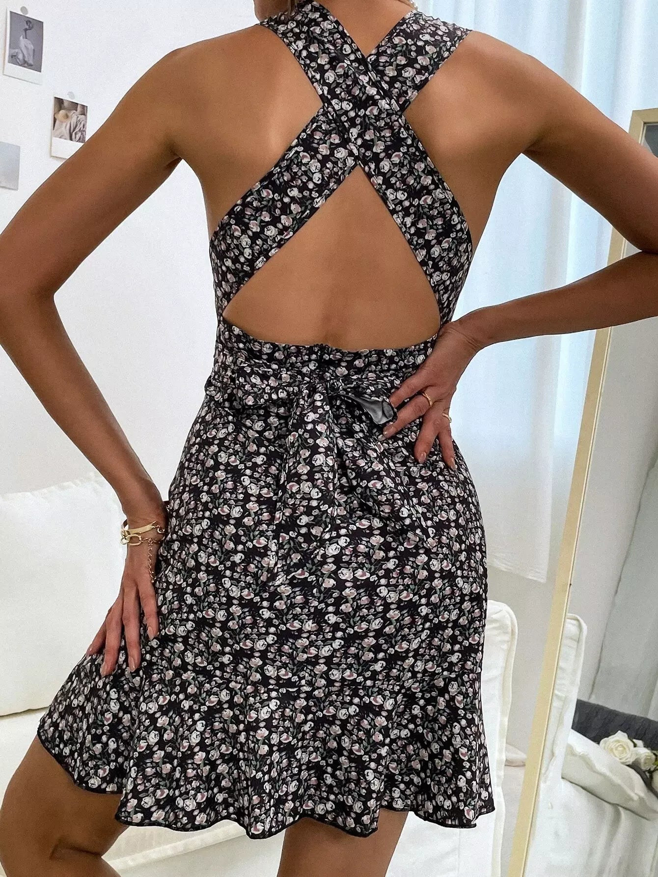 Plunging Neck Crisscross Tie Back Ditsy Floral Dress