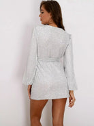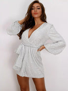 Plunging Neck Lantern Sleeve Sequin Dress Without Belt