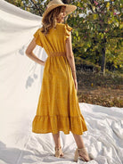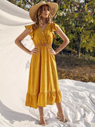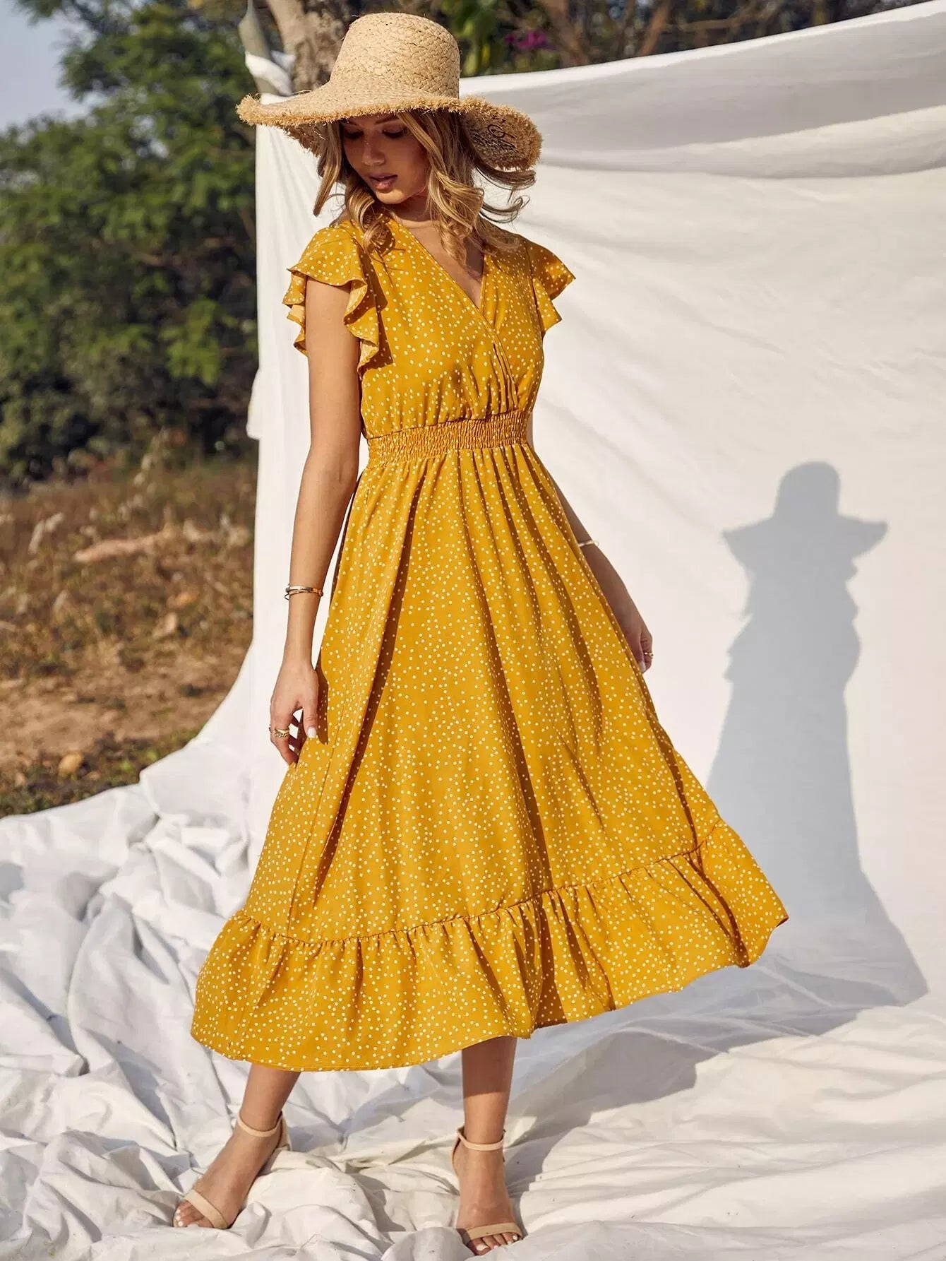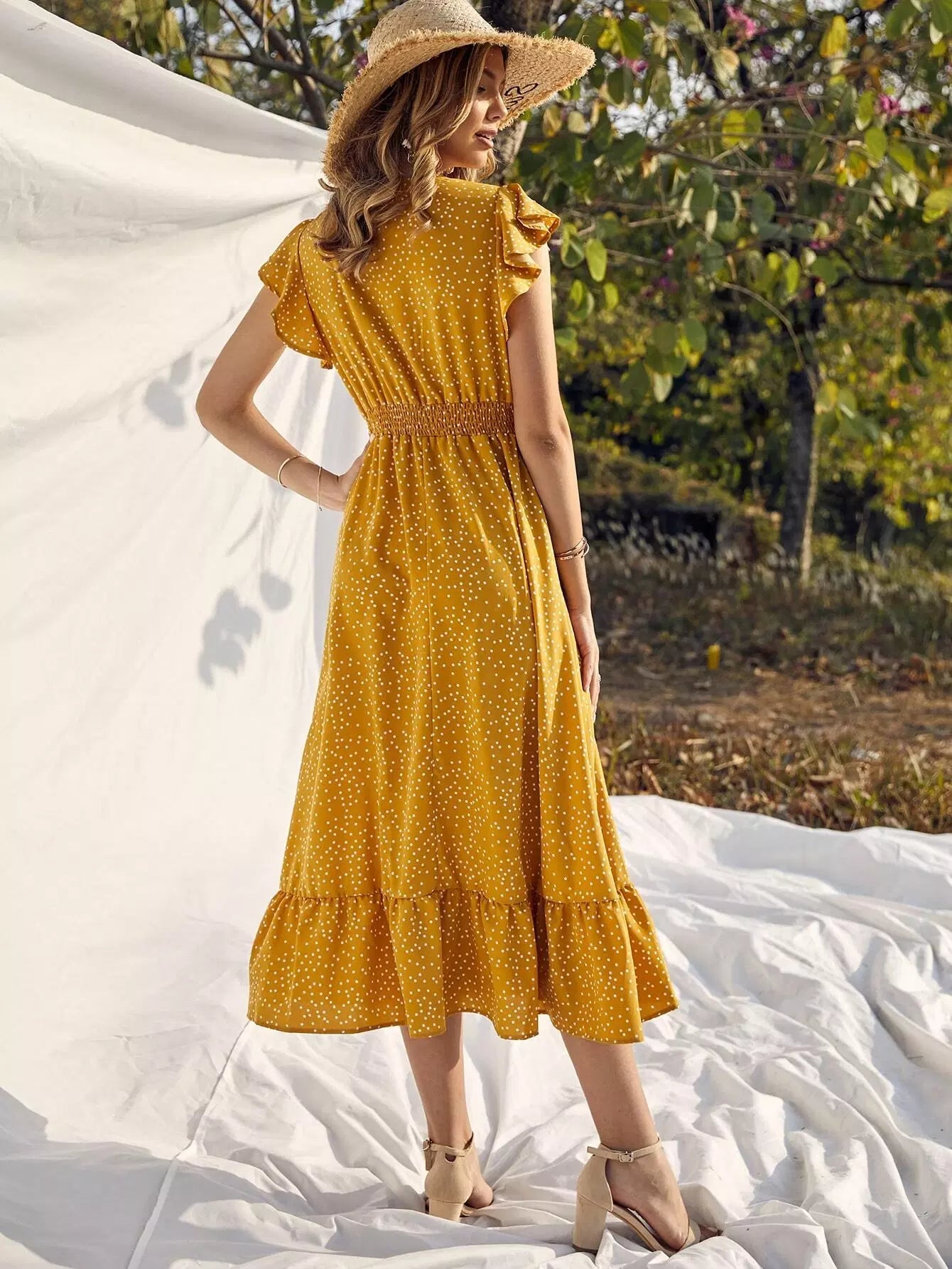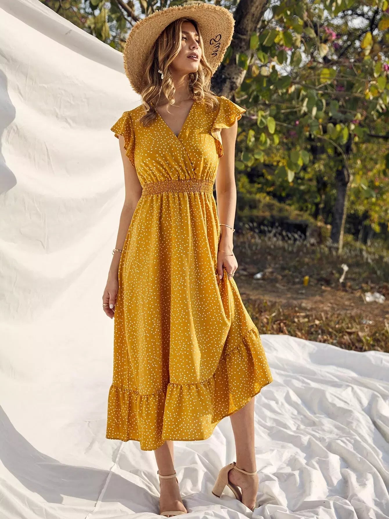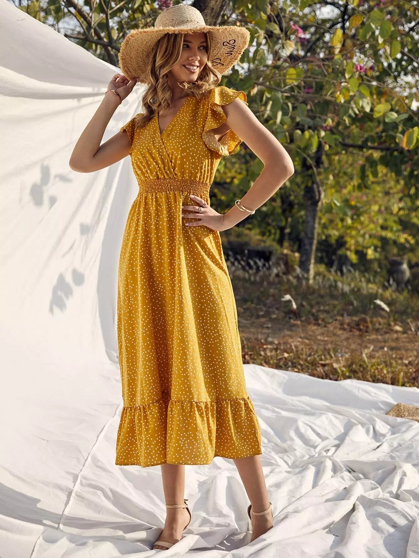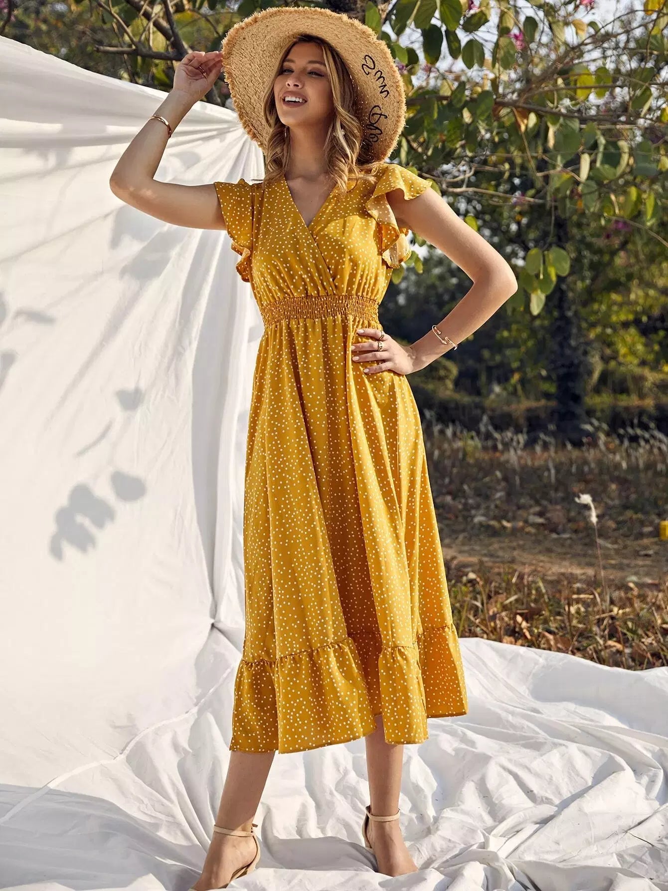 Polka Dot Surplice Front Shirred Ruffle Hem Dress