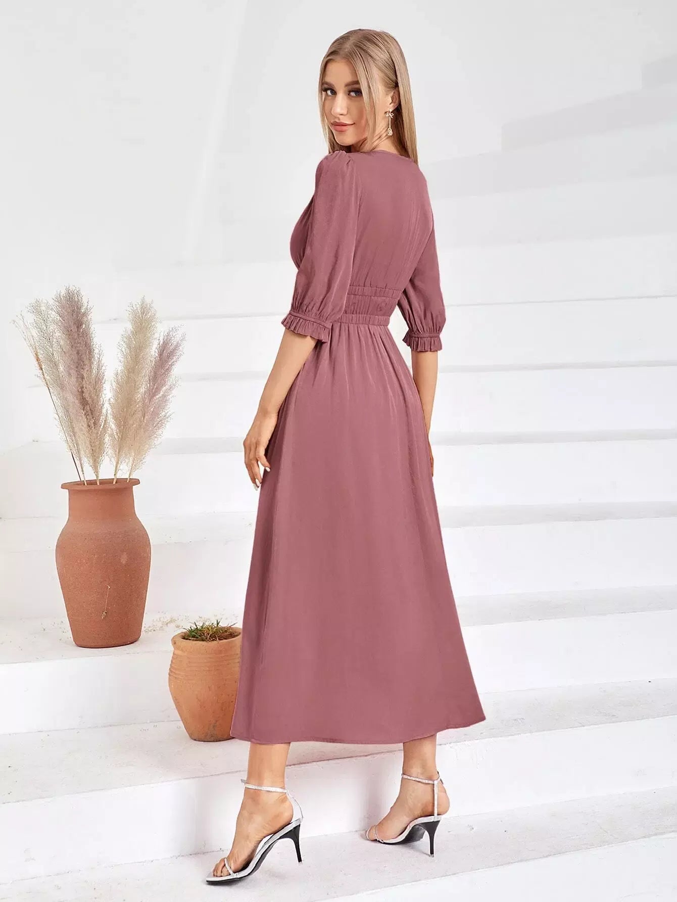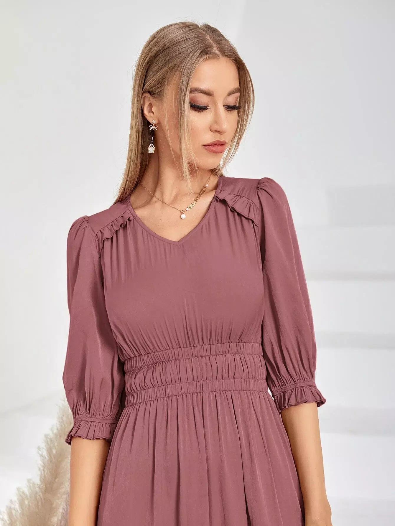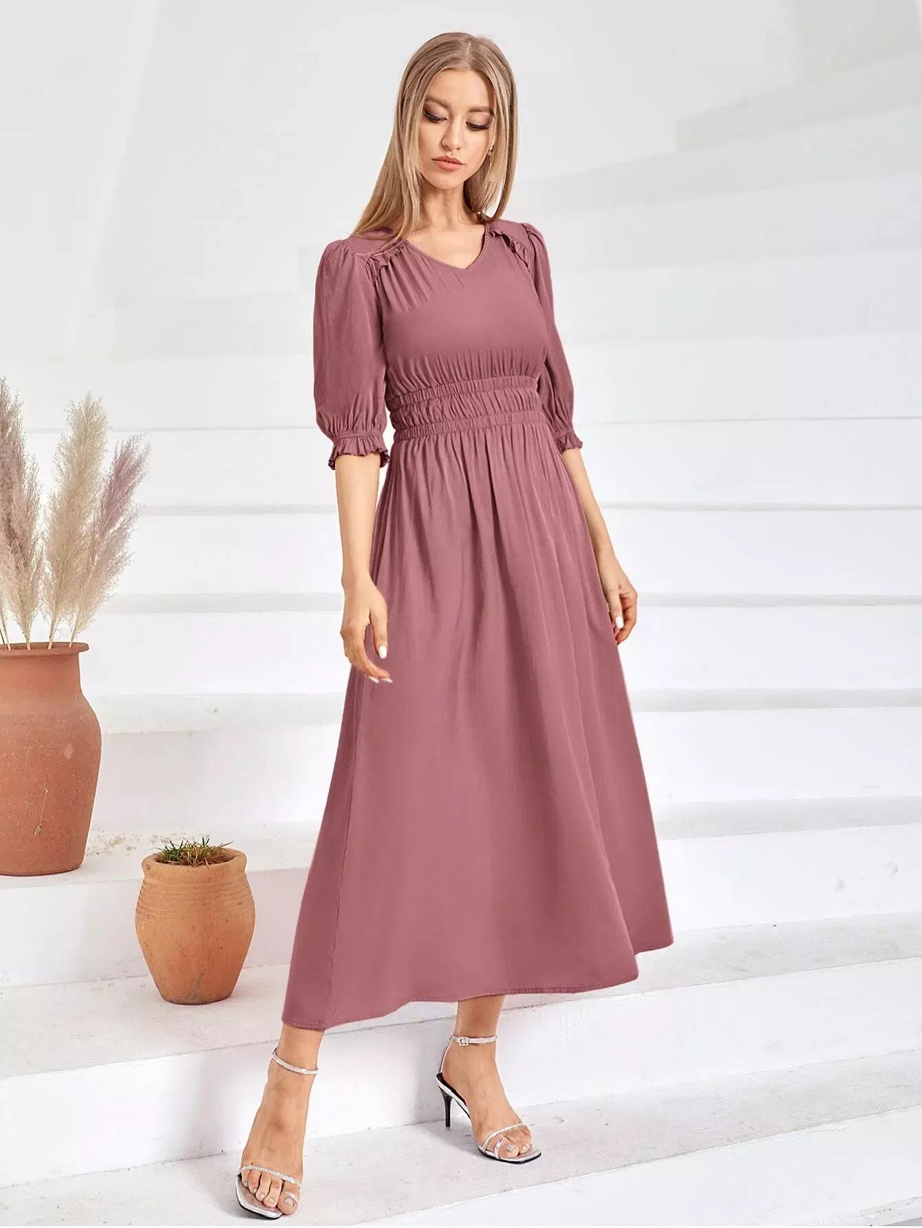 Puff Sleeve Shirred A-line Dress