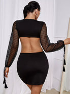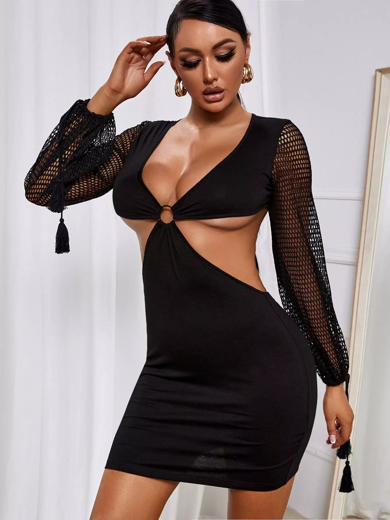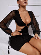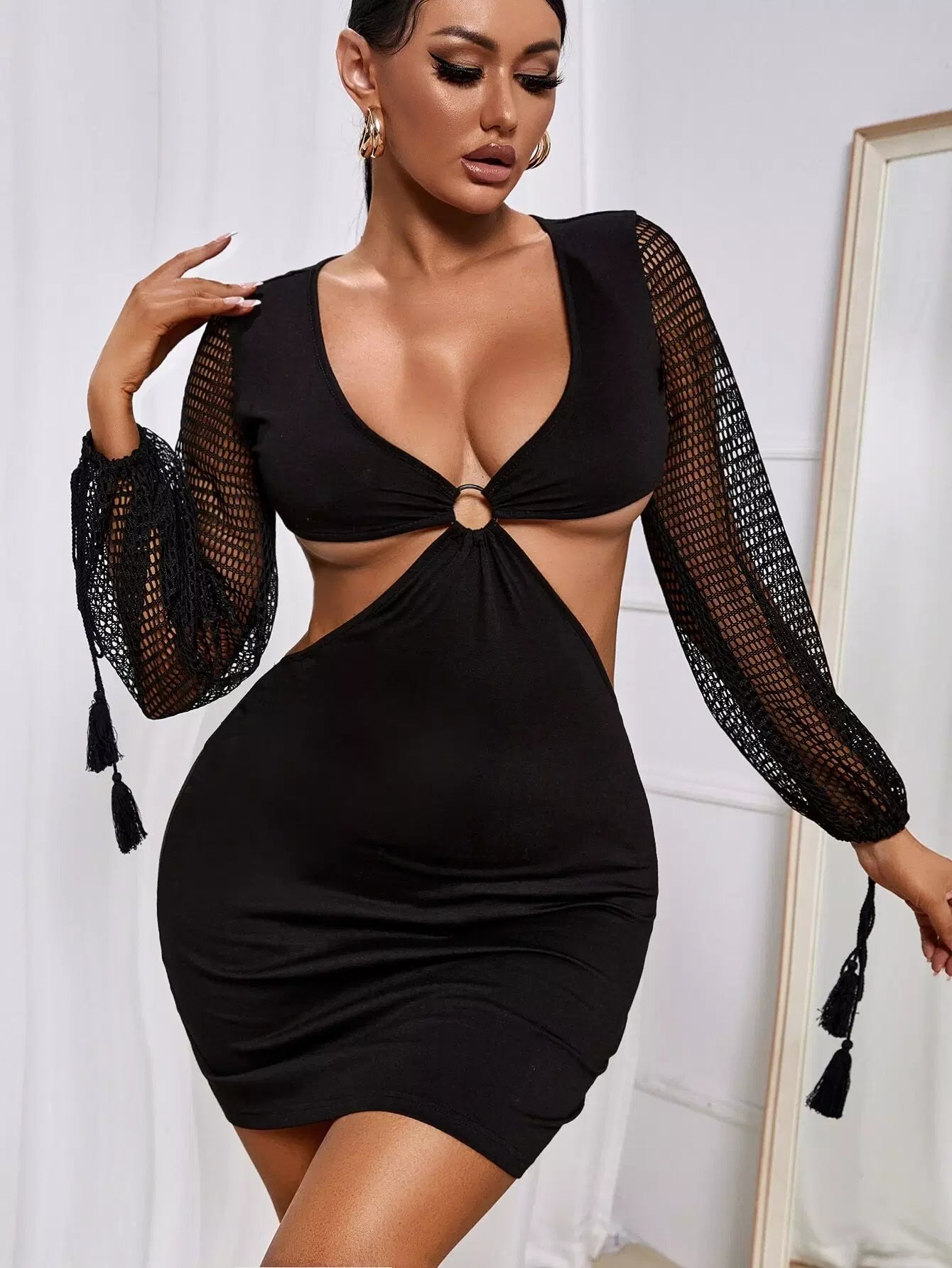 Ring And Tassel Detail Lantern Sleeve Cut Out Bodycon Dress