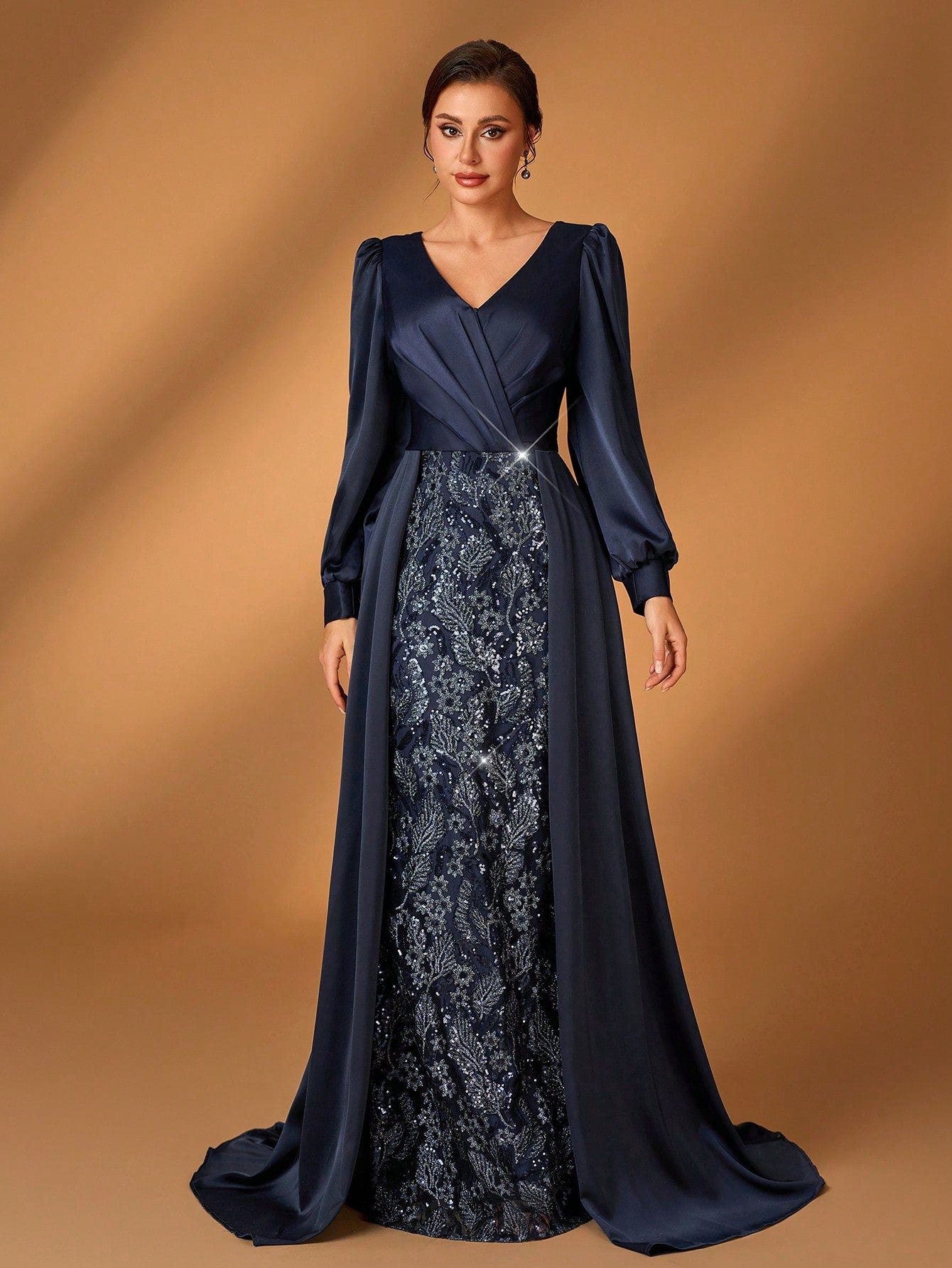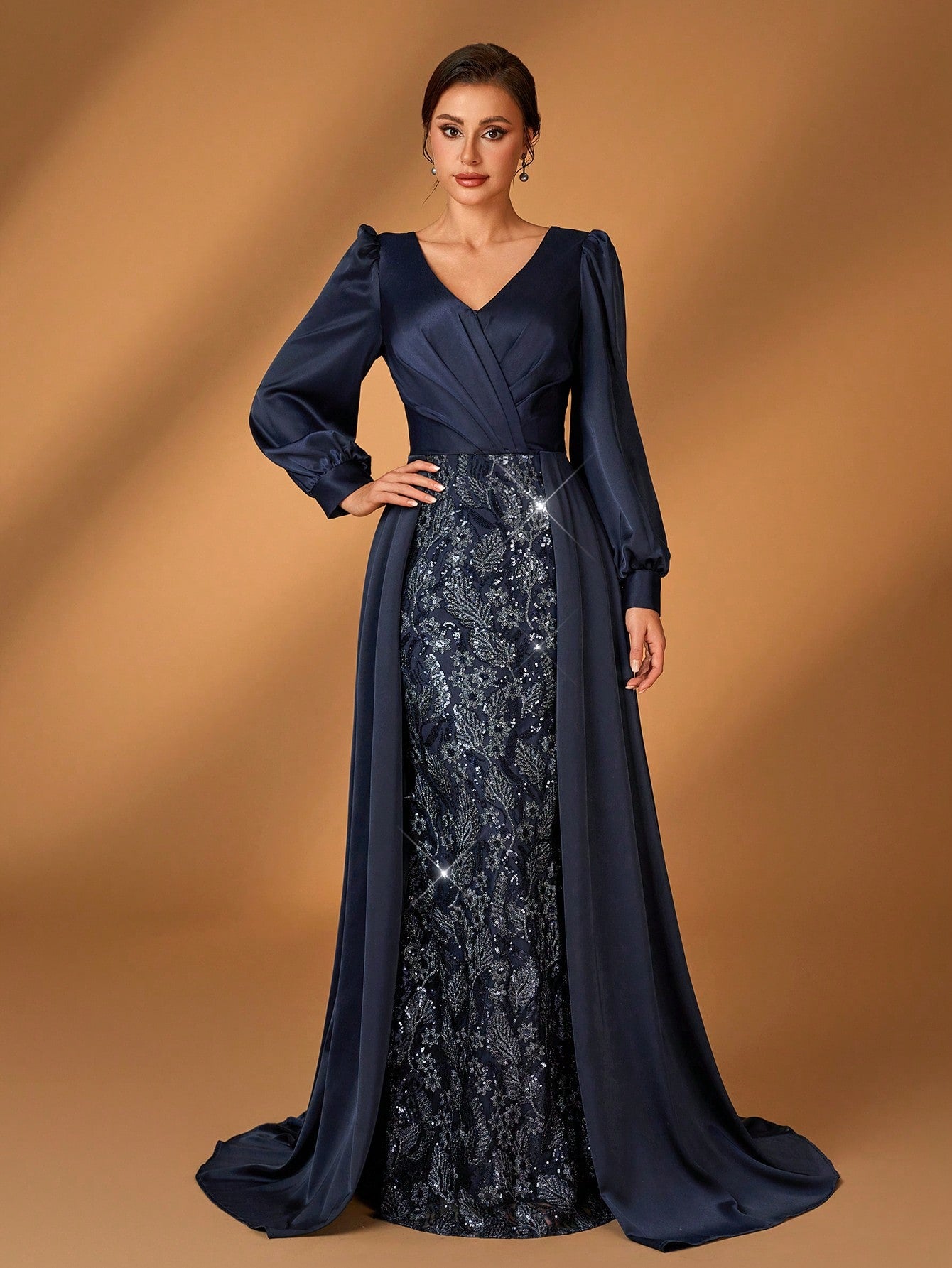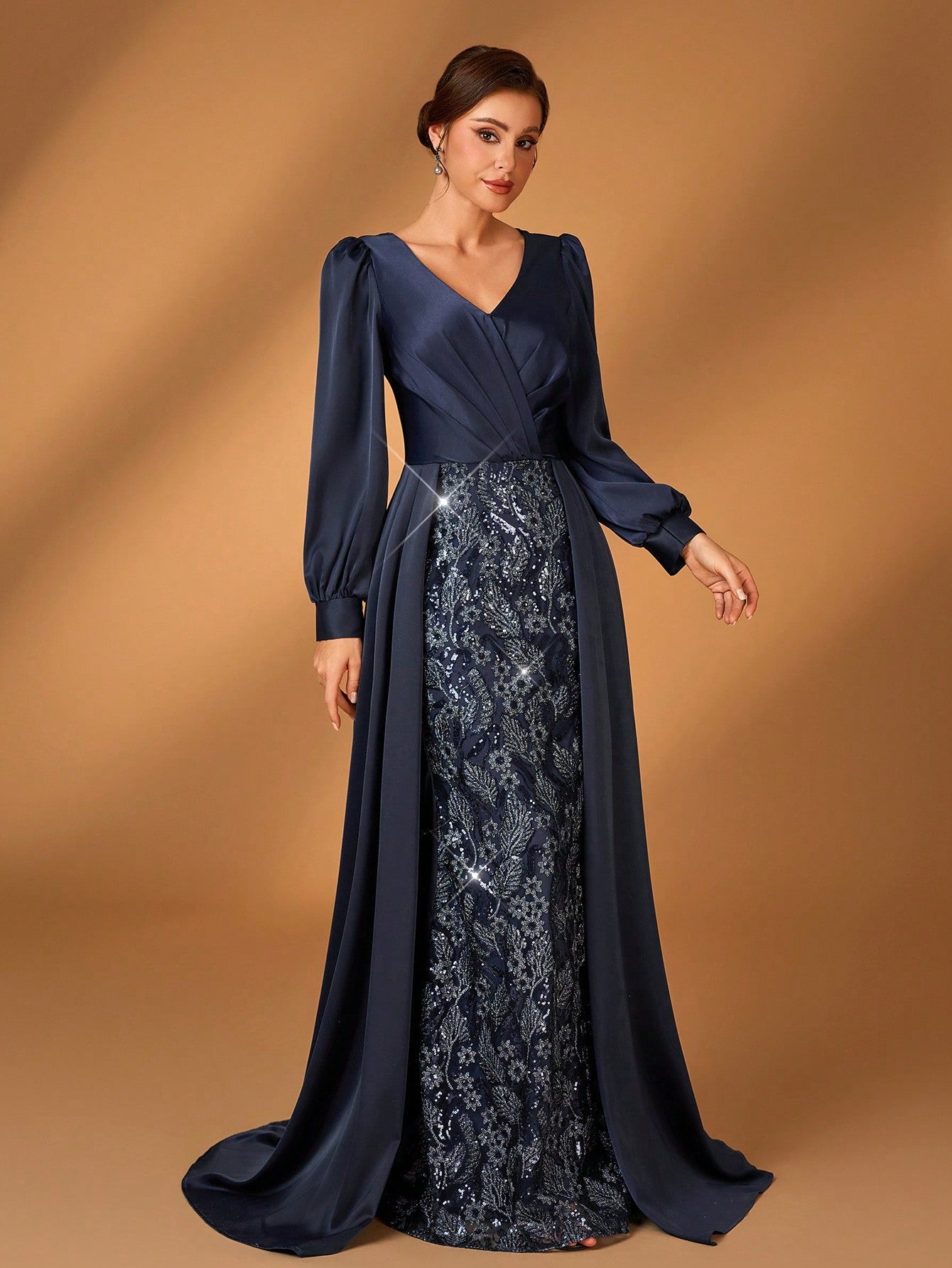 Serin Elegant And Gorgeous Dark Blue Sequin Embroidery Stitching Satin Overlapping Pleated V-Neck Long