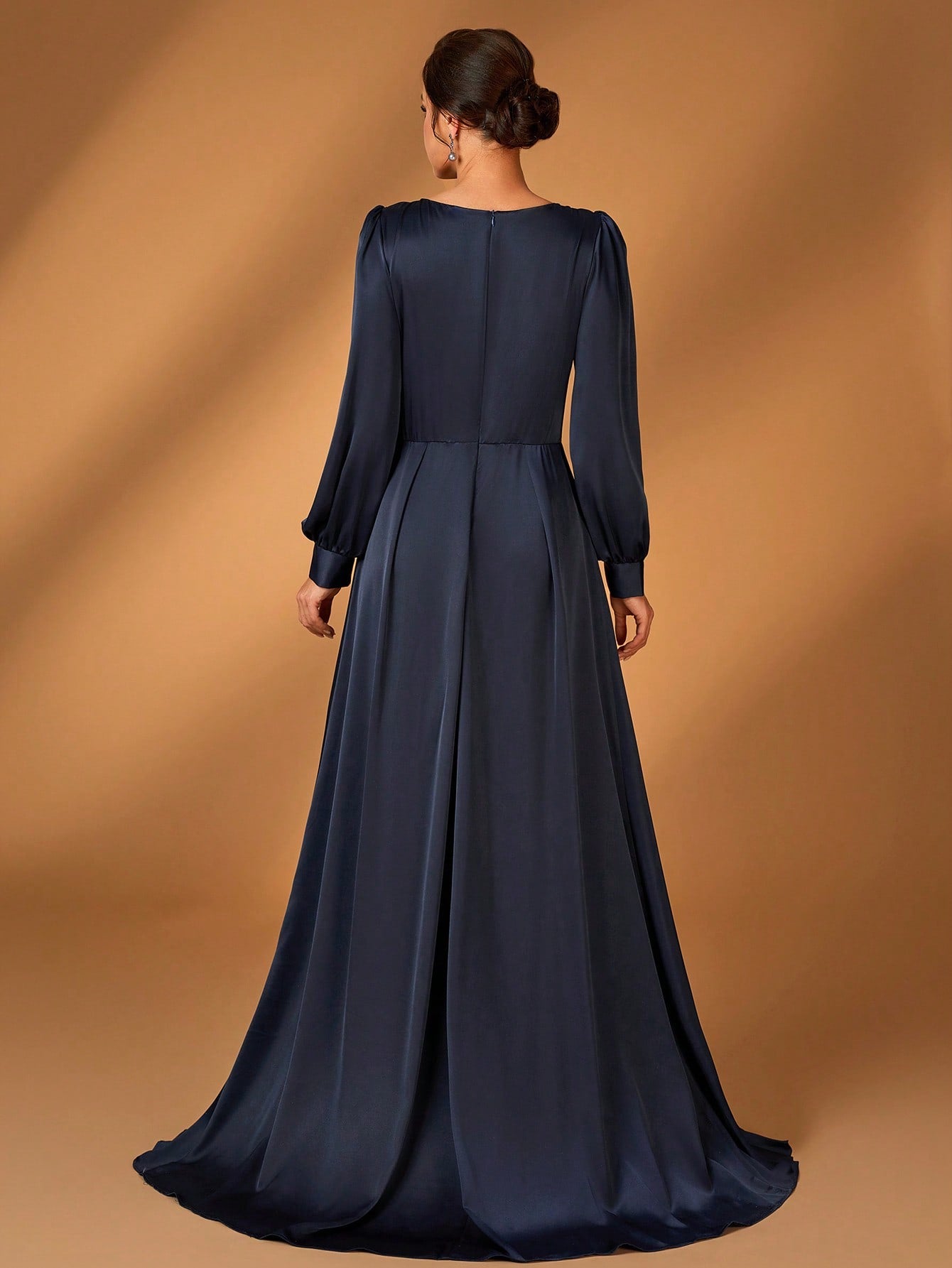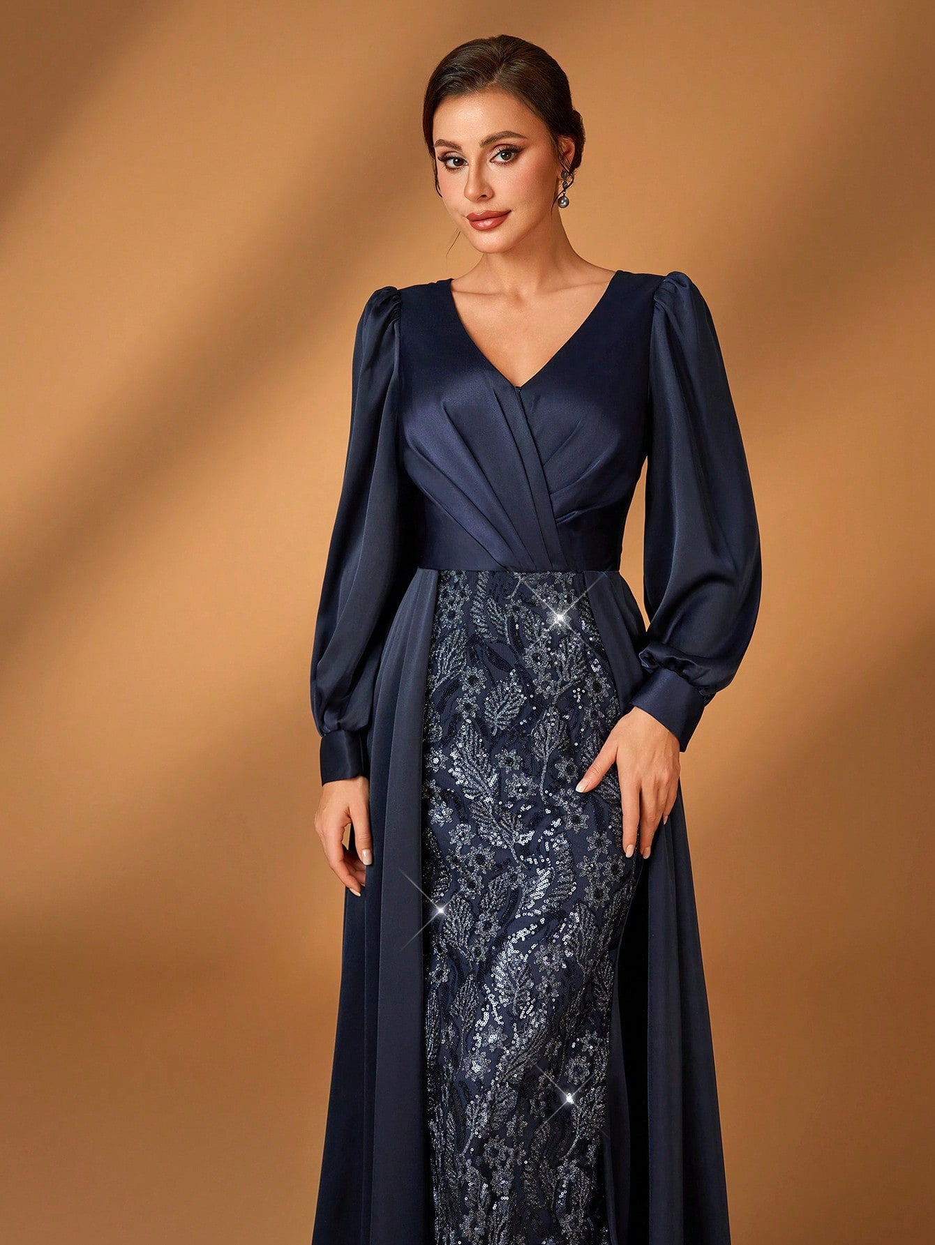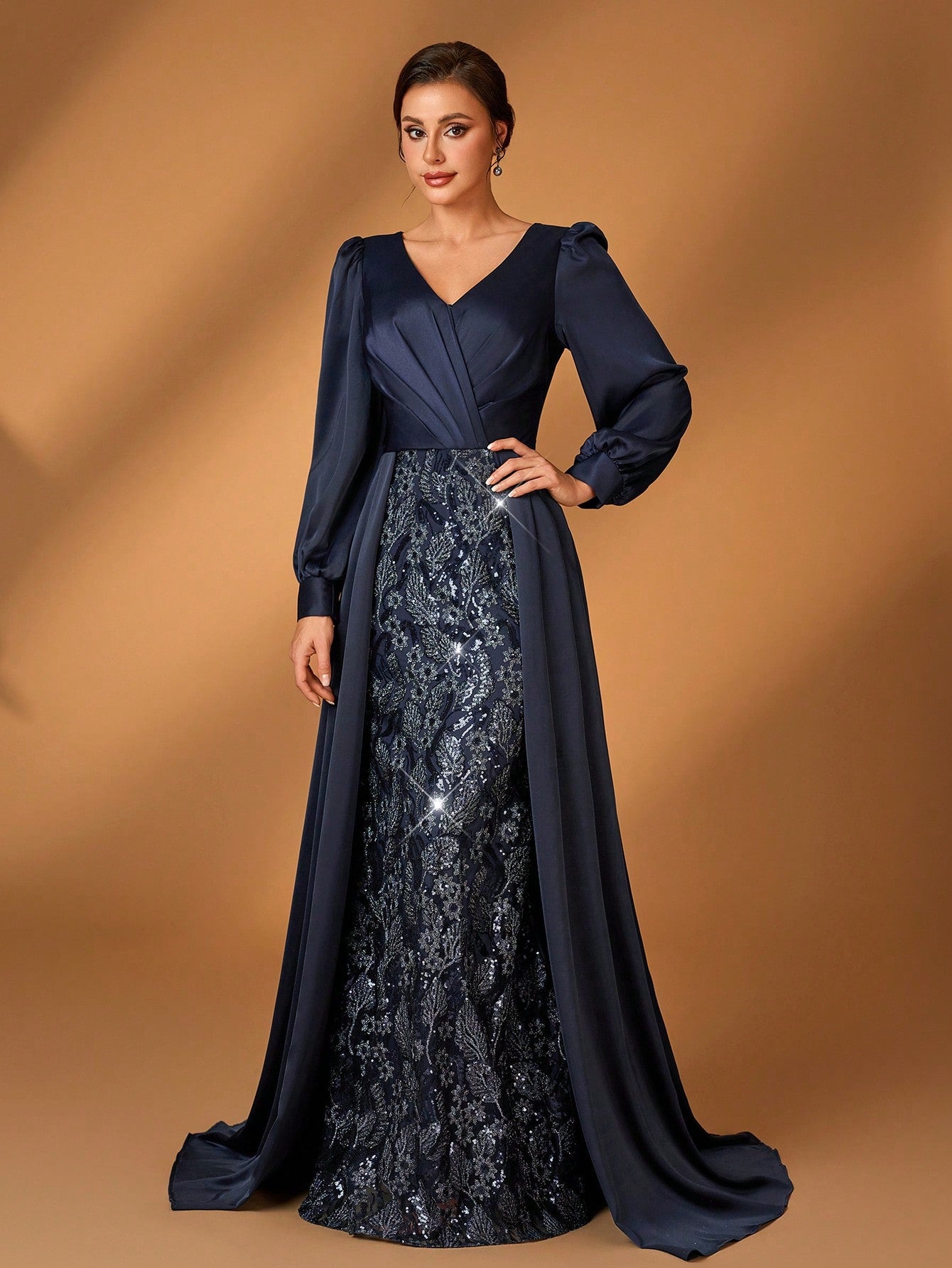 Serin Elegant And Gorgeous Dark Blue Sequin Embroidery Stitching Satin Overlapping Pleated V-Neck Long