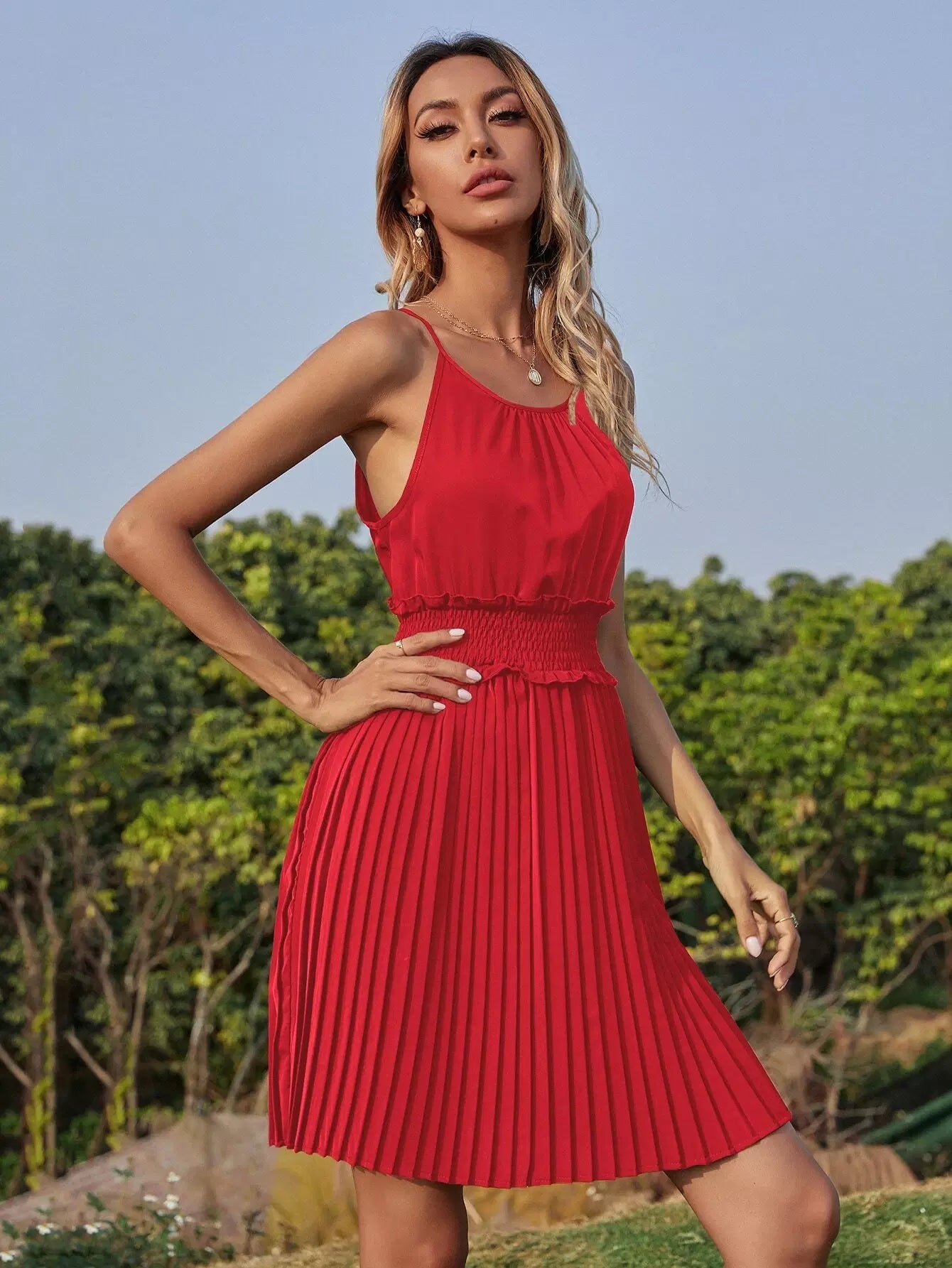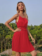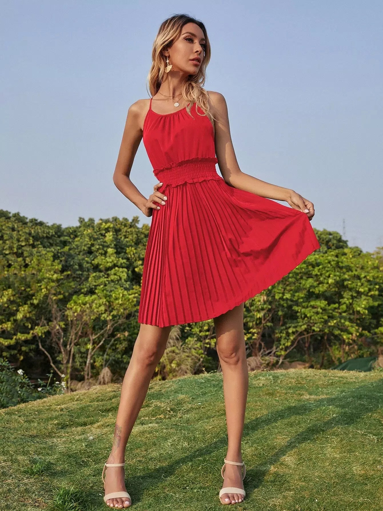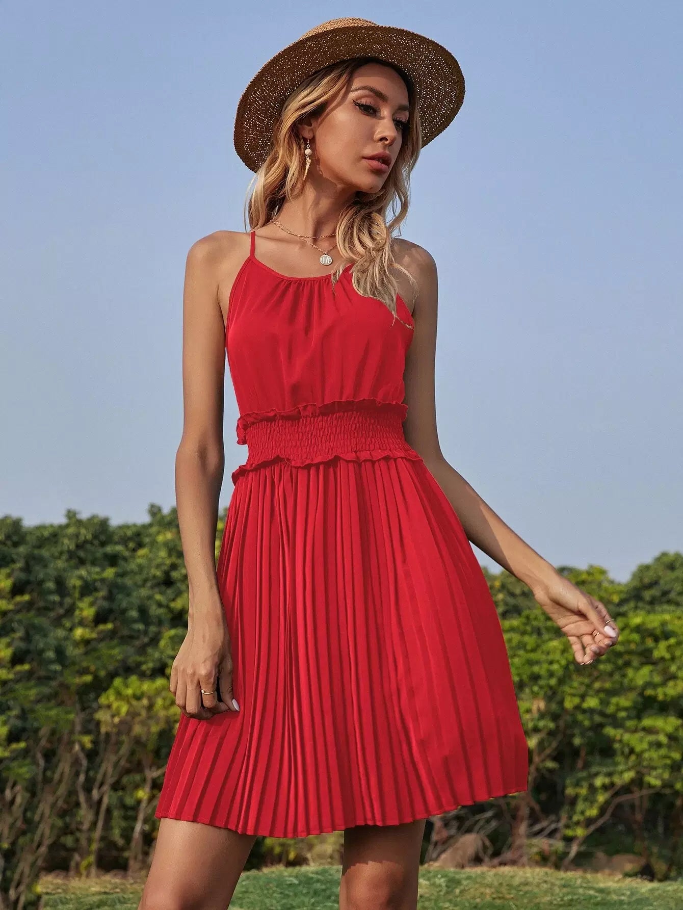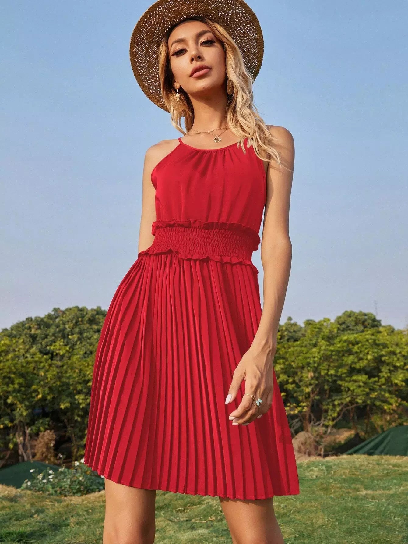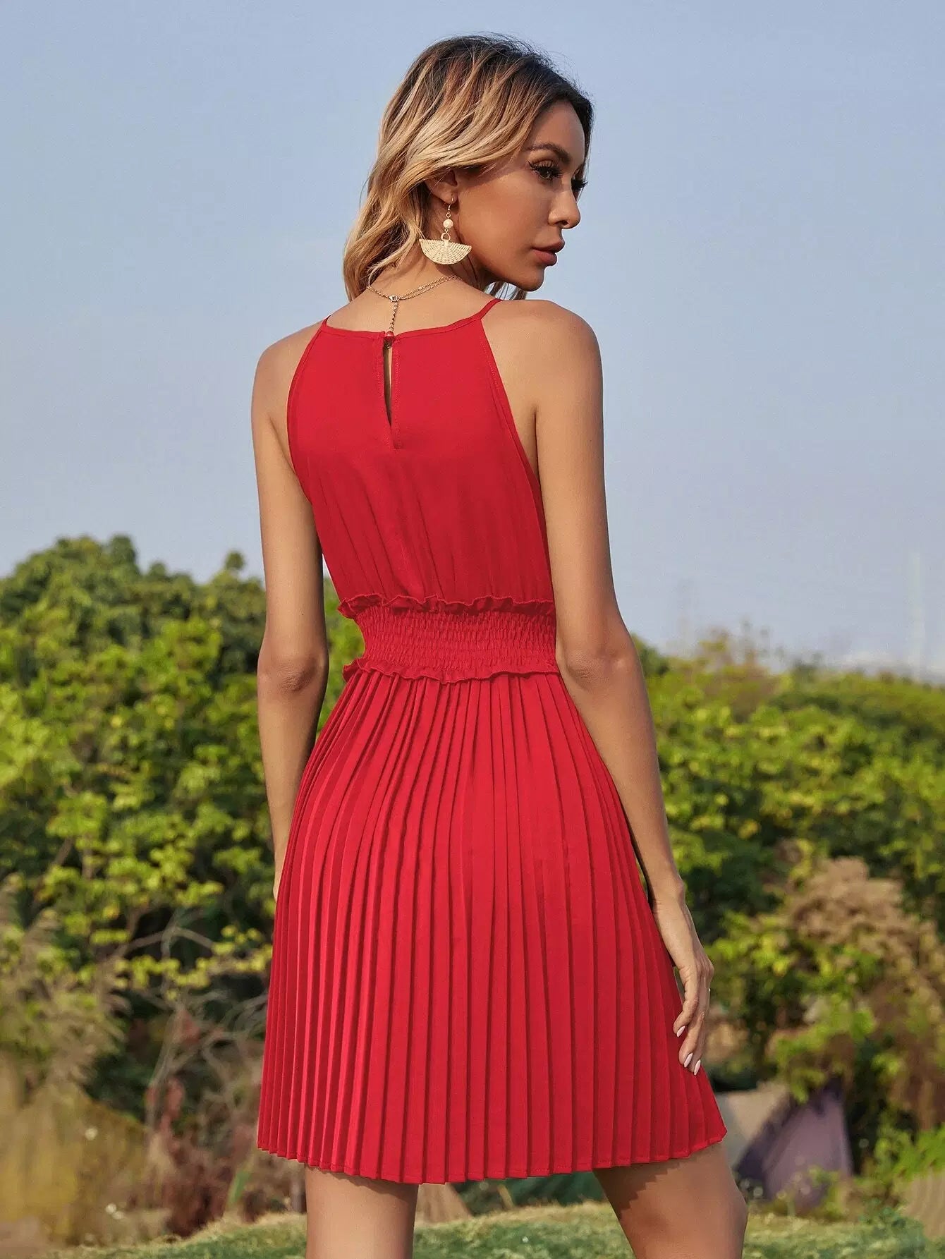 Shirred Waist Pleated Hem Halter Dress