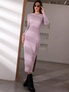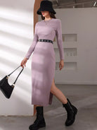 Solid Ribbed Knit Split Thigh Dress Without Belt