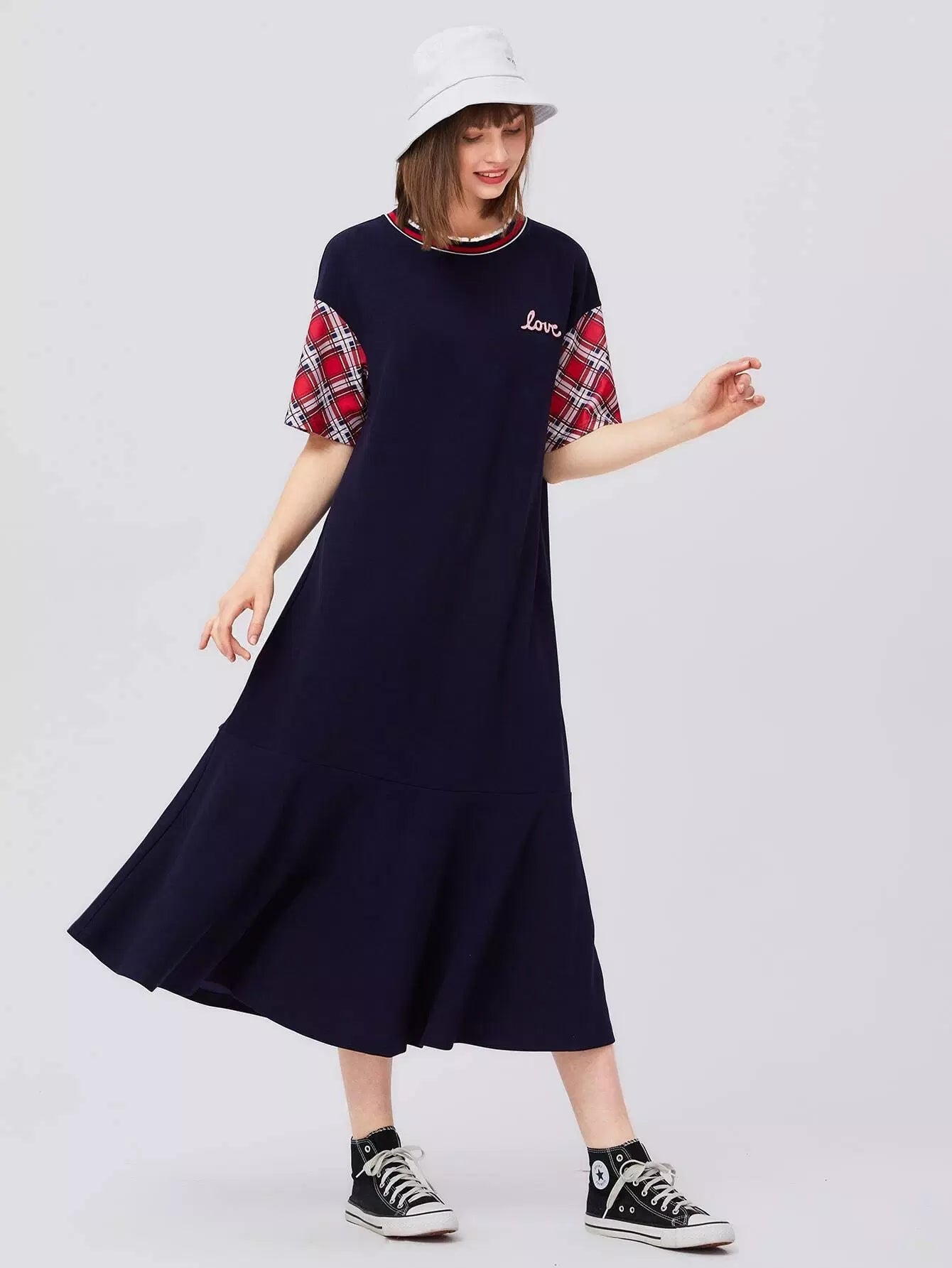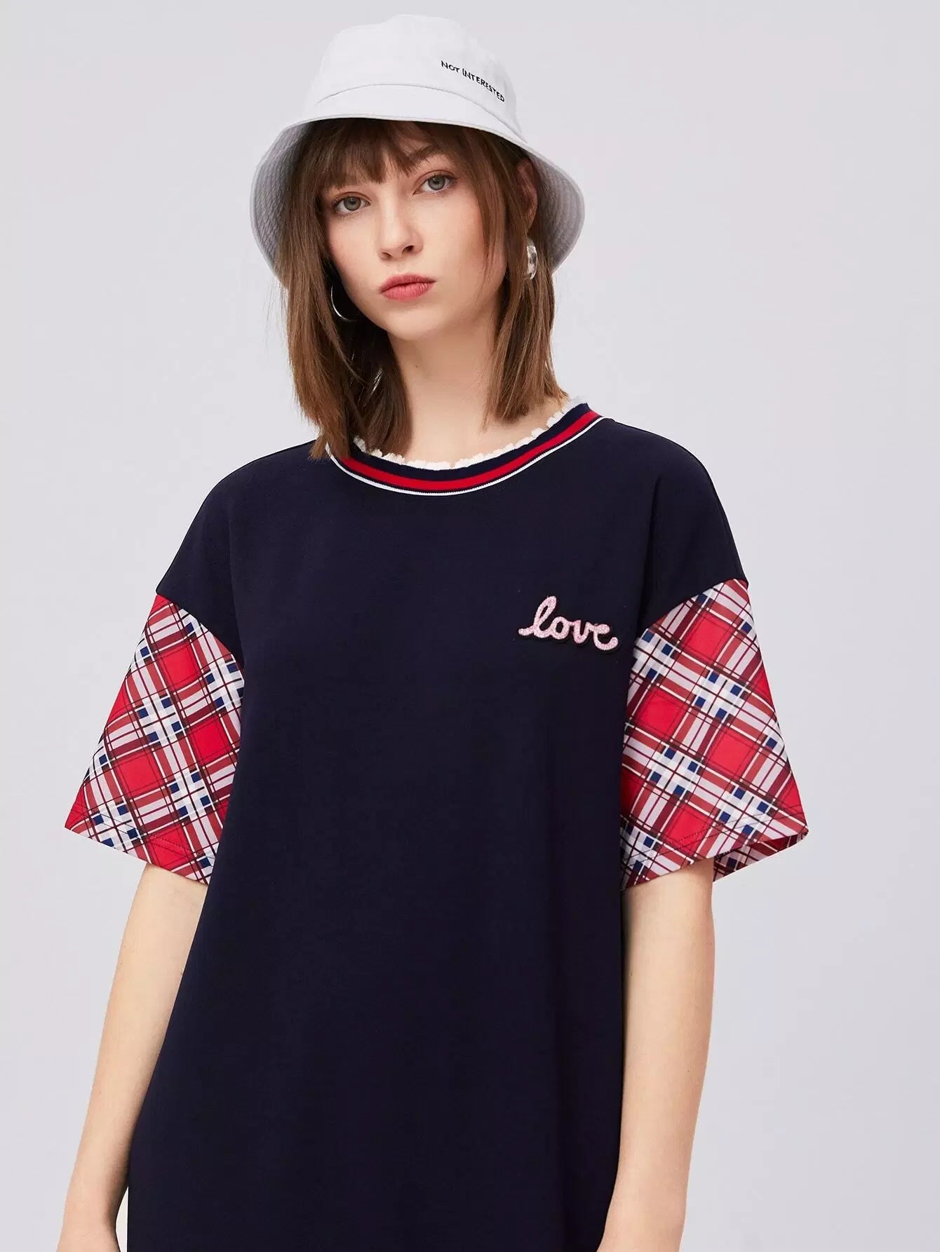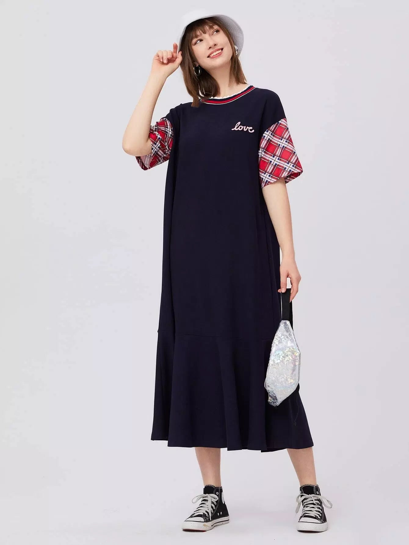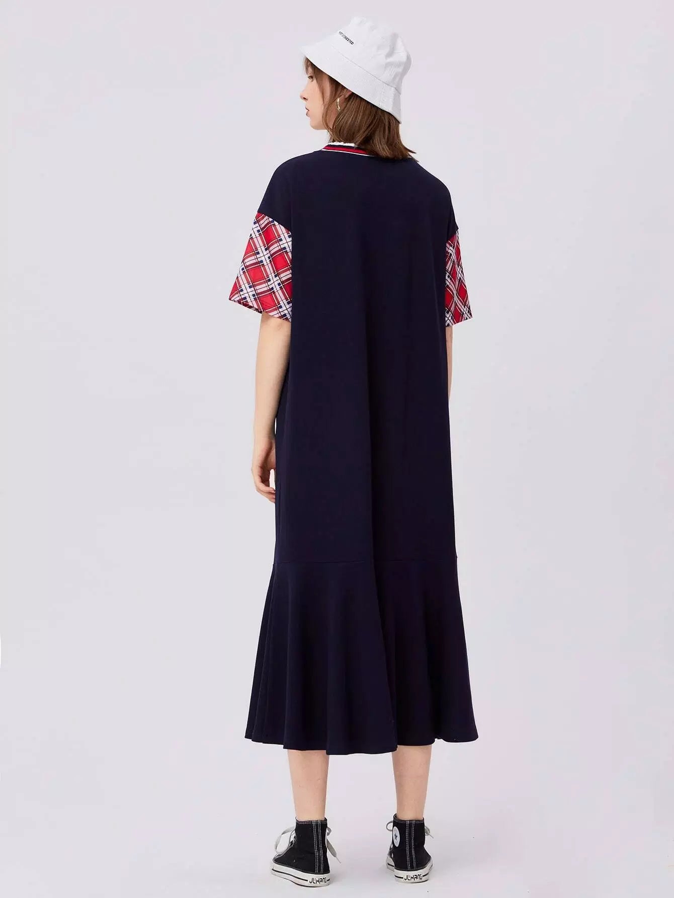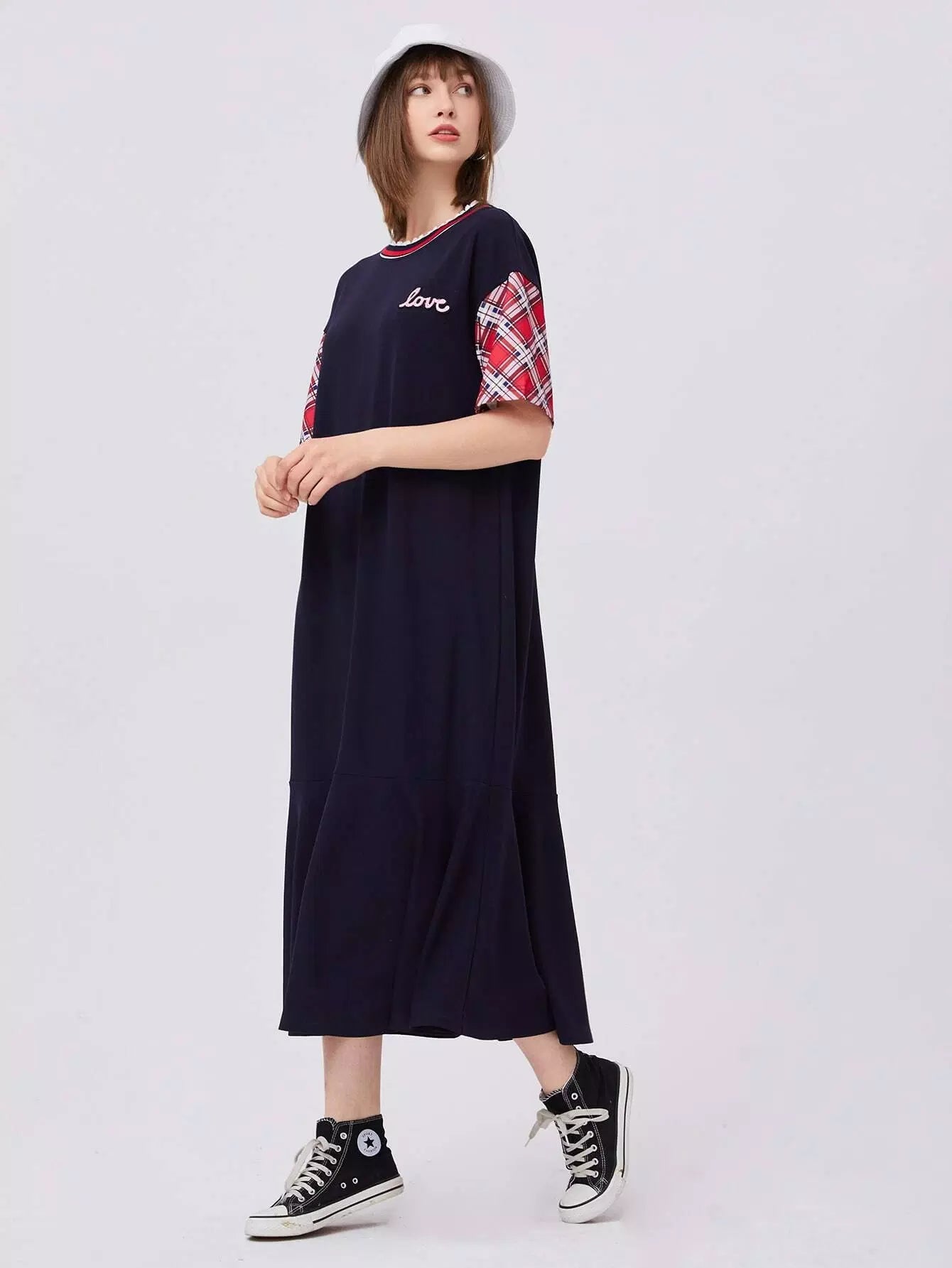 Striped Neck Letter Patched Plaid Sleeve Dress