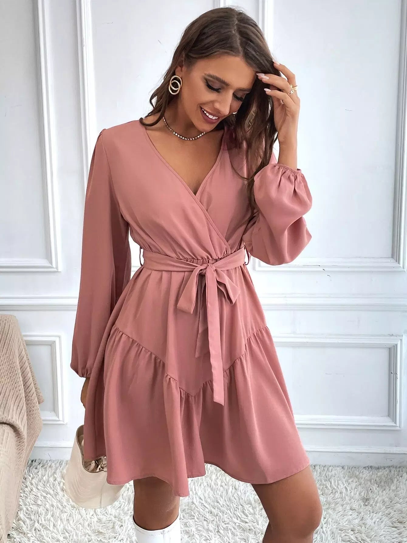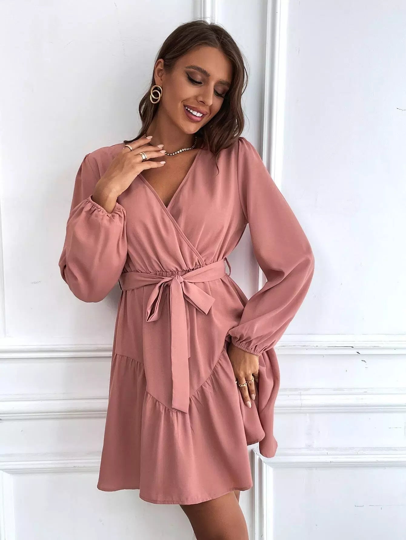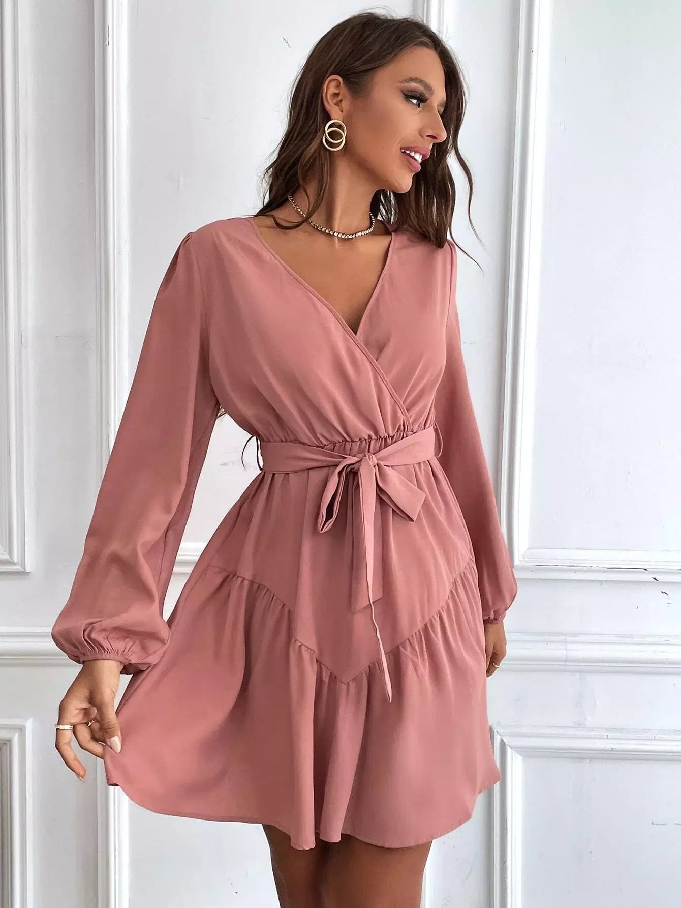 Surplice Neck Bishop Sleeve Ruffle Hem Dress Without Belt