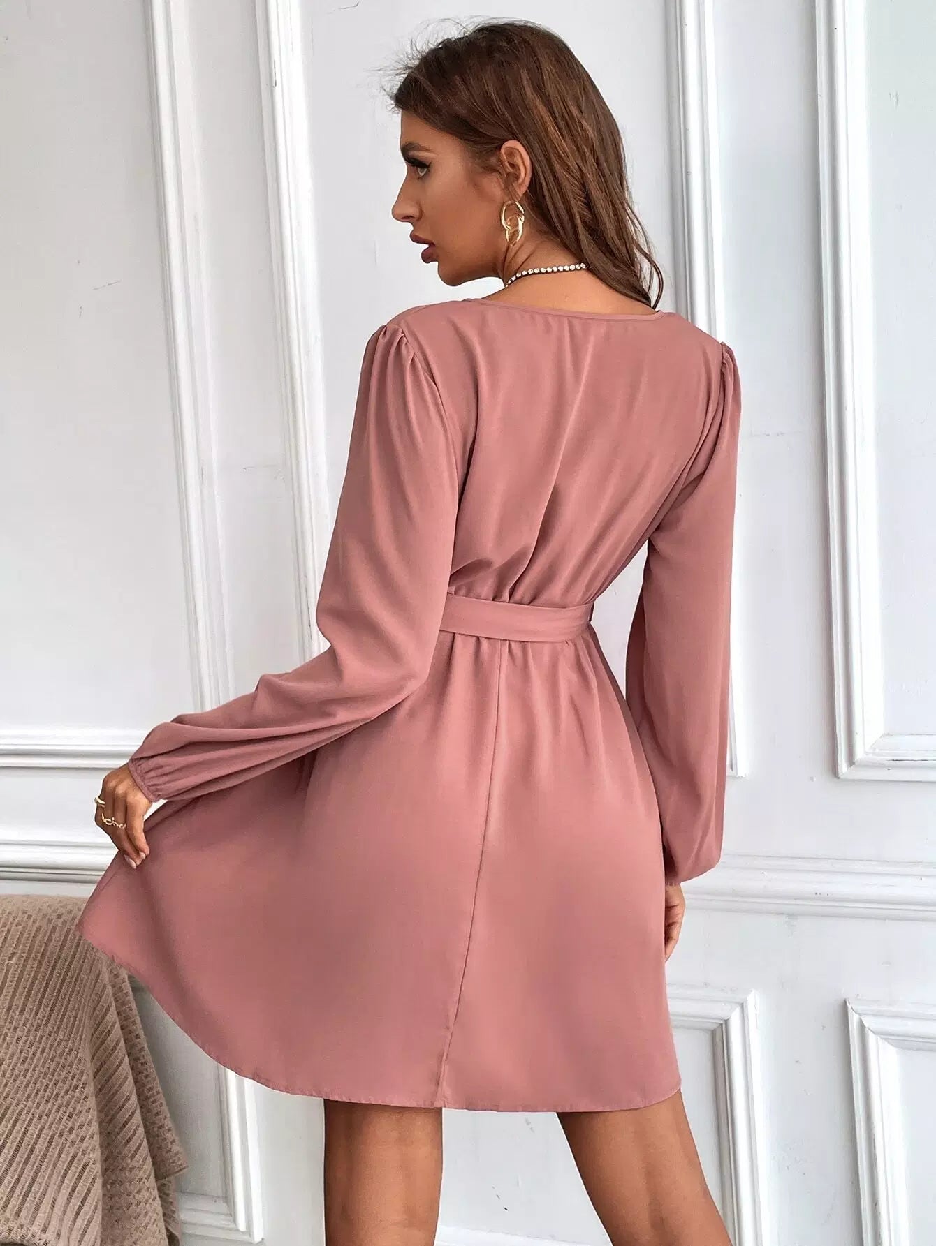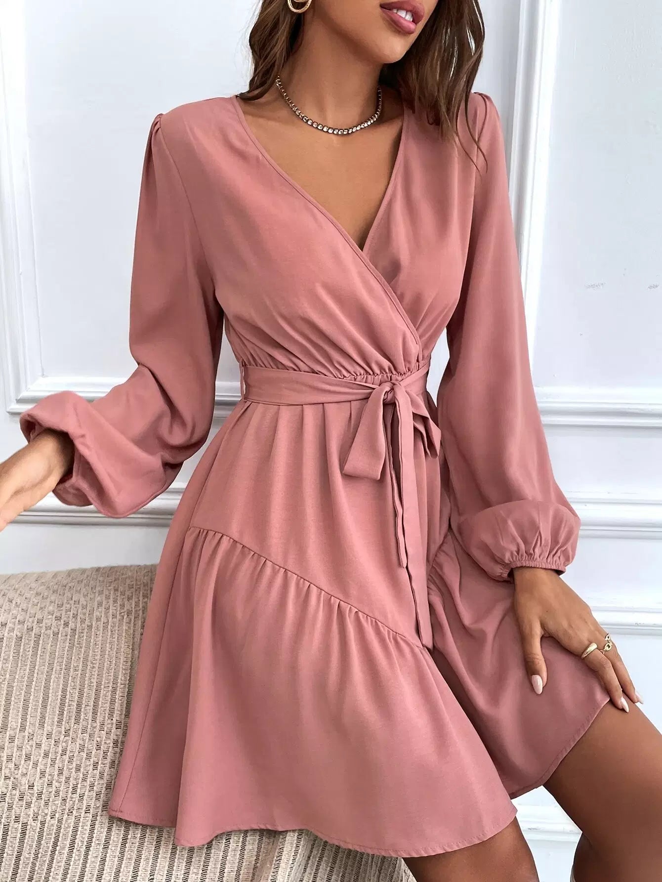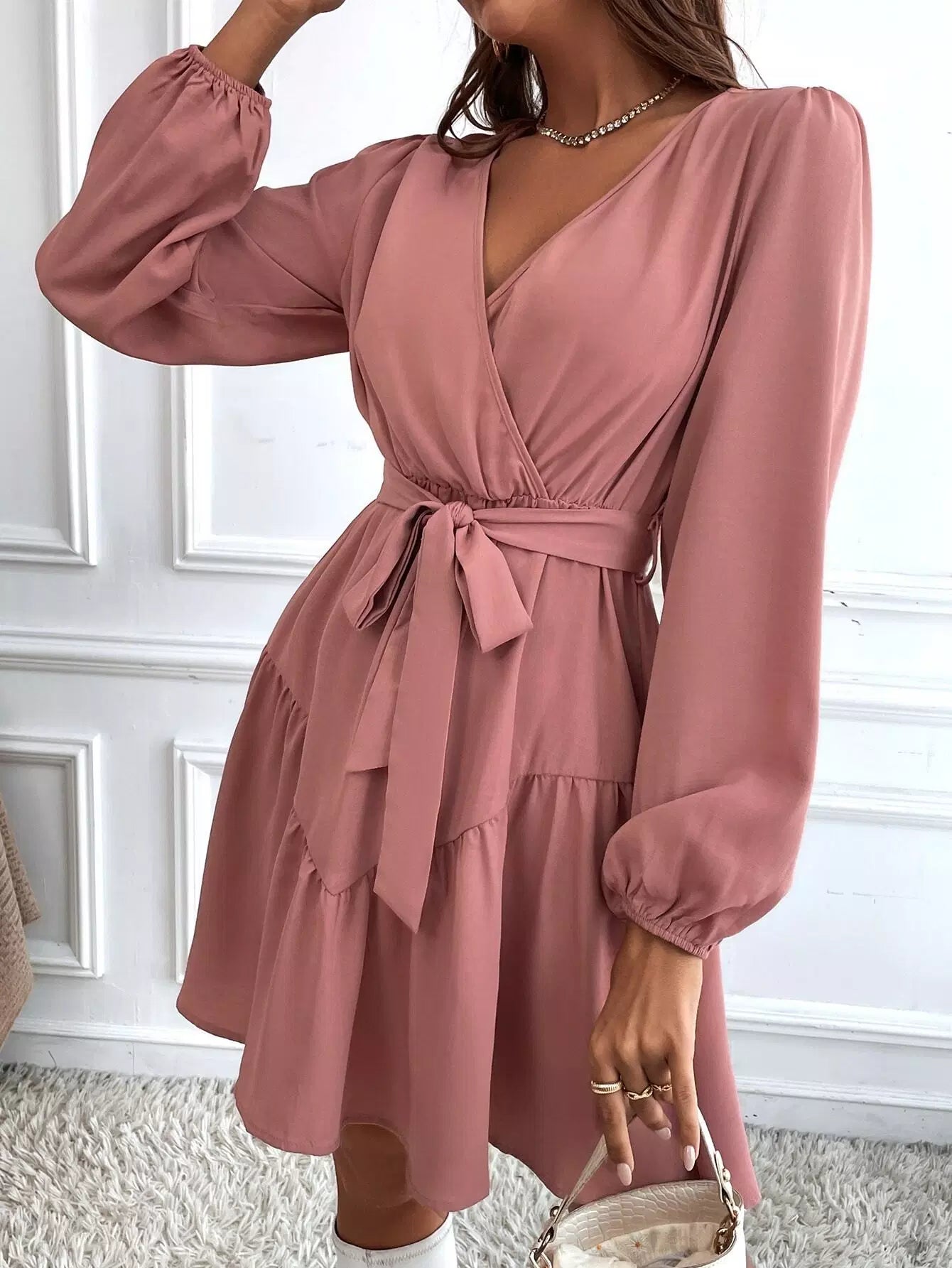 Surplice Neck Bishop Sleeve Ruffle Hem Dress Without Belt
