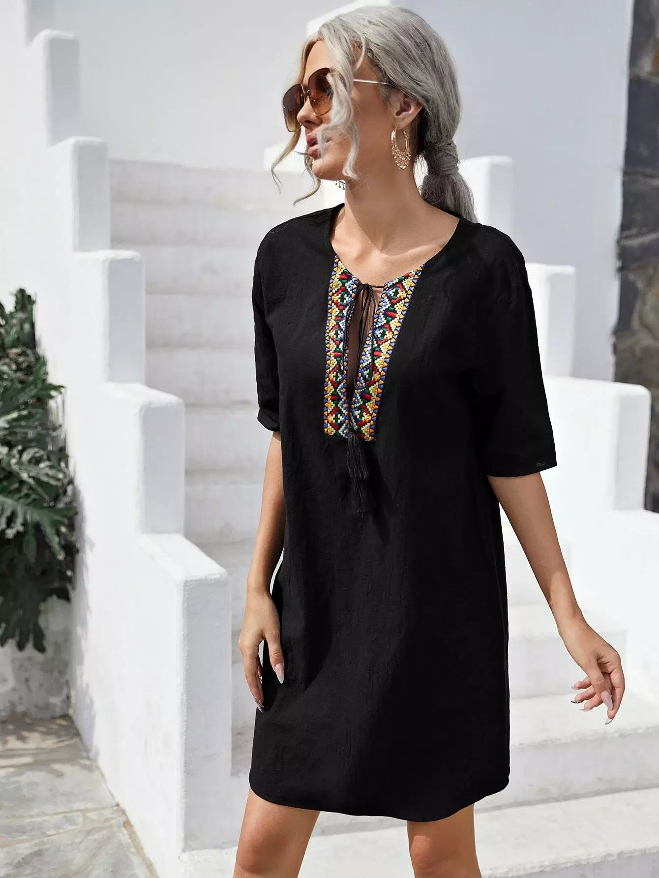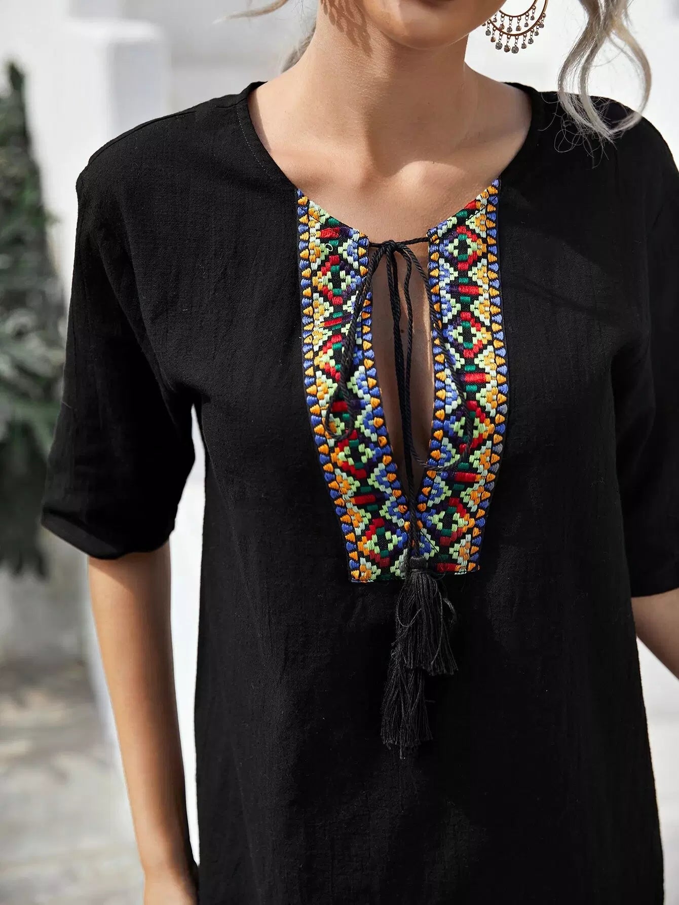 Tassel Tie Neck Embroidered Tape Detail Dress
