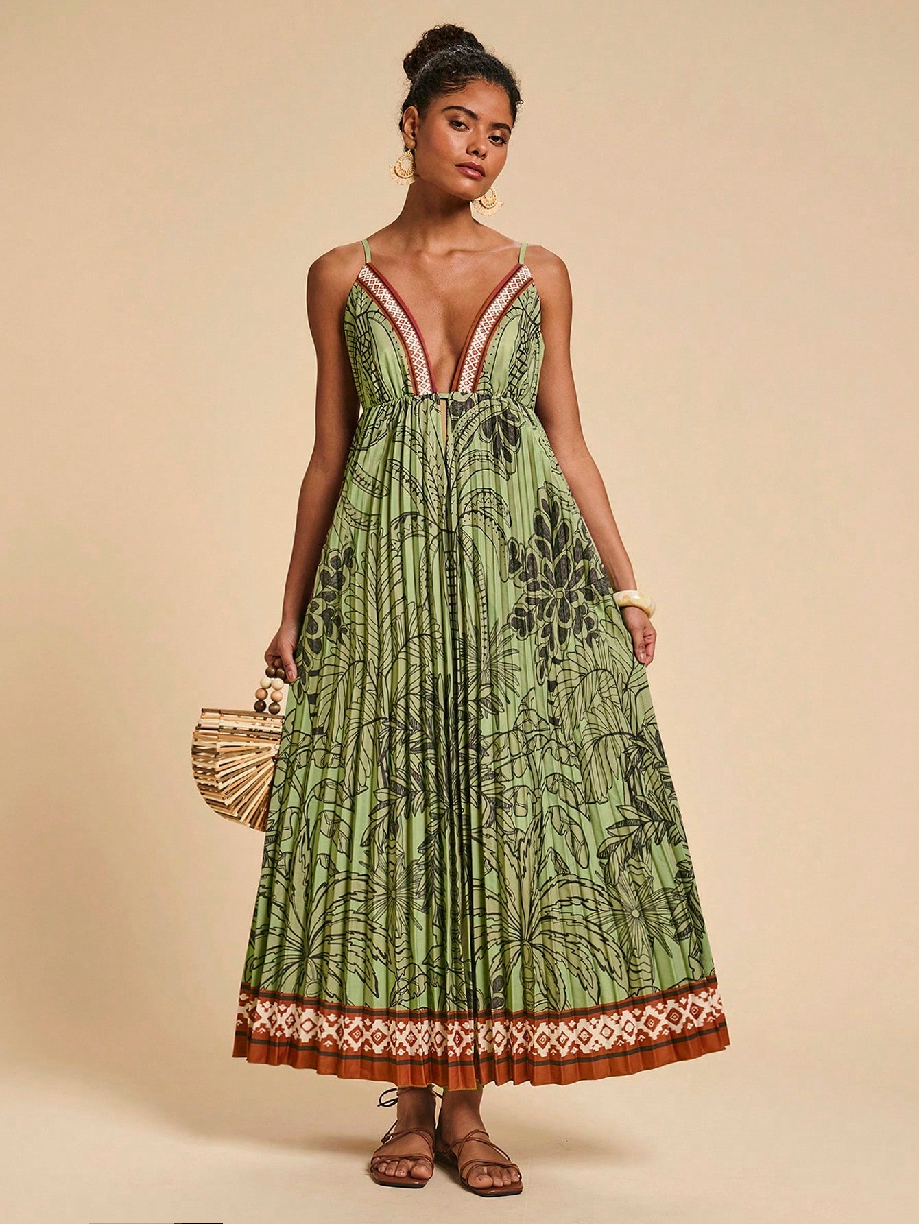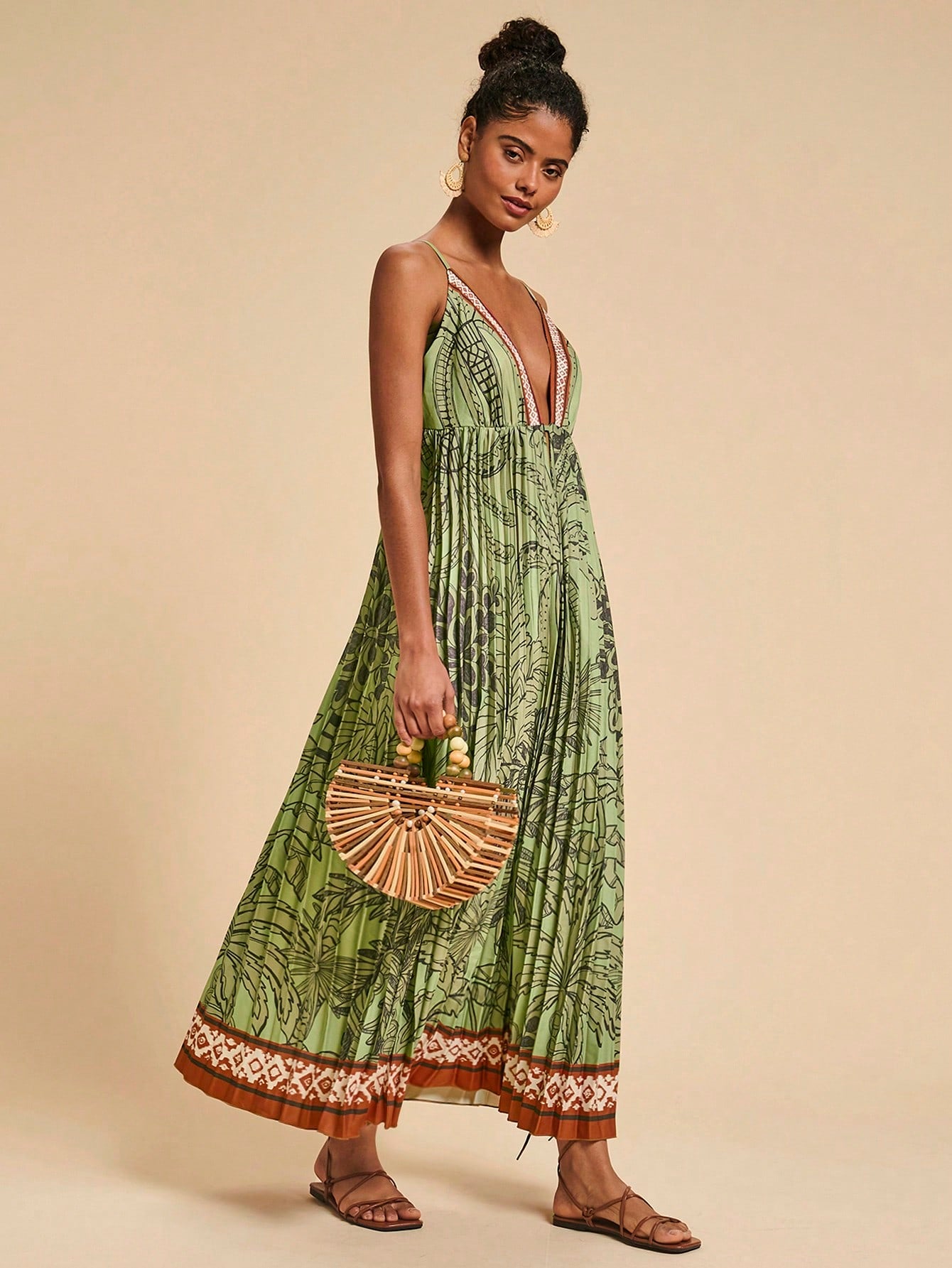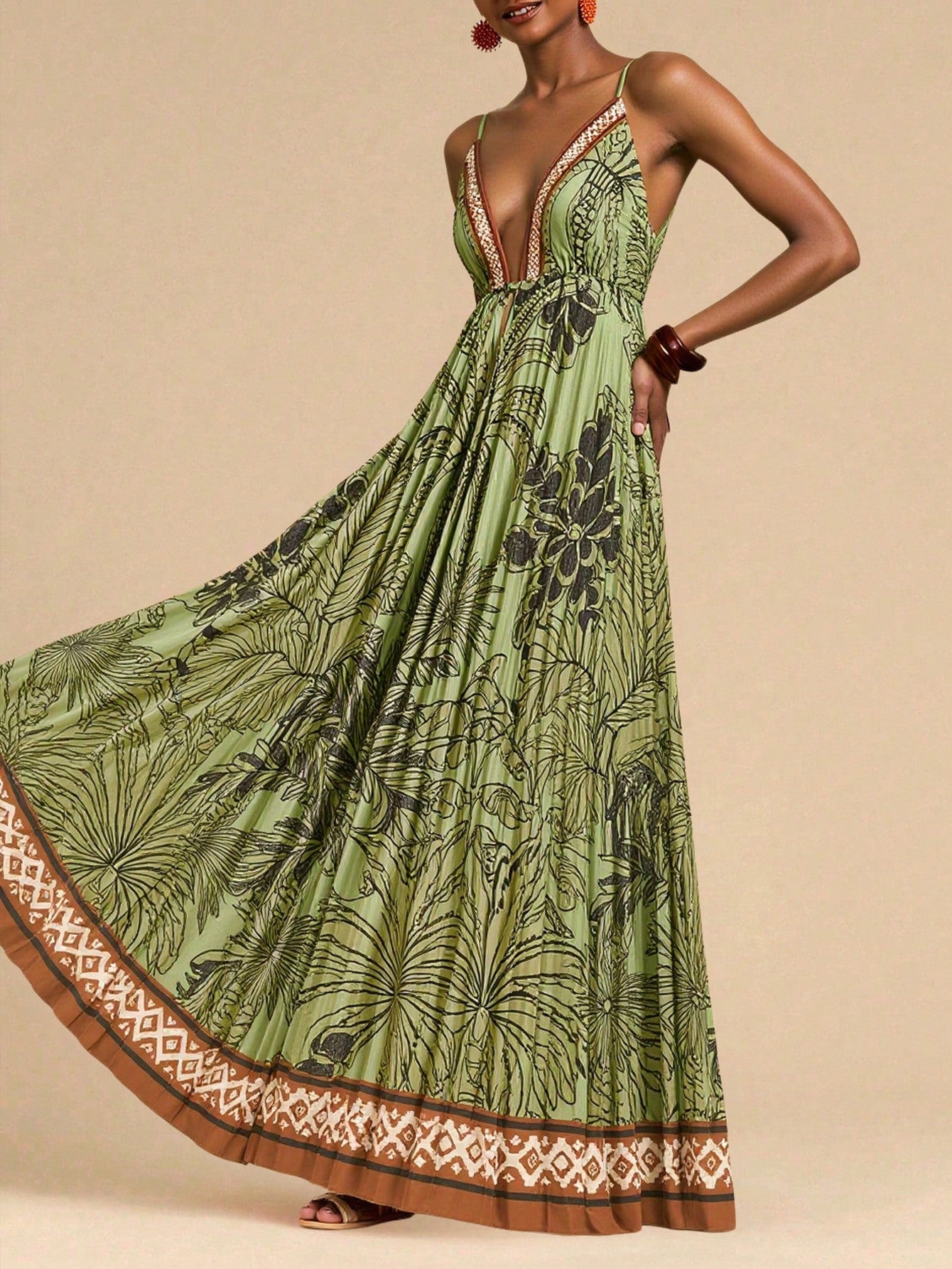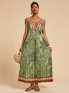 Travachic Summer Weekend Date Dress, Beach V-Neck Fitted Bohemian-Style Printed Pleated Women's Halter