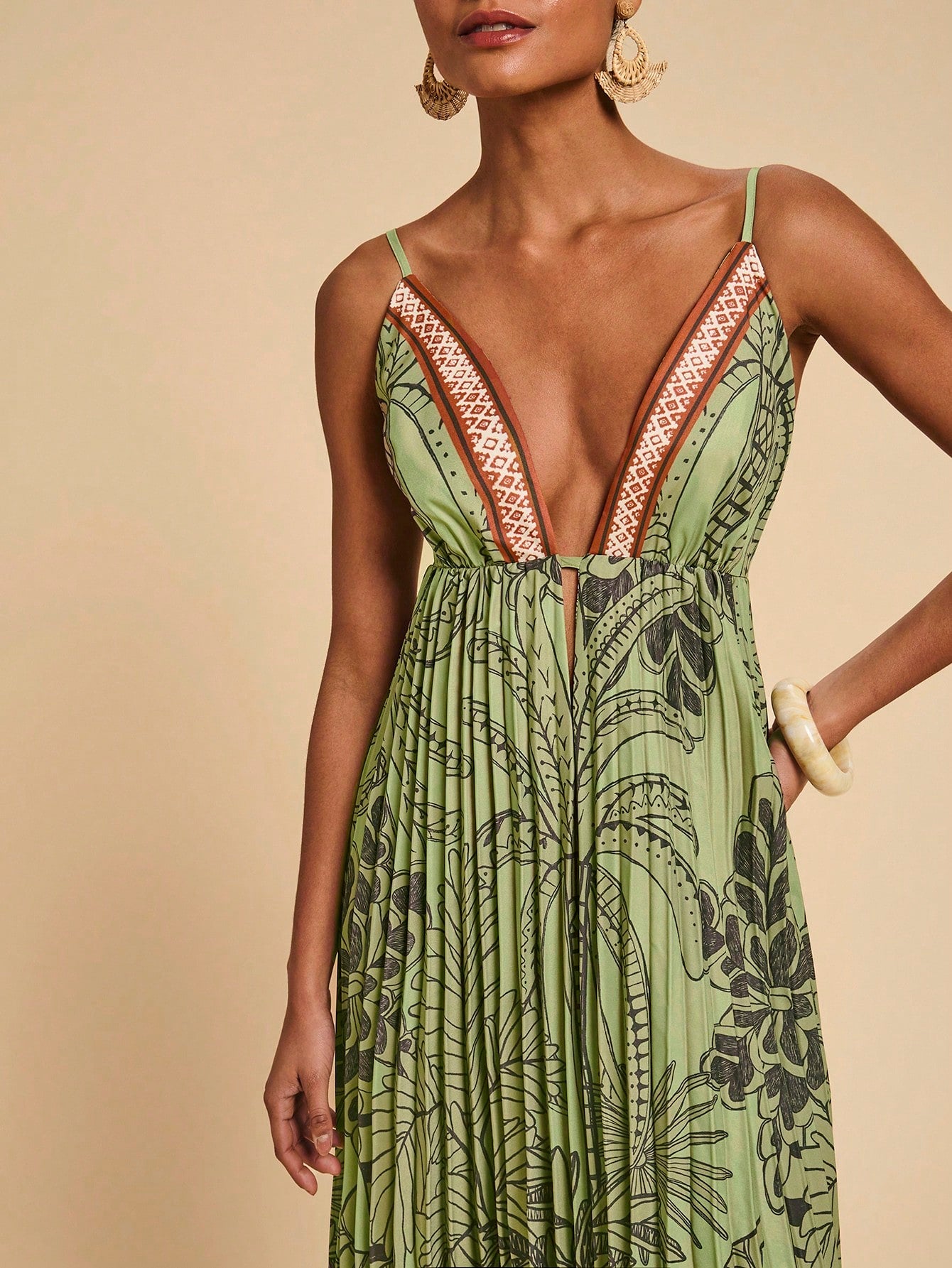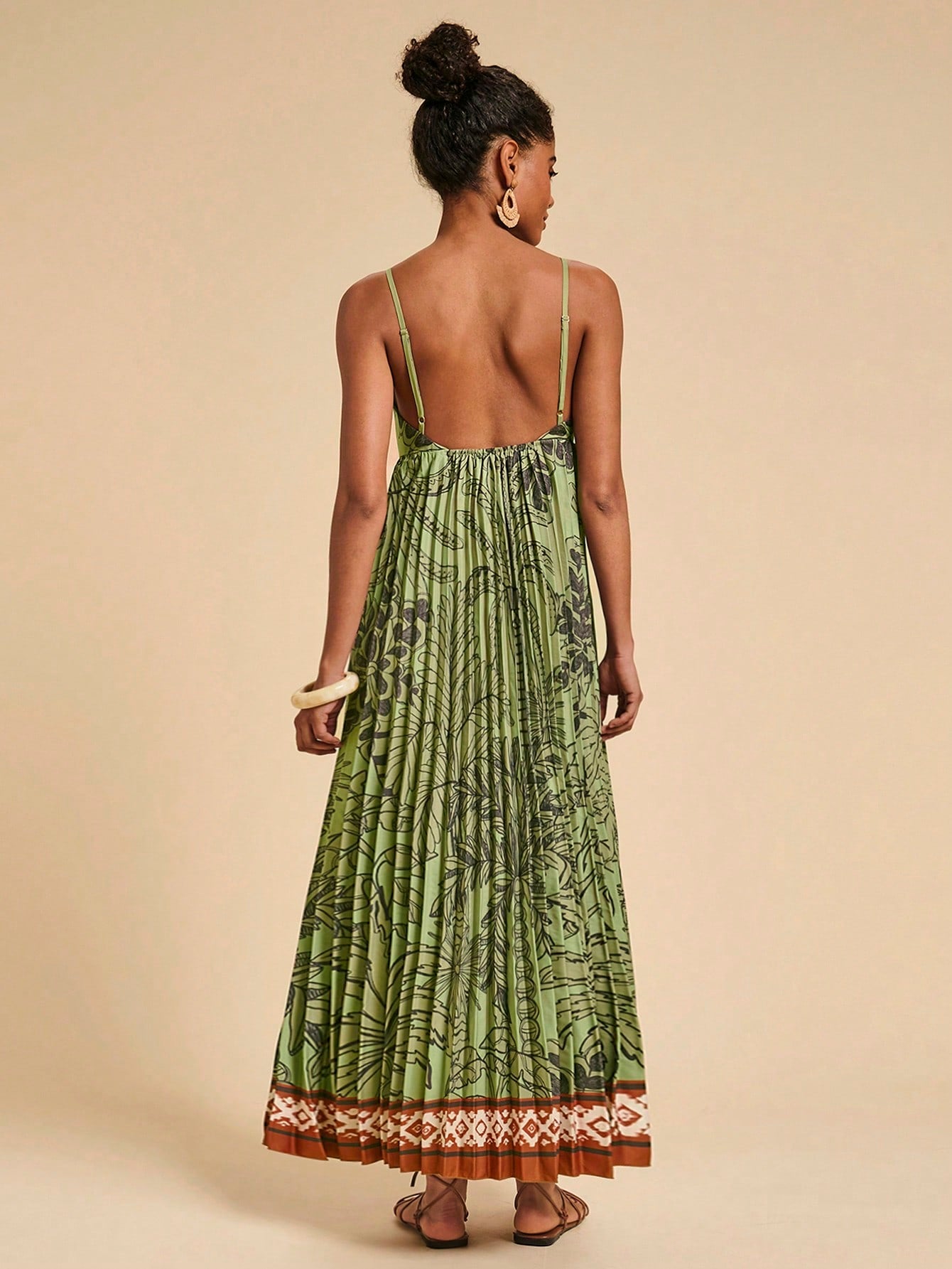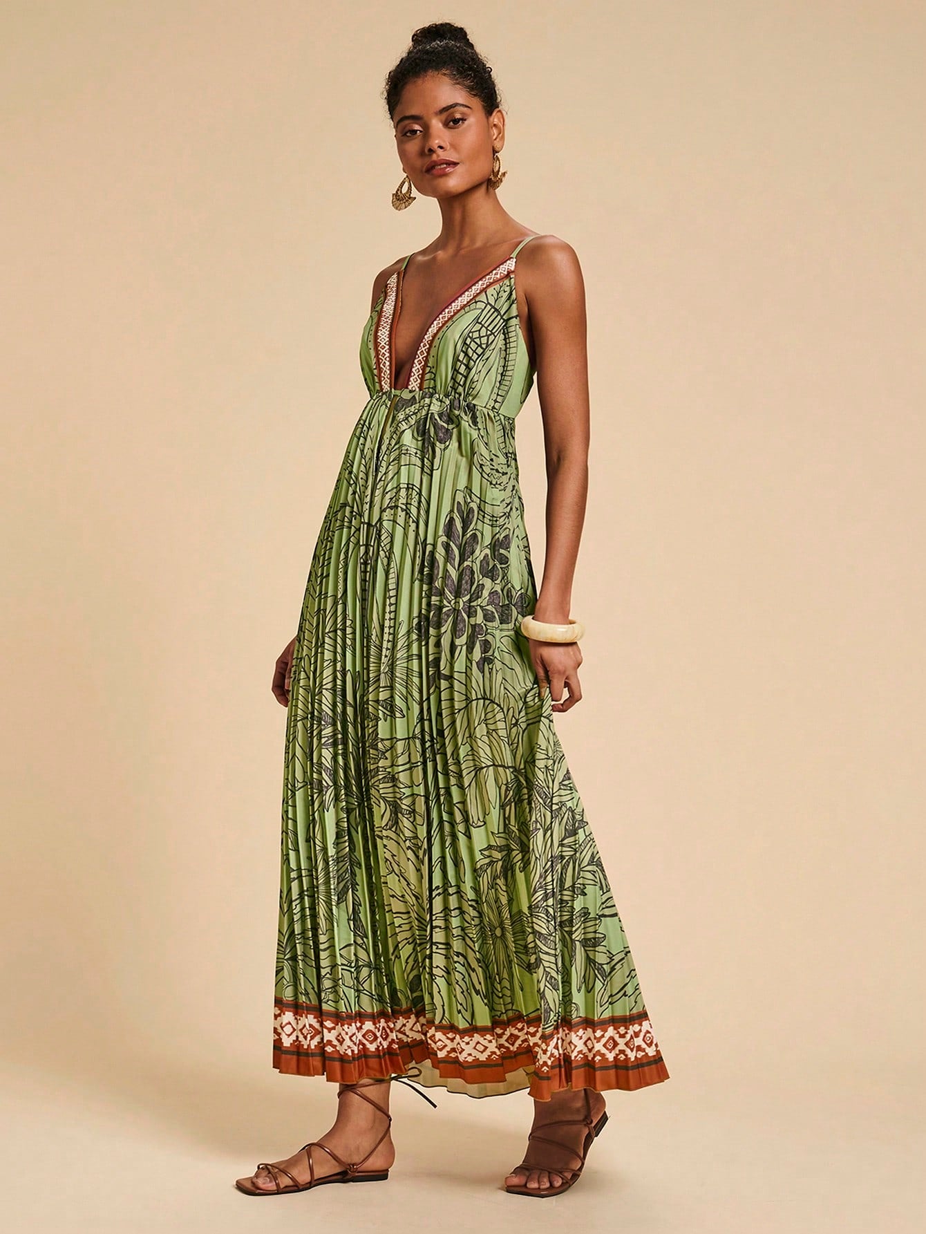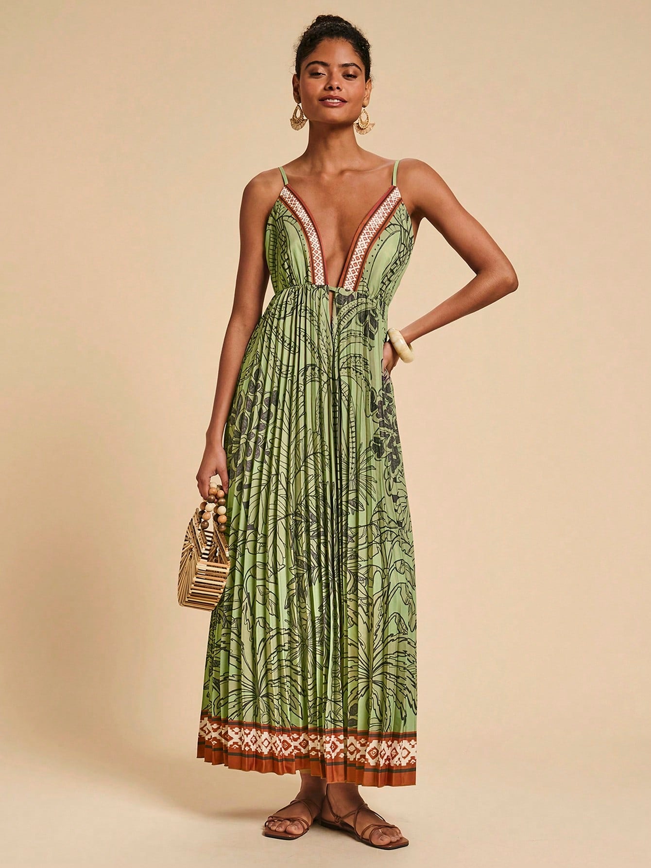 Travachic Summer Weekend Date Dress, Beach V-Neck Fitted Bohemian-Style Printed Pleated Women's Halter