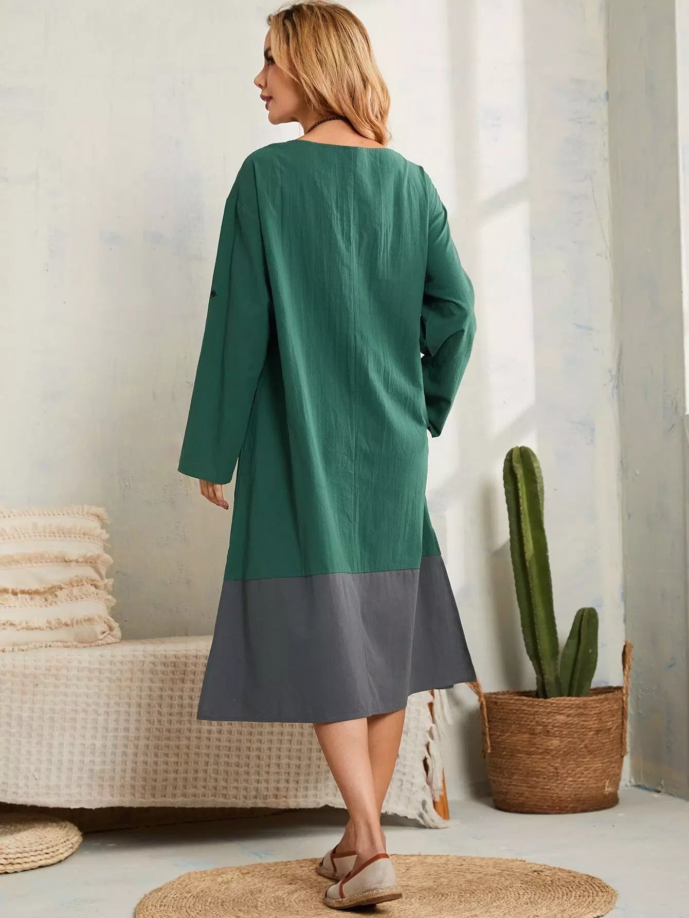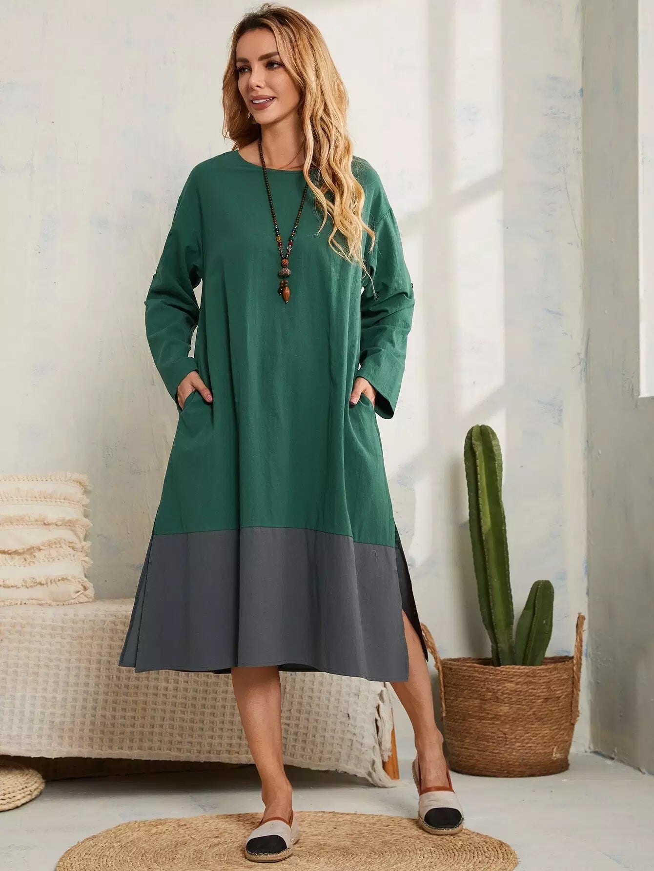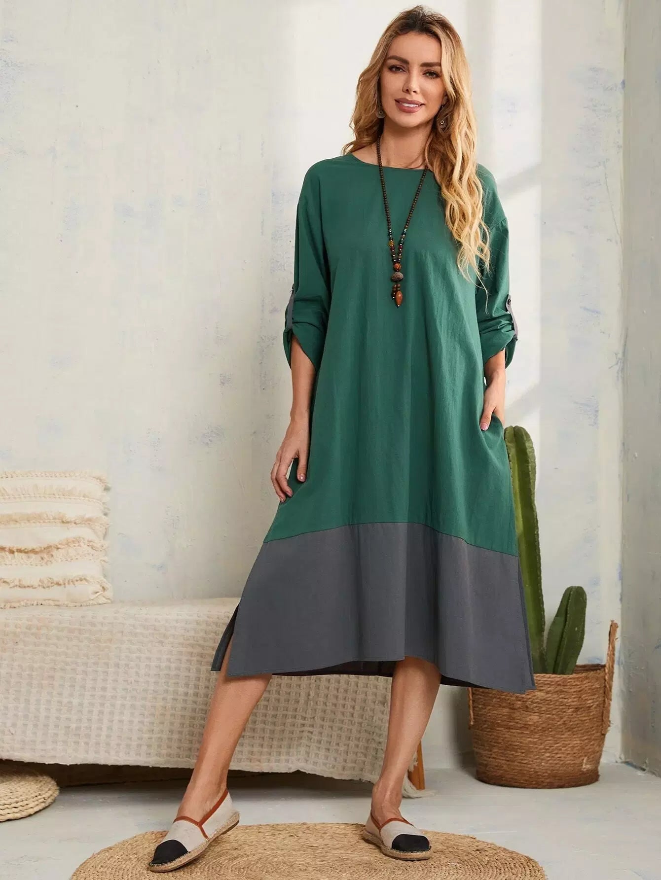 Two Tone Roll Tab Sleeve Split Hem Dress