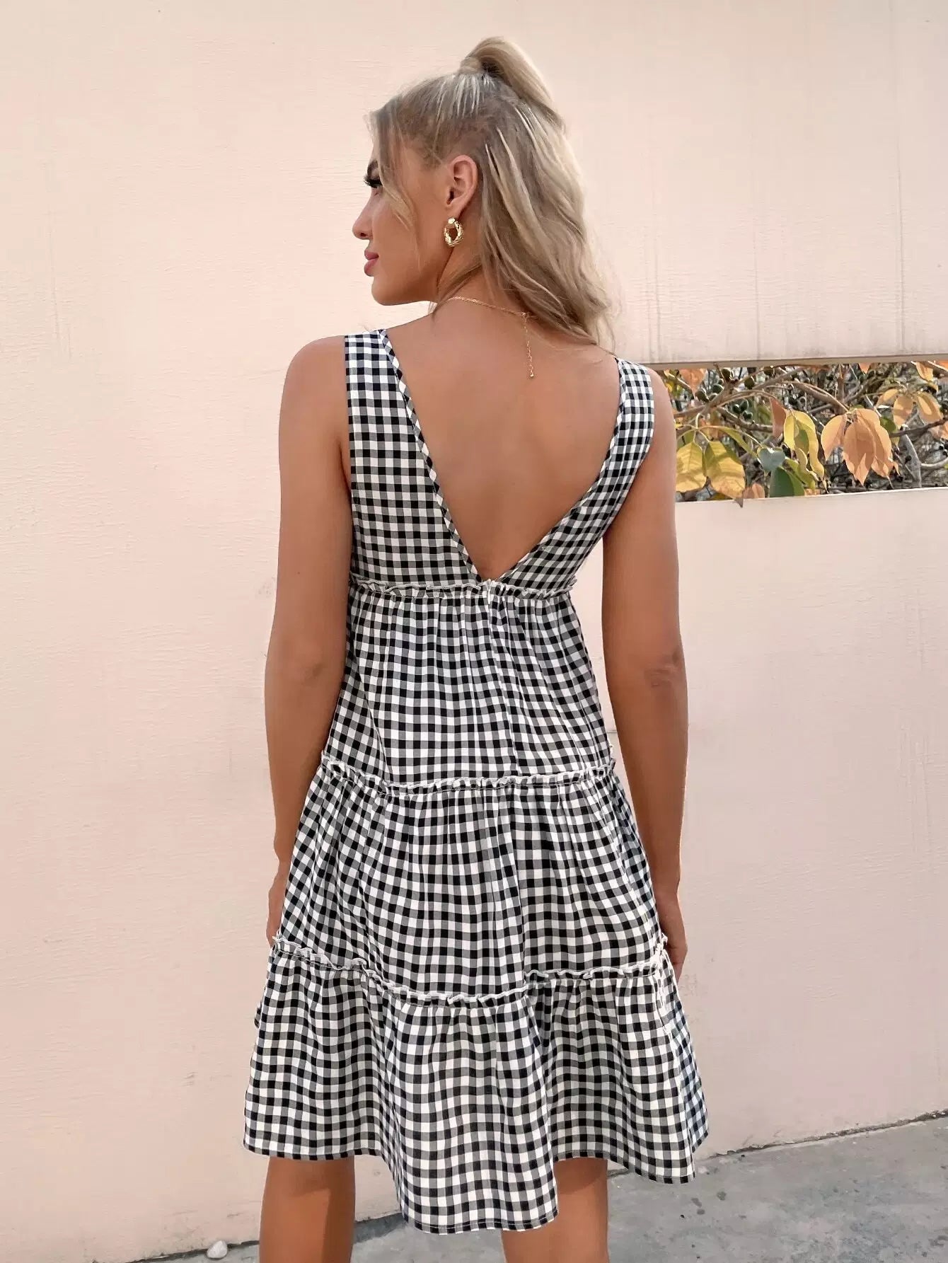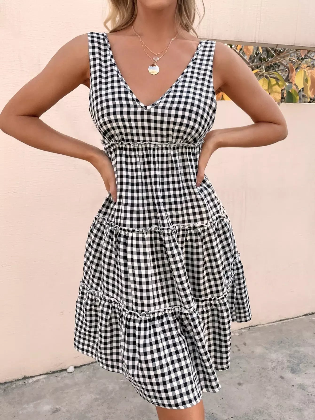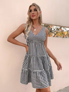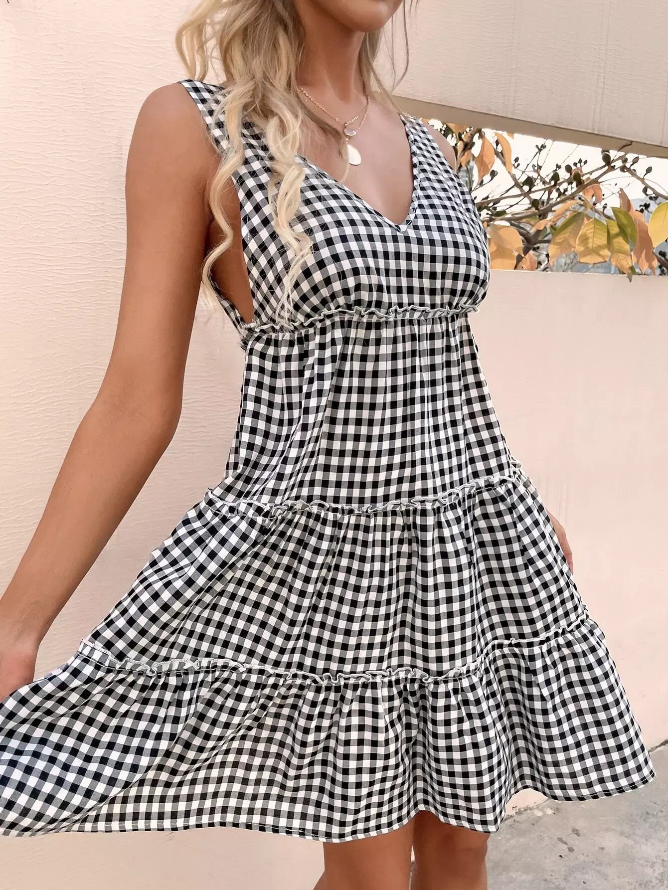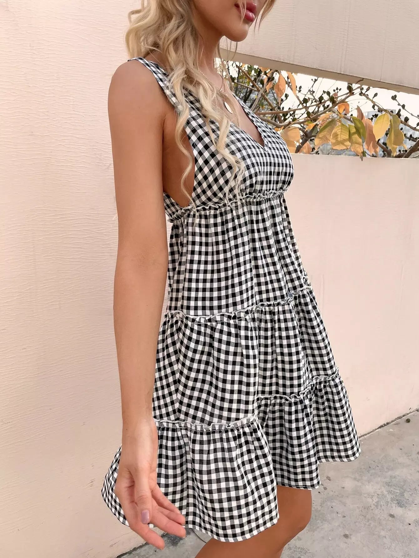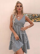 V-Back Frill Trim Gingham Dress