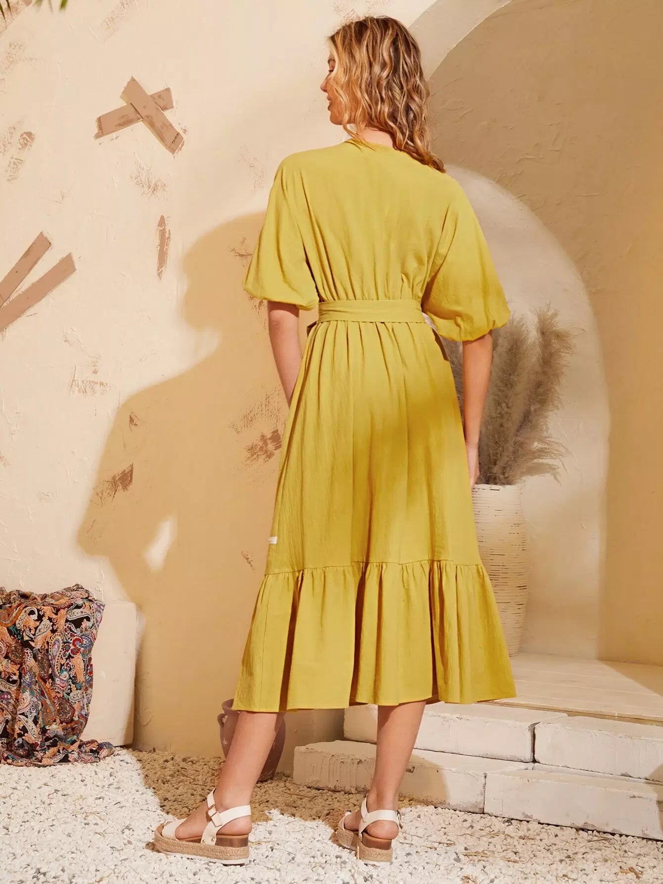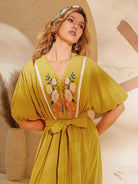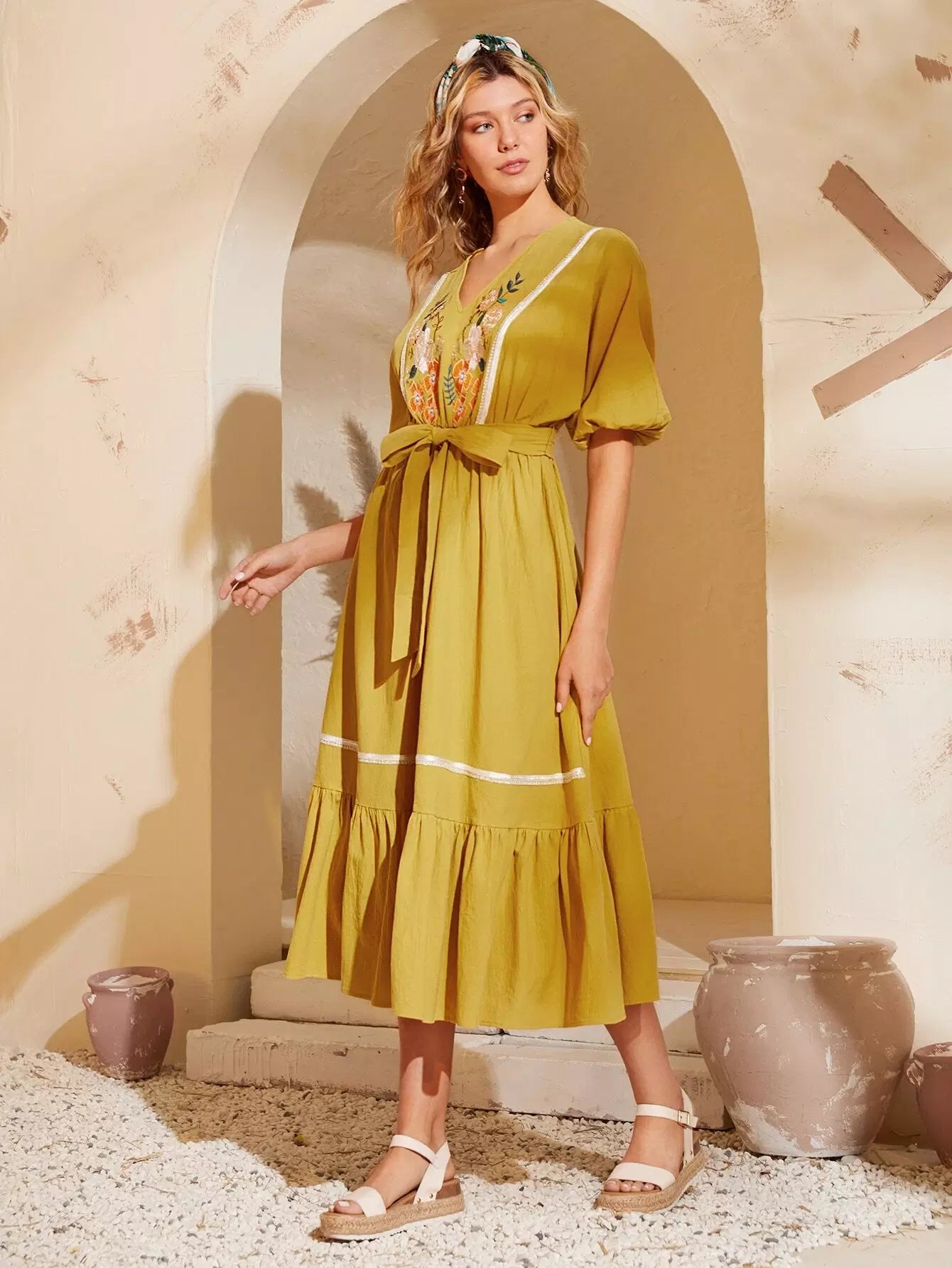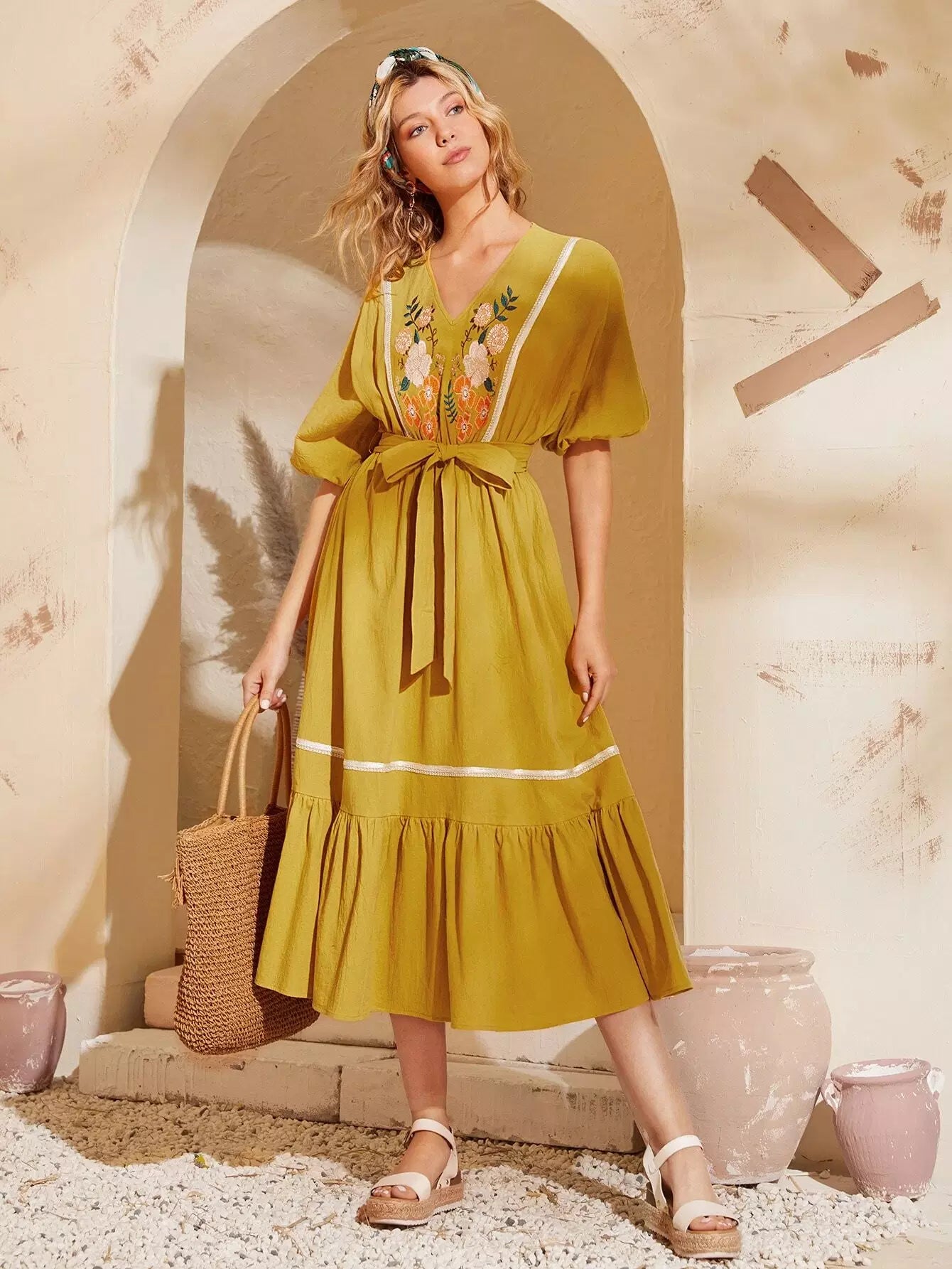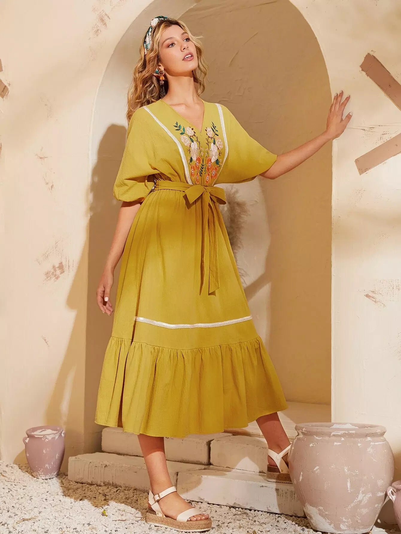 V-neck Floral Embroidered Flounce Hem Self Dress Without Belt