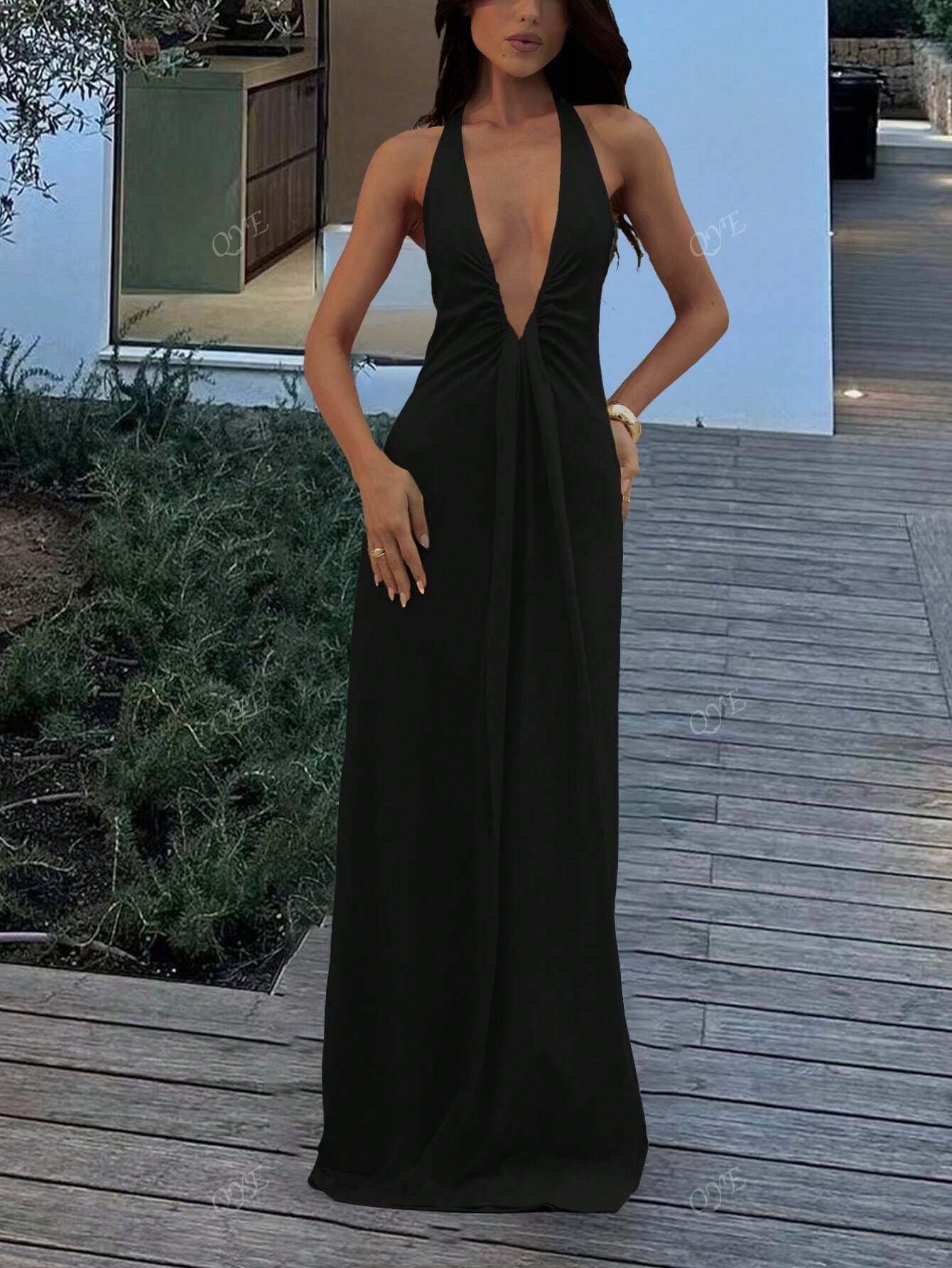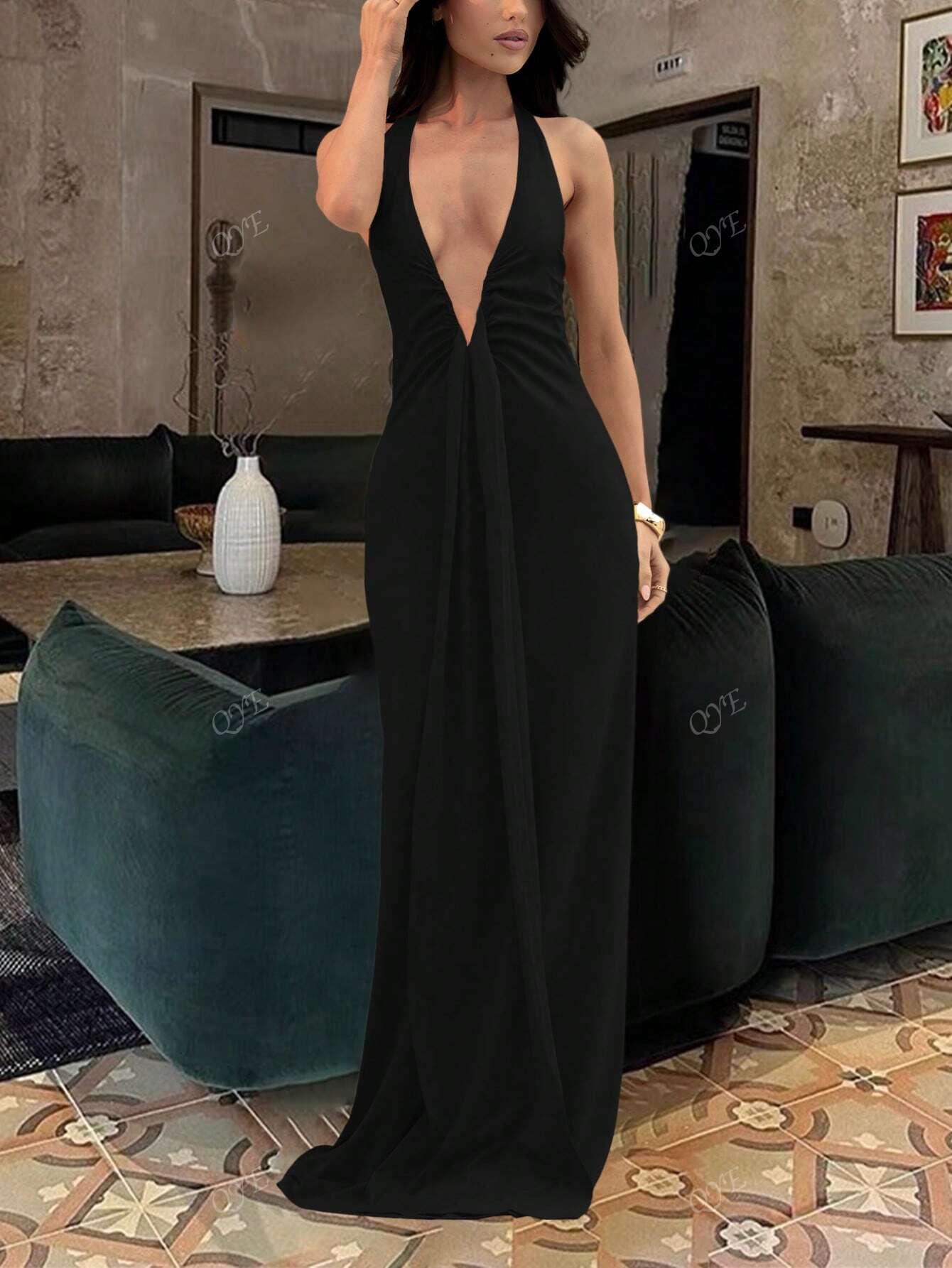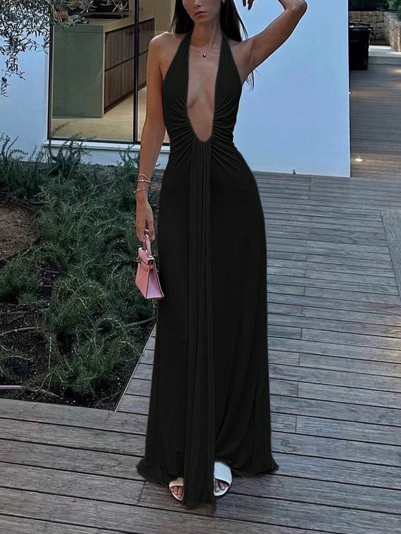 Women's Sexy Deep V-Neck Hollow Out Elegant Long Dress With Pleats Waist-Defining Maxi Dress With Halter