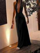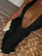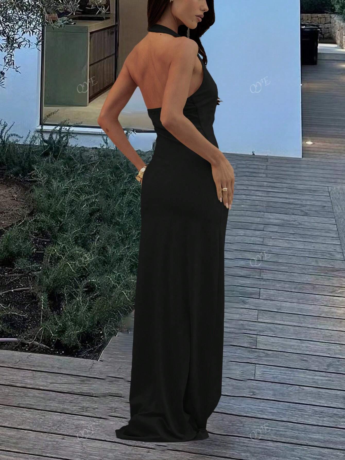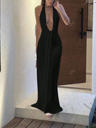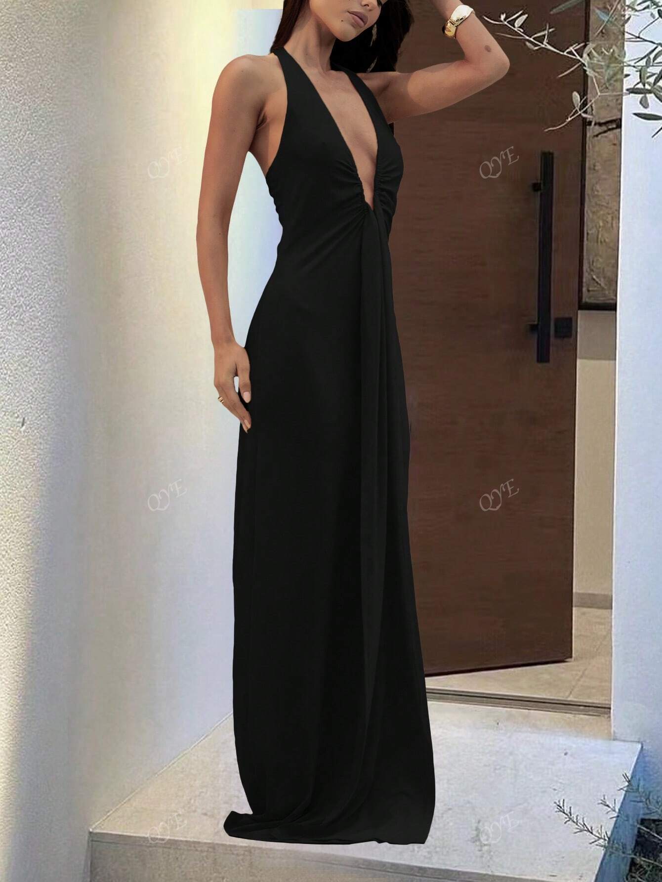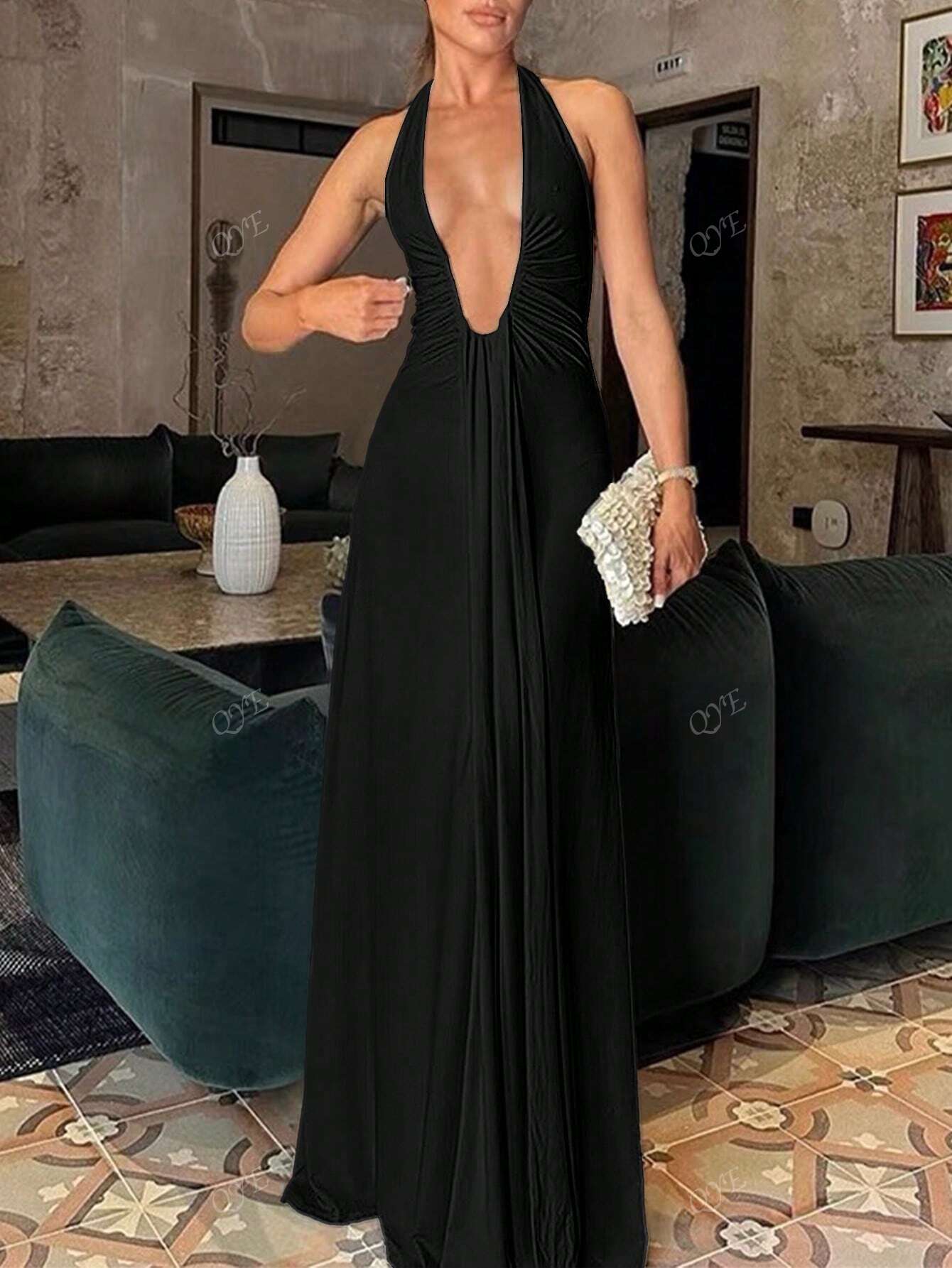 Women's Sexy Deep V-Neck Hollow Out Elegant Long Dress With Pleats Waist-Defining Maxi Dress With Halter
