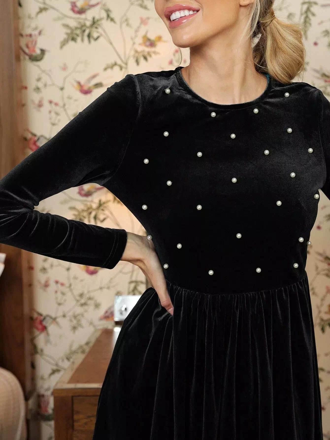 Zipper Back Pearls Beaded Velvet Dress