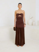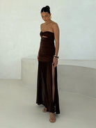 women AiiRZ Bandeau Ruched Maxi Dress With Side Slit Cutout Detail Evening Party Gown Flowy Formal Floor Length Wedding Guest Spring Summer Fall
