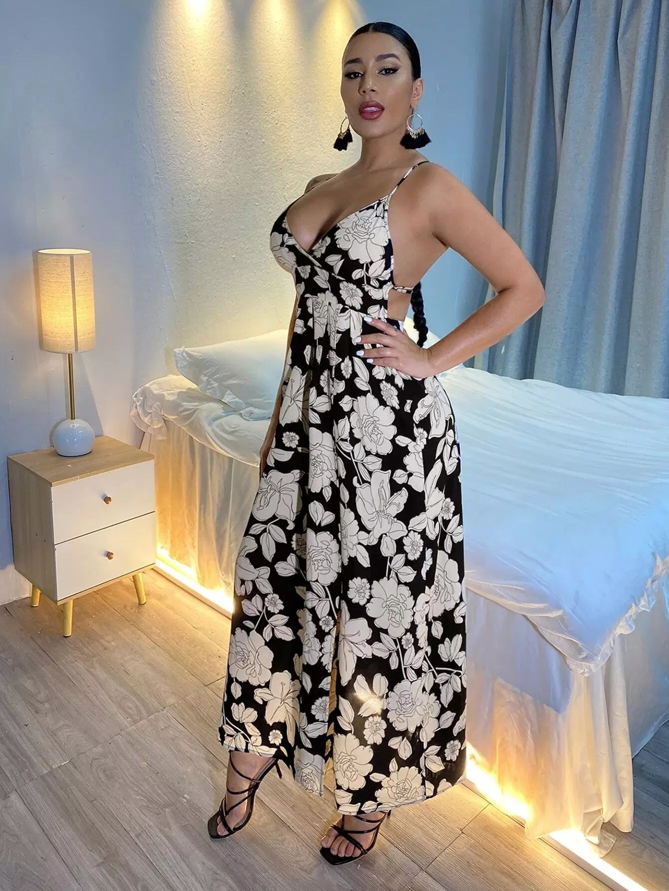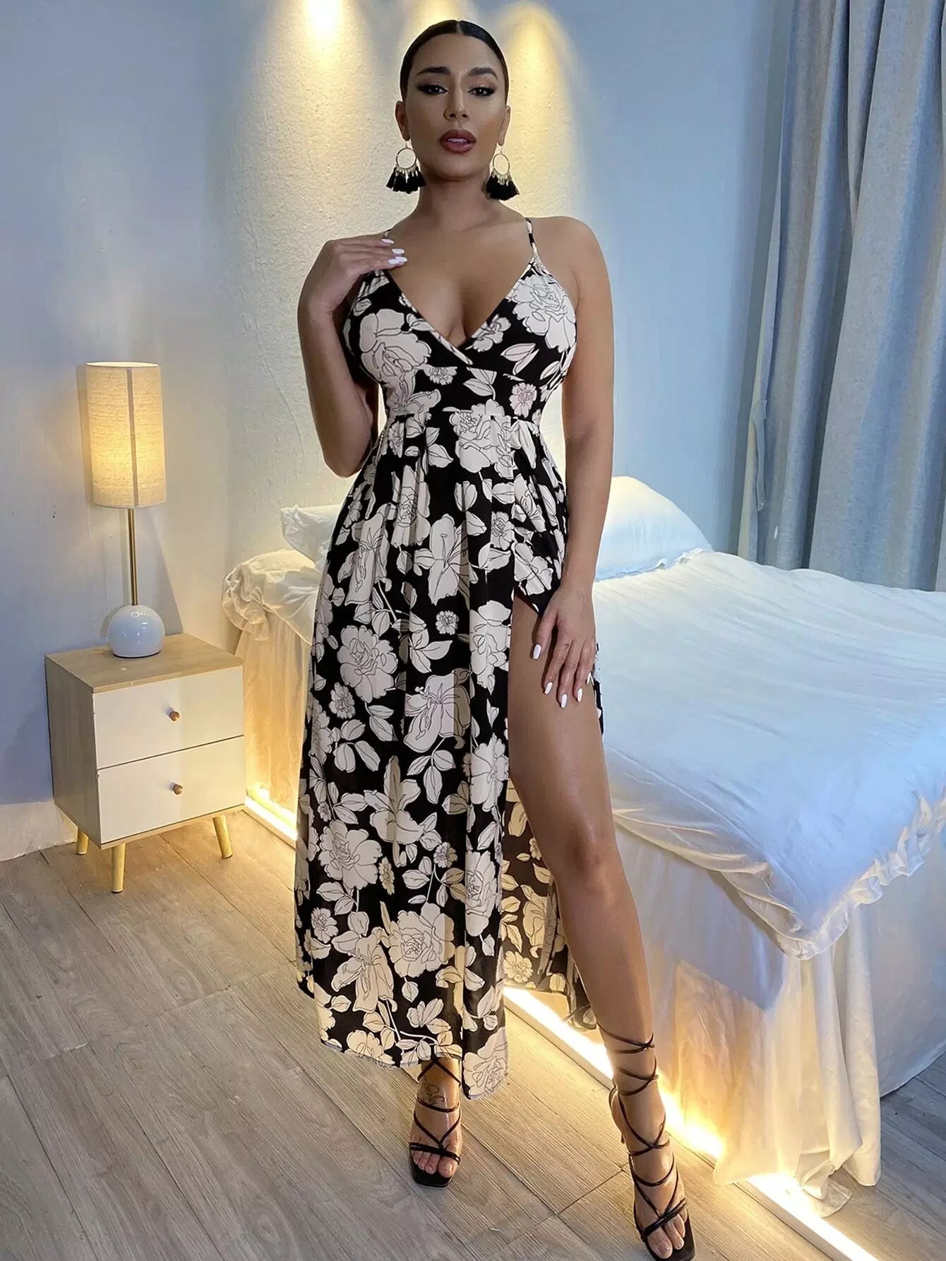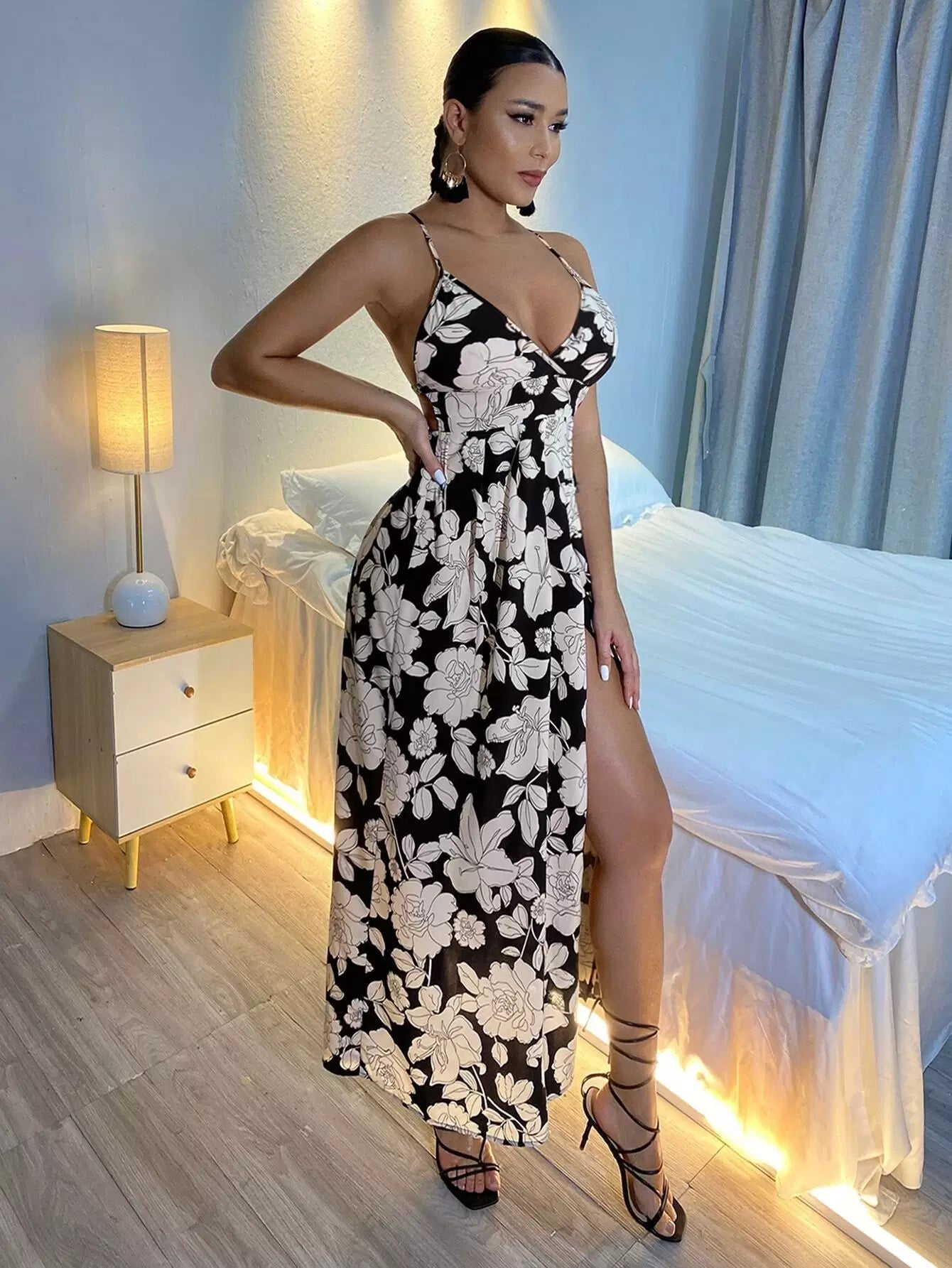 Allover Floral Criss-cross Backless Split Thigh Cami Dress