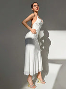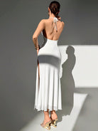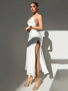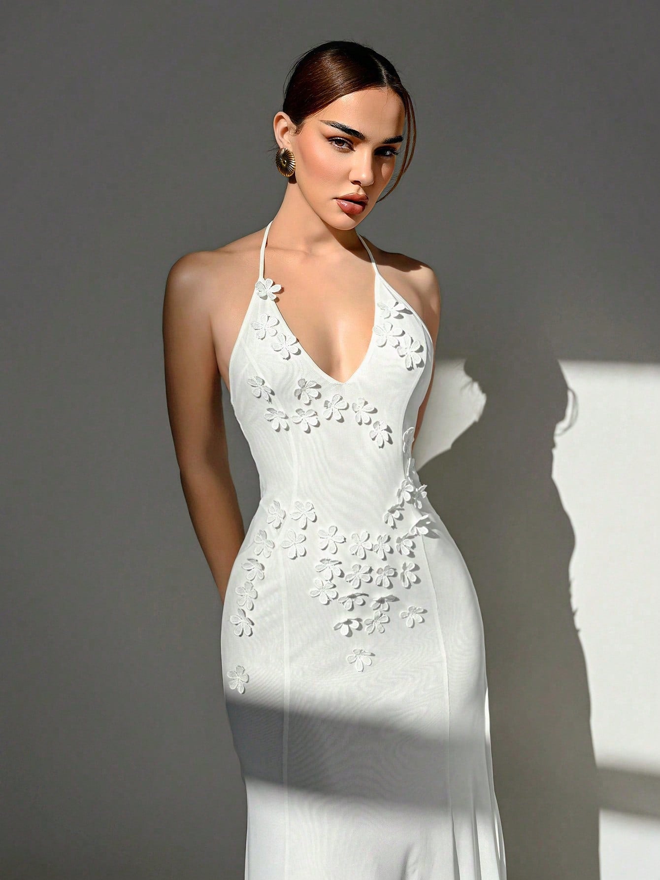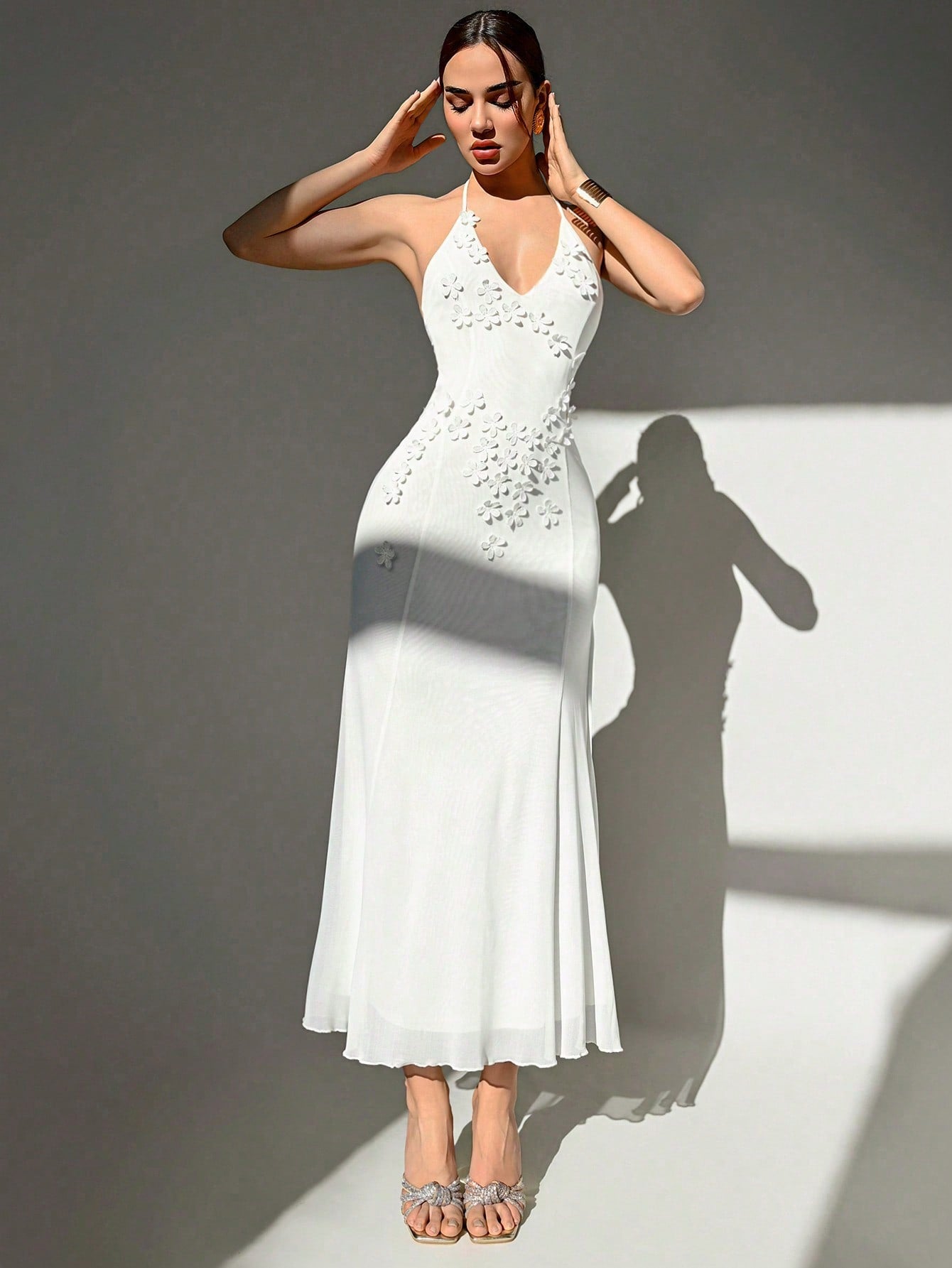 women Aloruh Handmade 3D Floral Necklace Tied White Mesh Deep V High Slit Dress