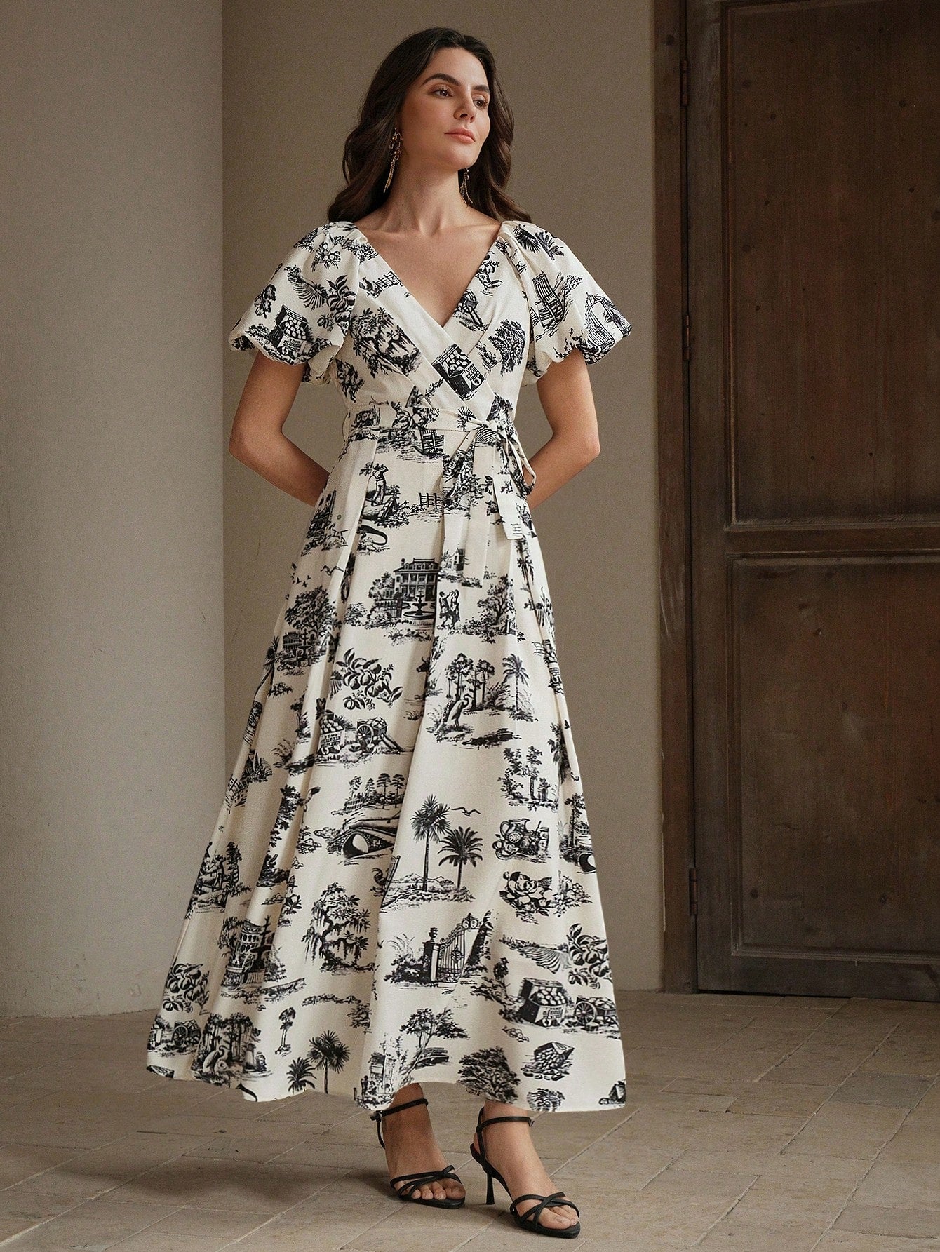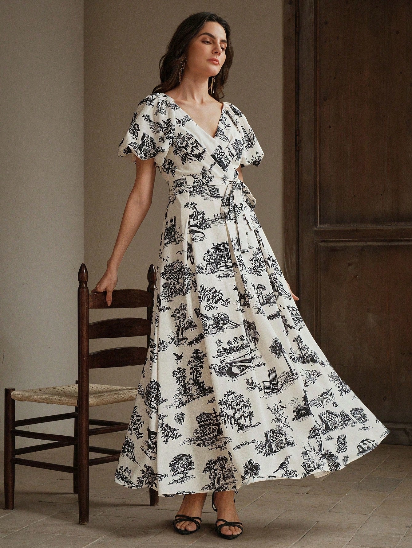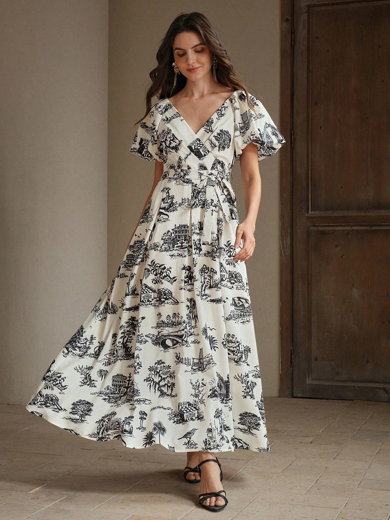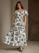 Anewsta V-Neck Tie-Waist Half Sleeve Floral Print Long Women Dress