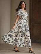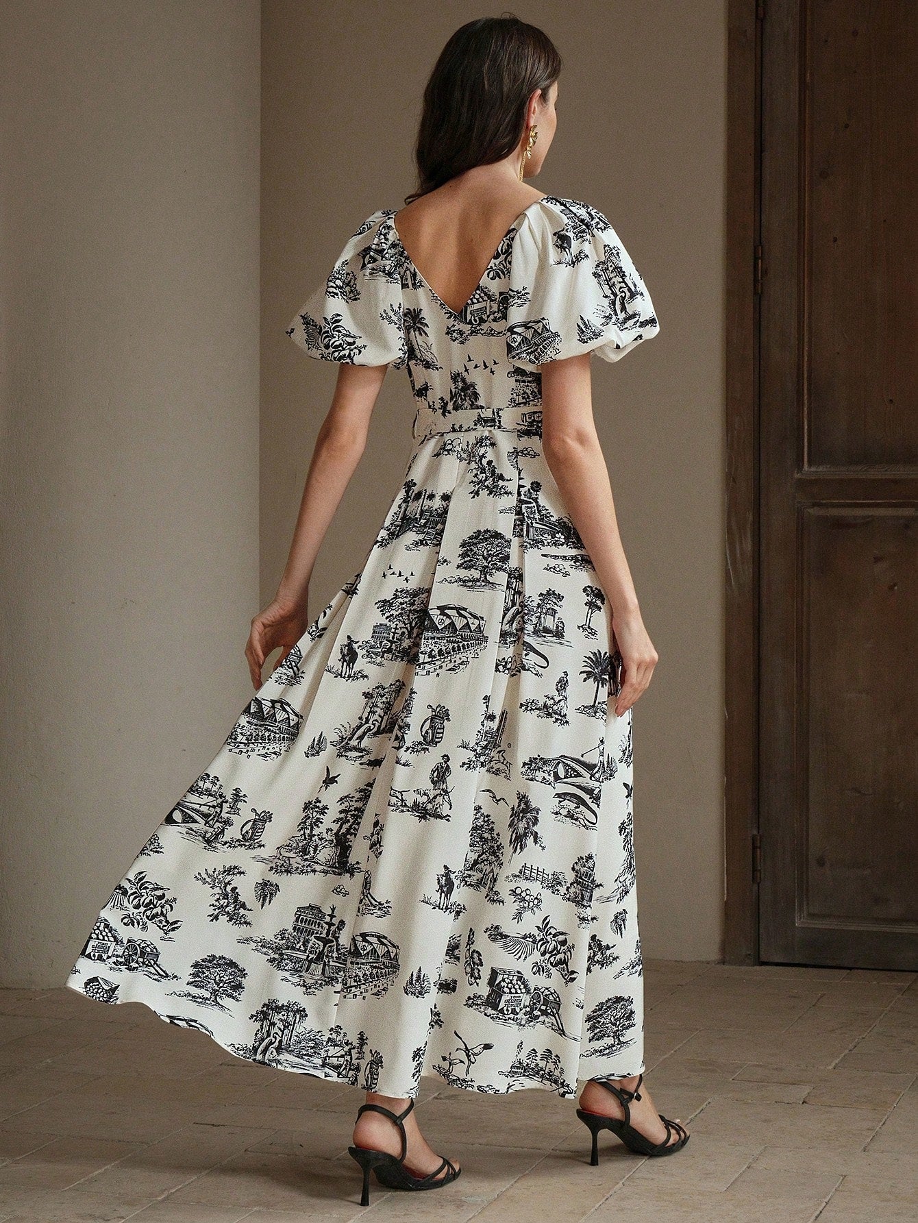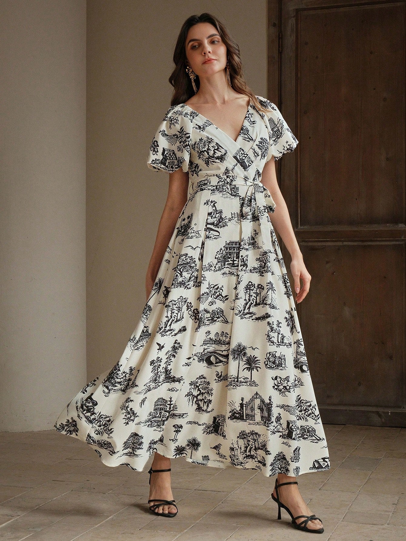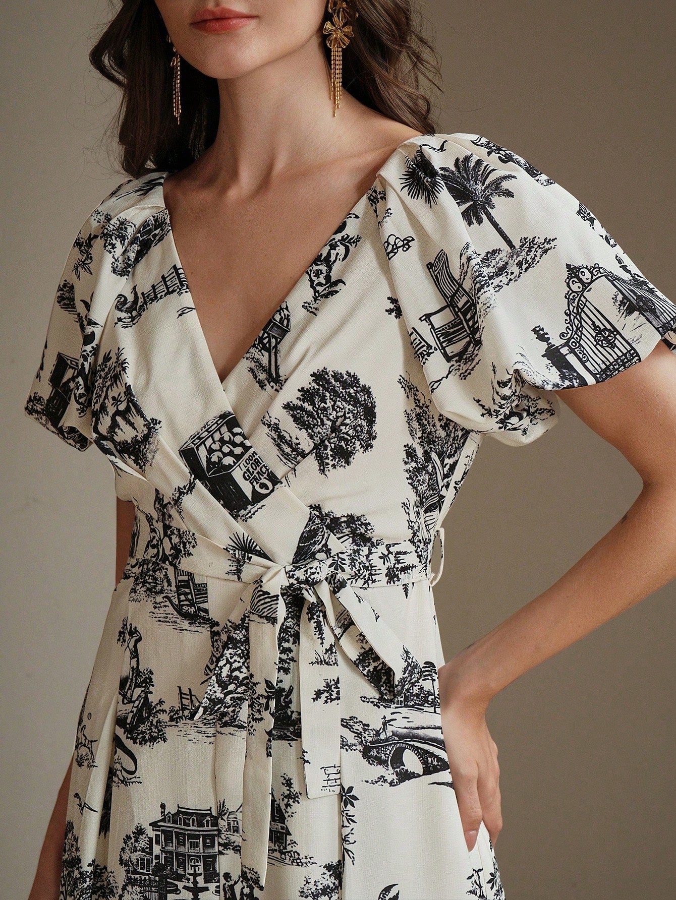 Anewsta V-Neck Tie-Waist Half Sleeve Floral Print Long Women Dress