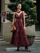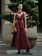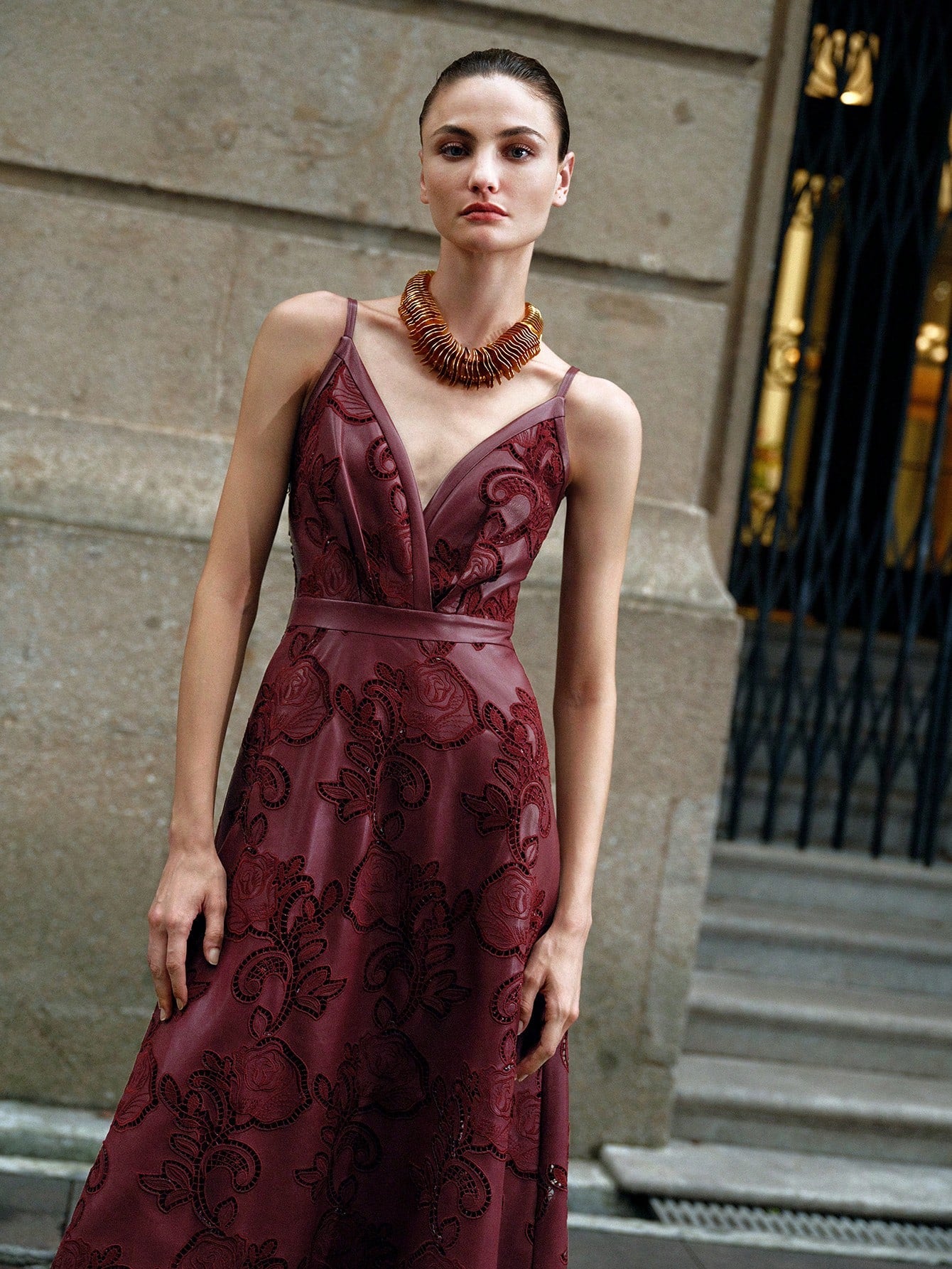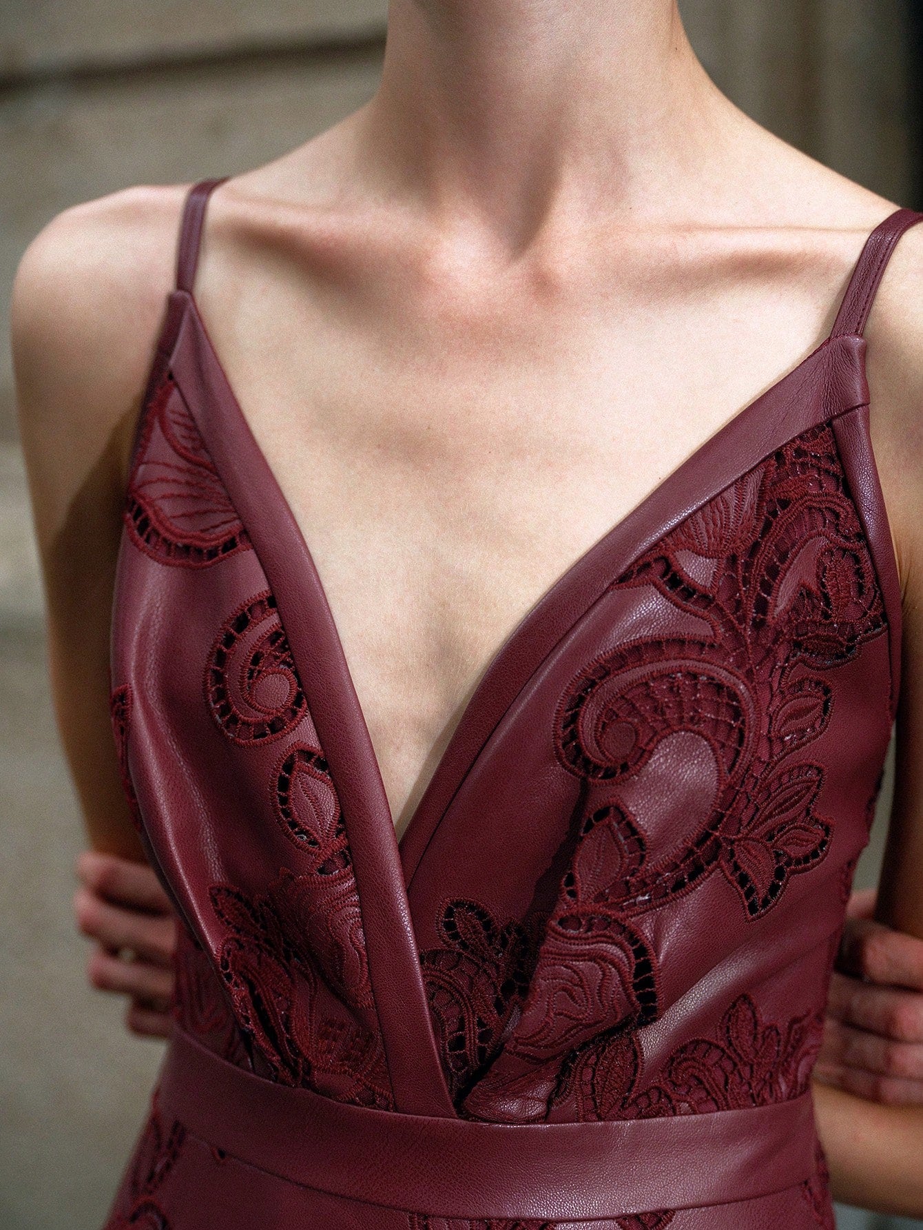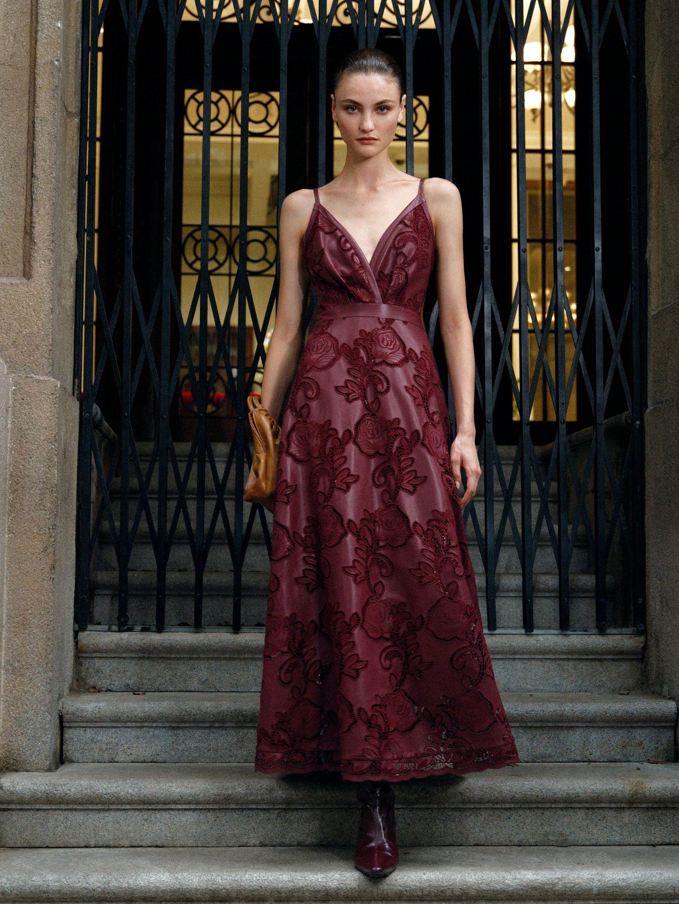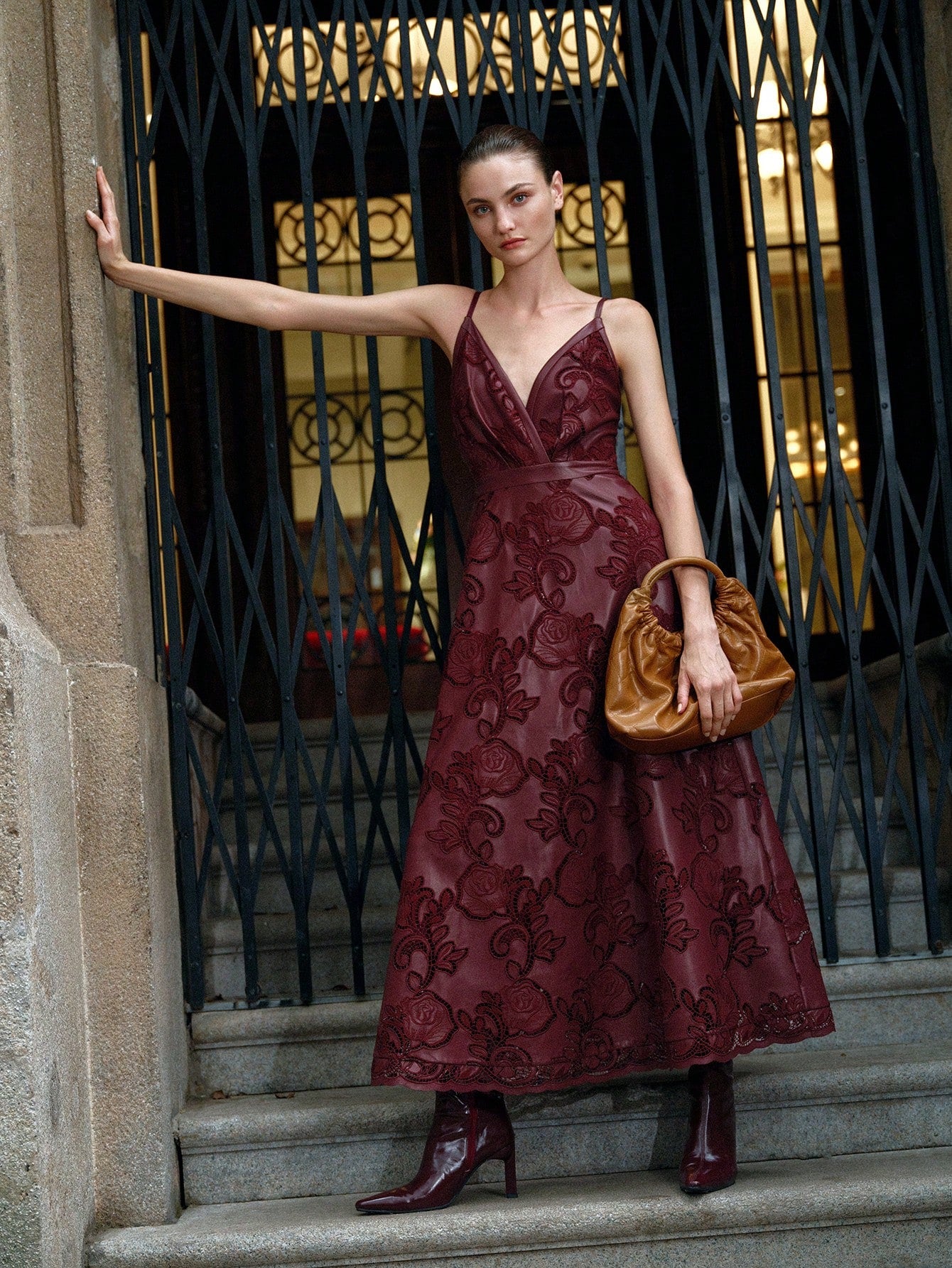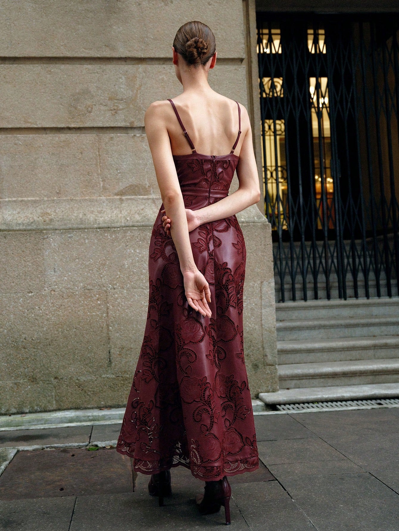 Anewsta Women's Embroidered Burgundy Swing Slip Dress Maxi PU Leather Women Outfit