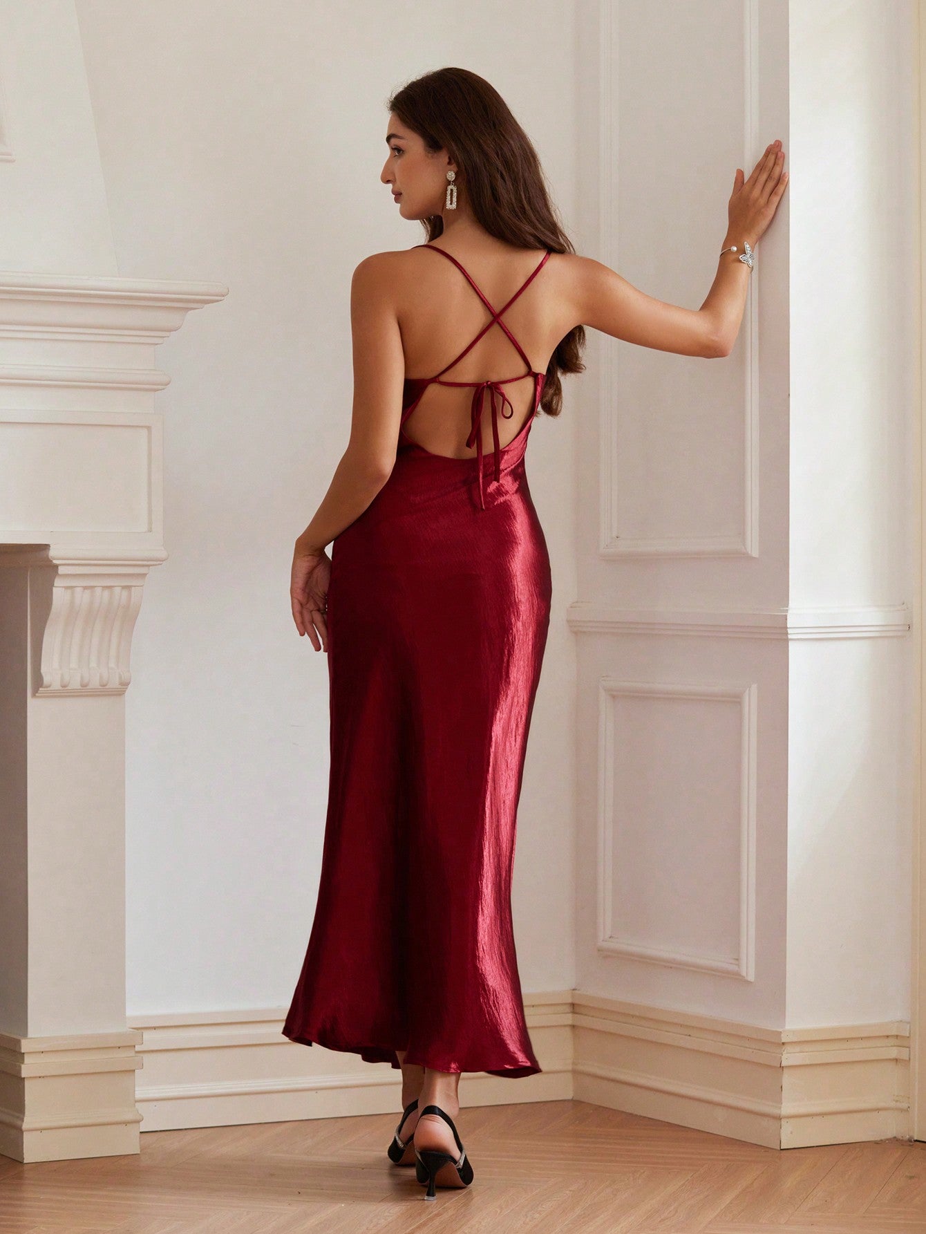 women Aveloria Rosie Elegant Party Sexy Wave Draped Neck Glossy Textured Satin Camisole Long Dress Fitted Waist Dress For Women Holiday Party Birthday Formal Occassion Dressï؟½