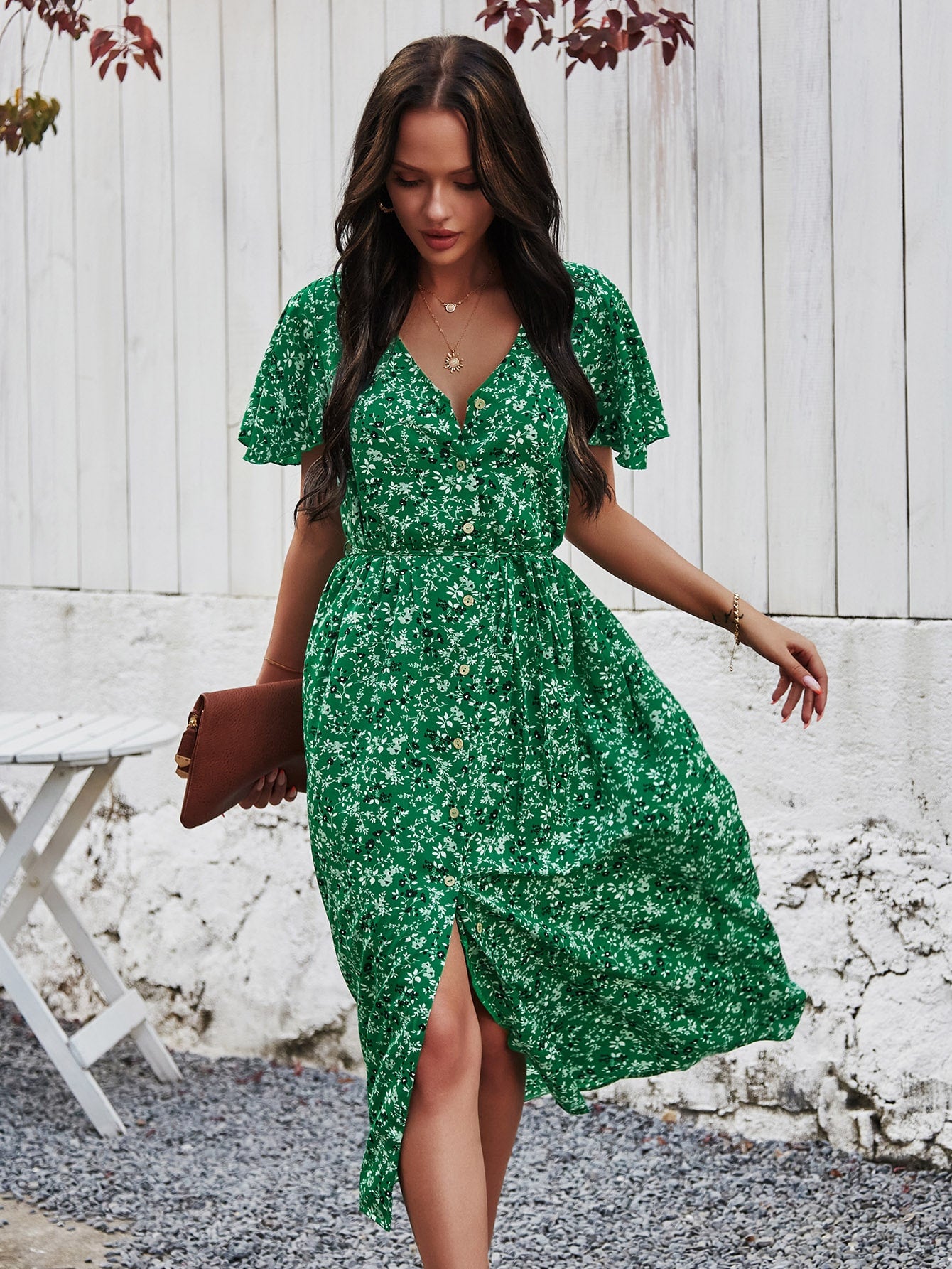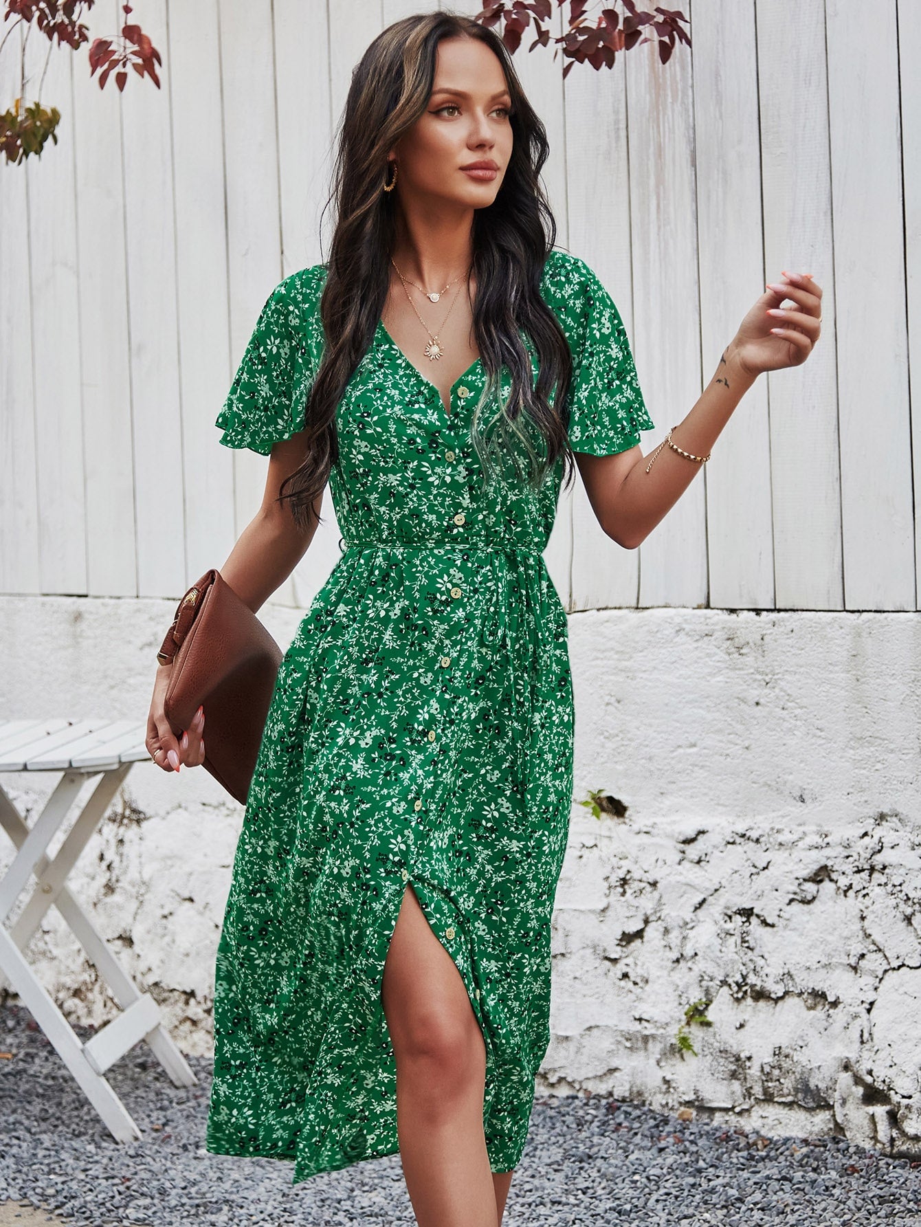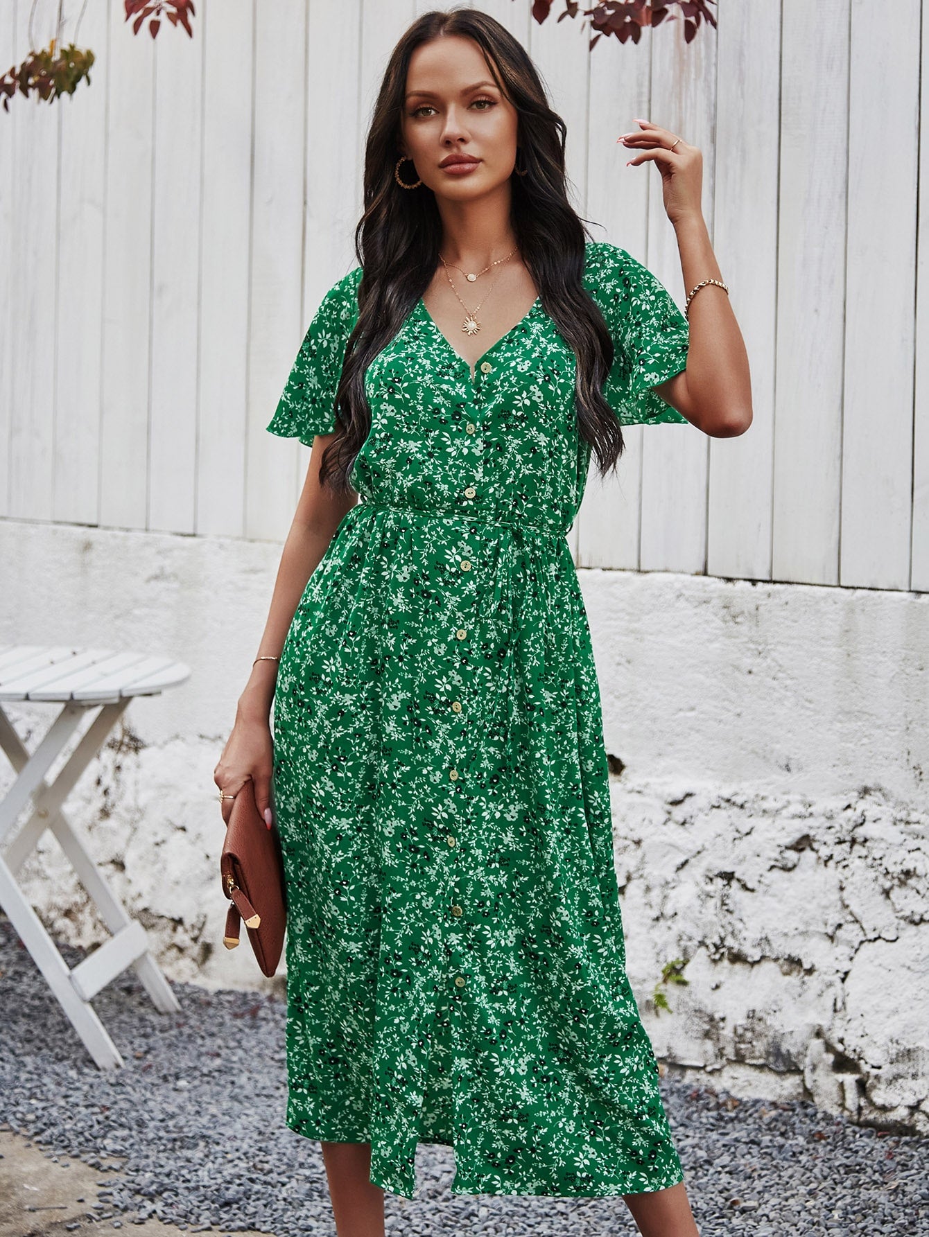 Ditsy Floral Flutter Sleeve Button Front Dress Without Belt