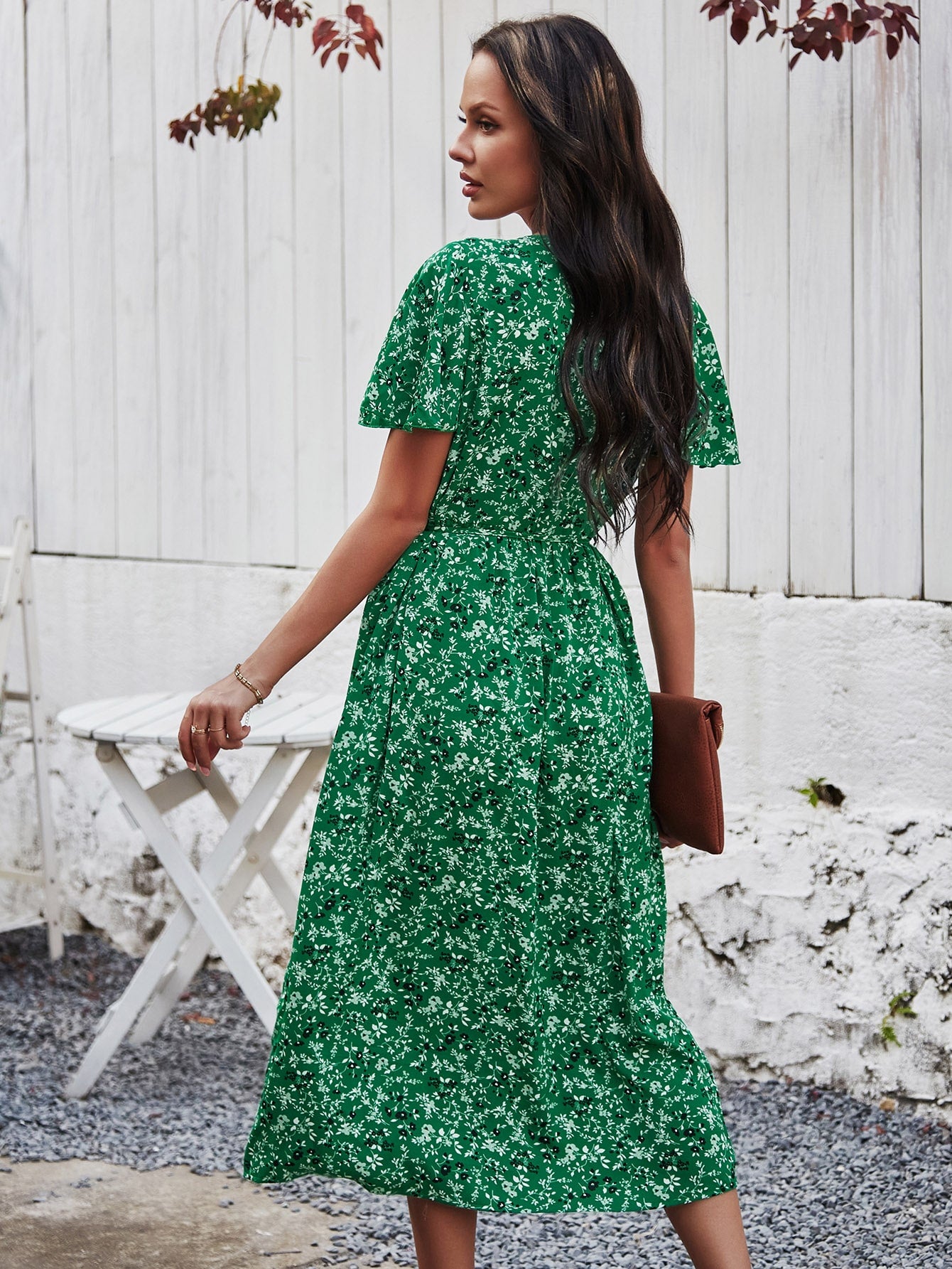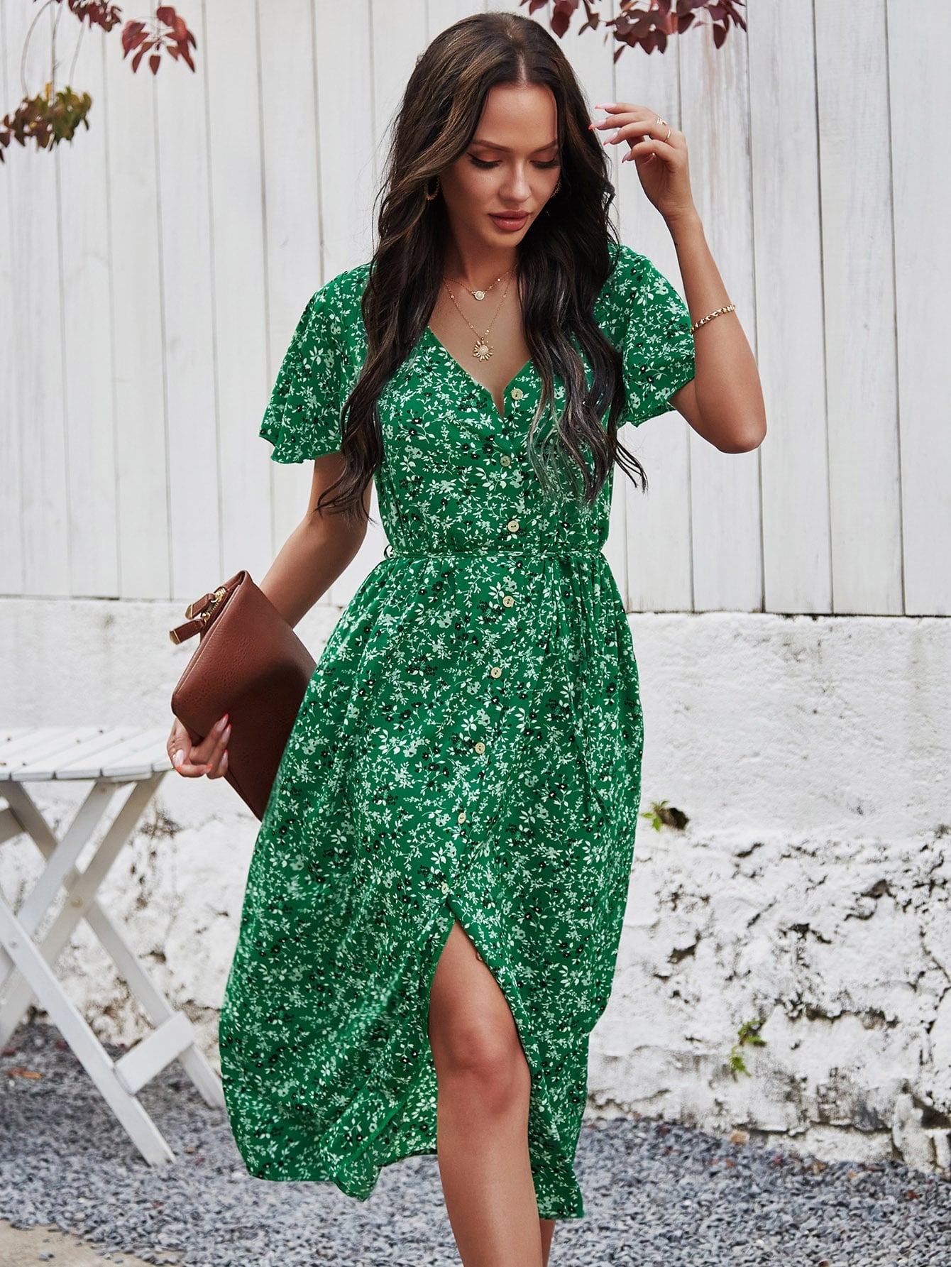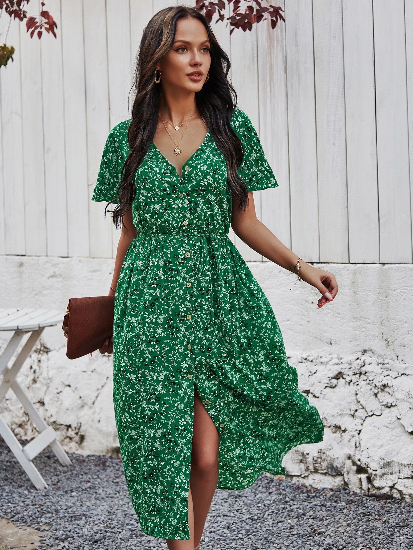 Ditsy Floral Flutter Sleeve Button Front Dress Without Belt