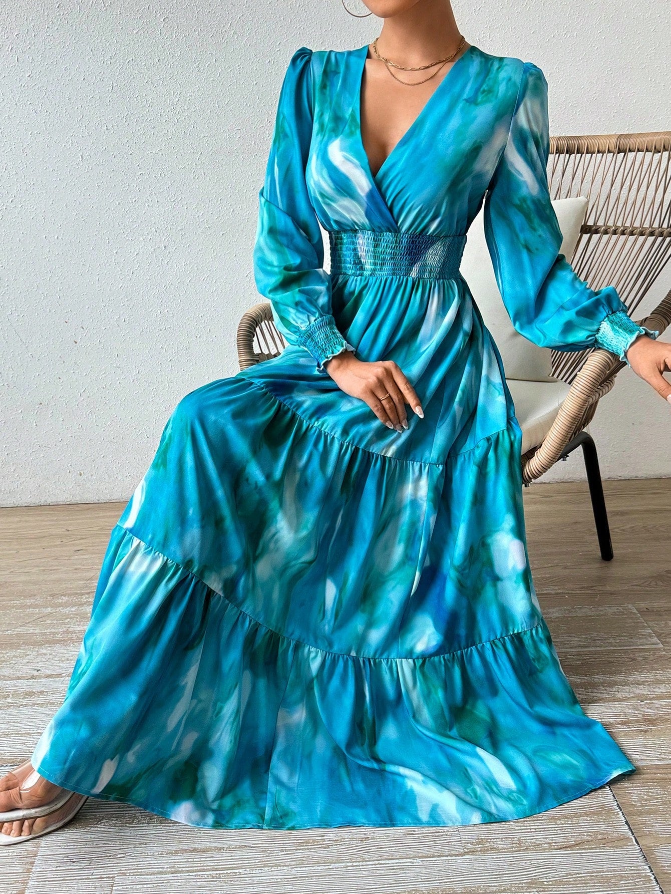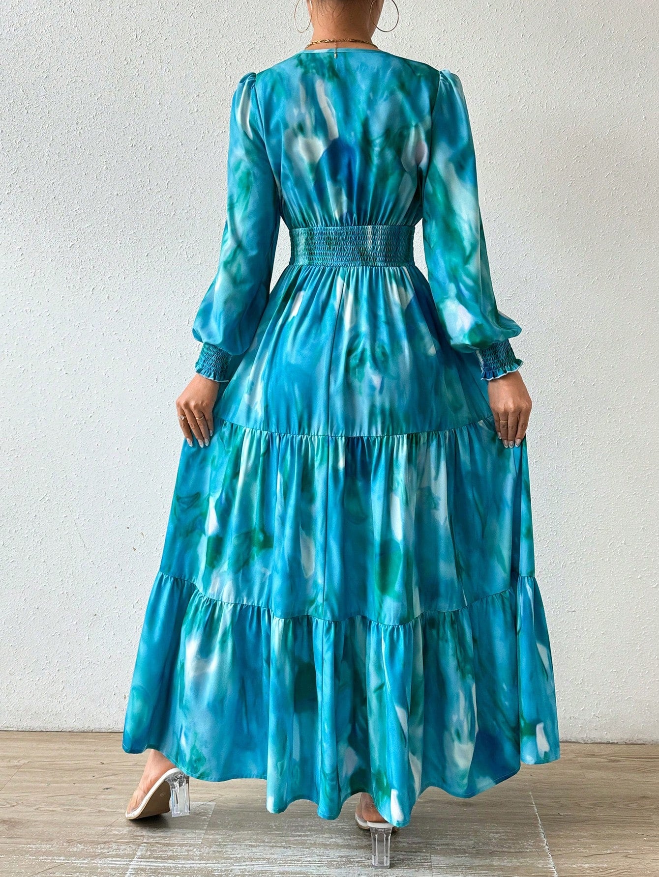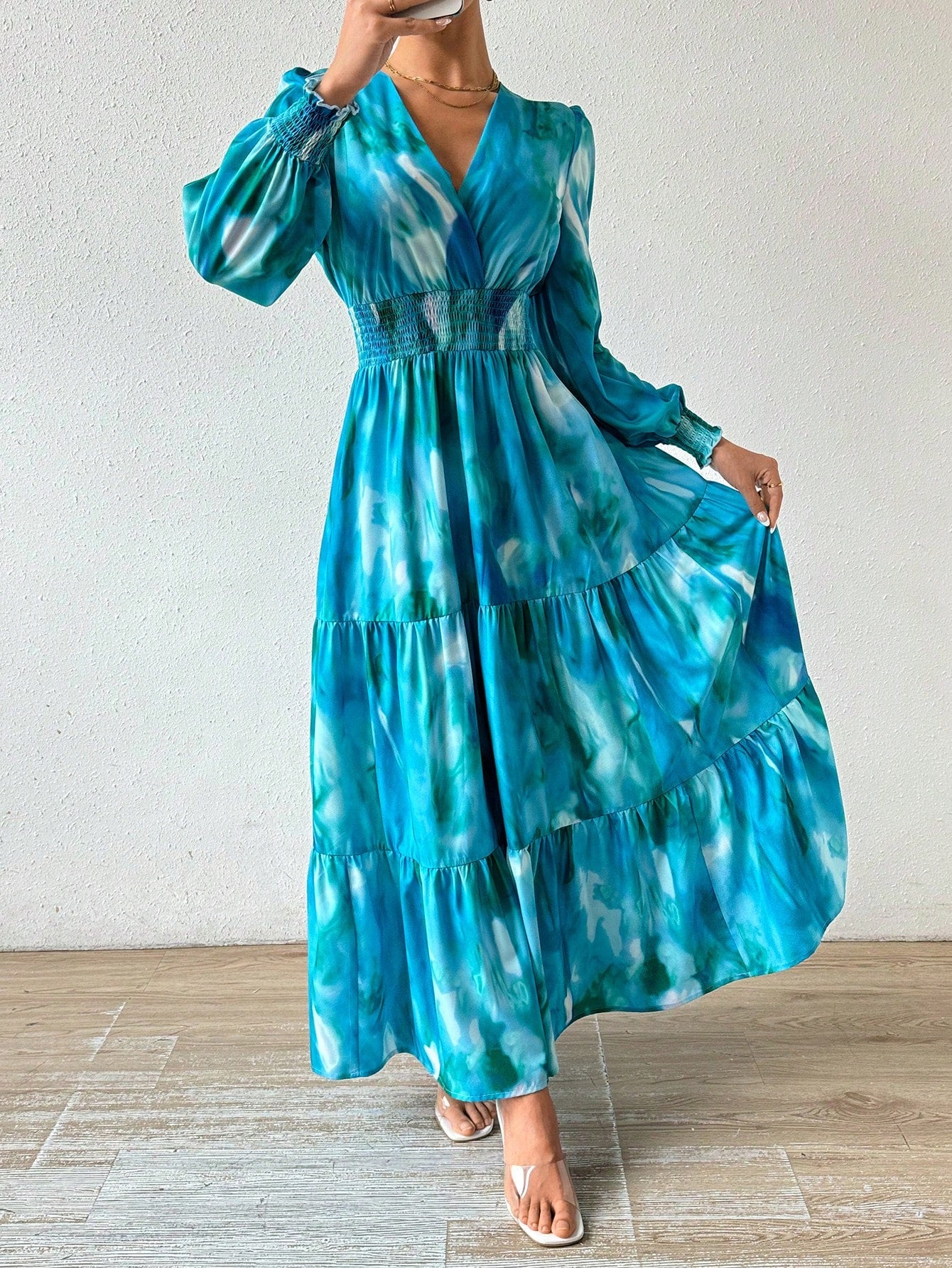 women Breezaya Tie-Dye Lantern Sleeve Drawstring High Waist Long Dress Maxi Women Outfit Fall Cloth For Women