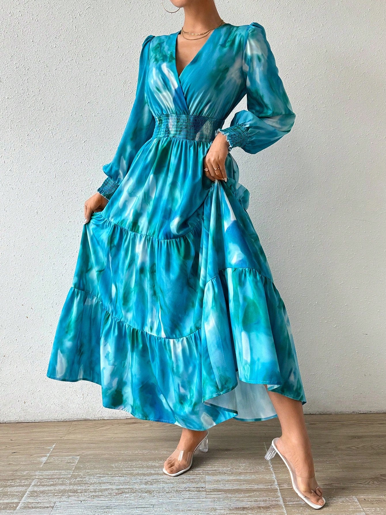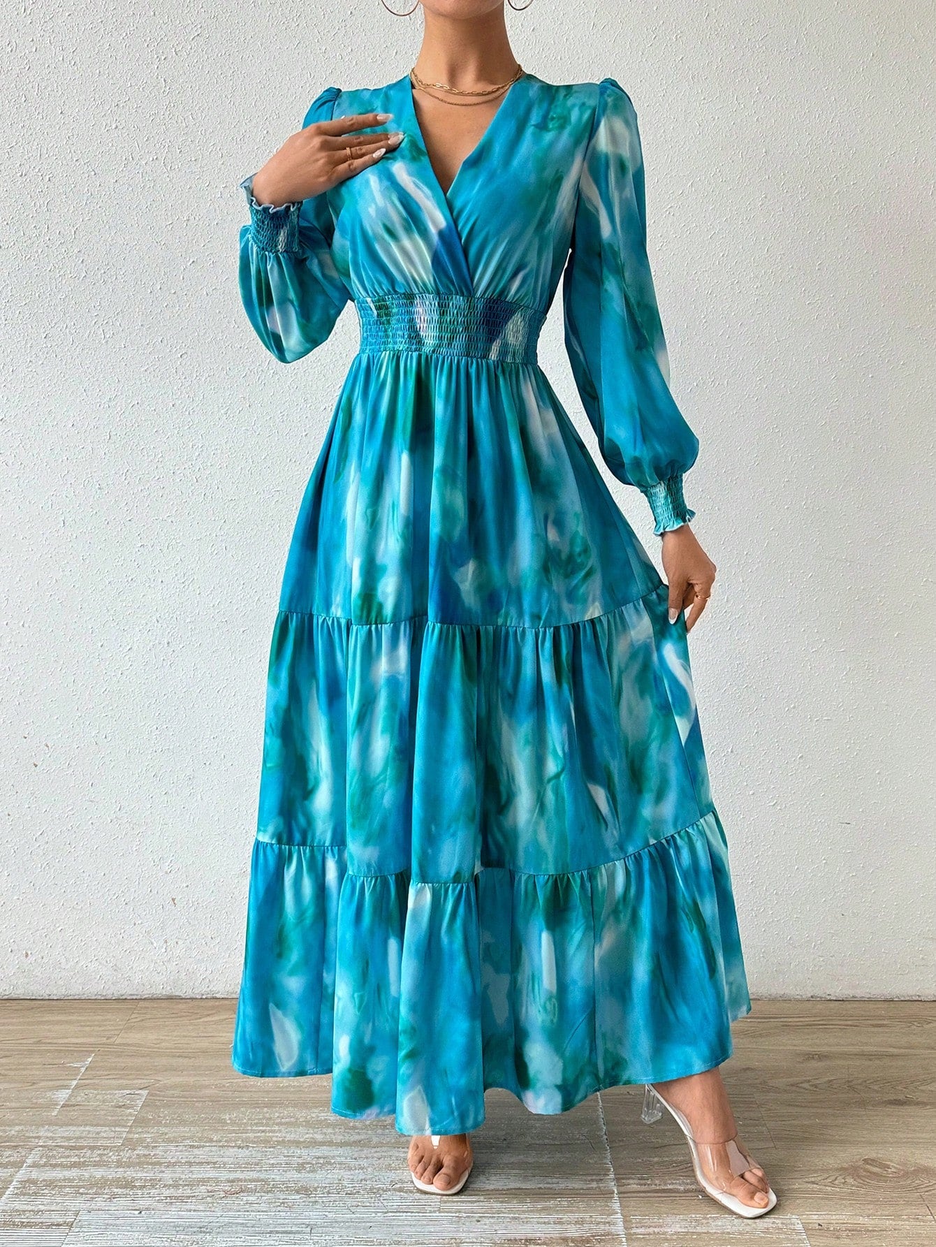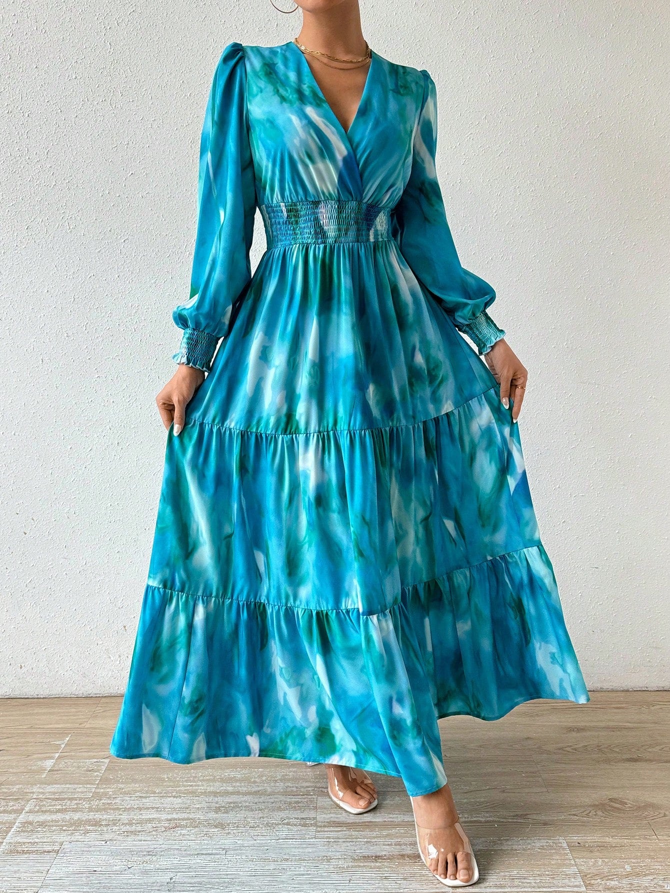 women Breezaya Tie-Dye Lantern Sleeve Drawstring High Waist Long Dress Maxi Women Outfit Fall Cloth For Women