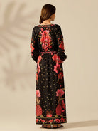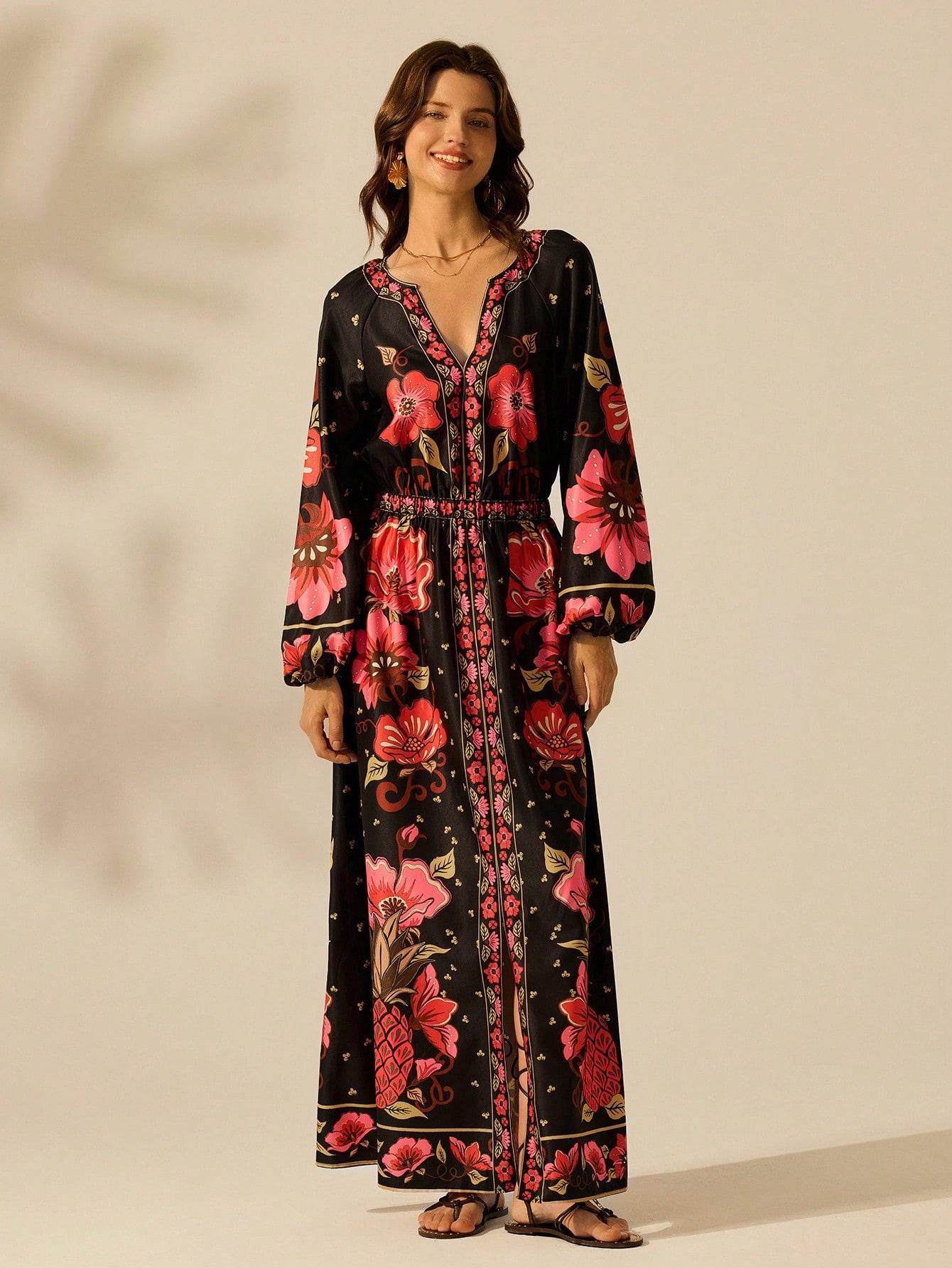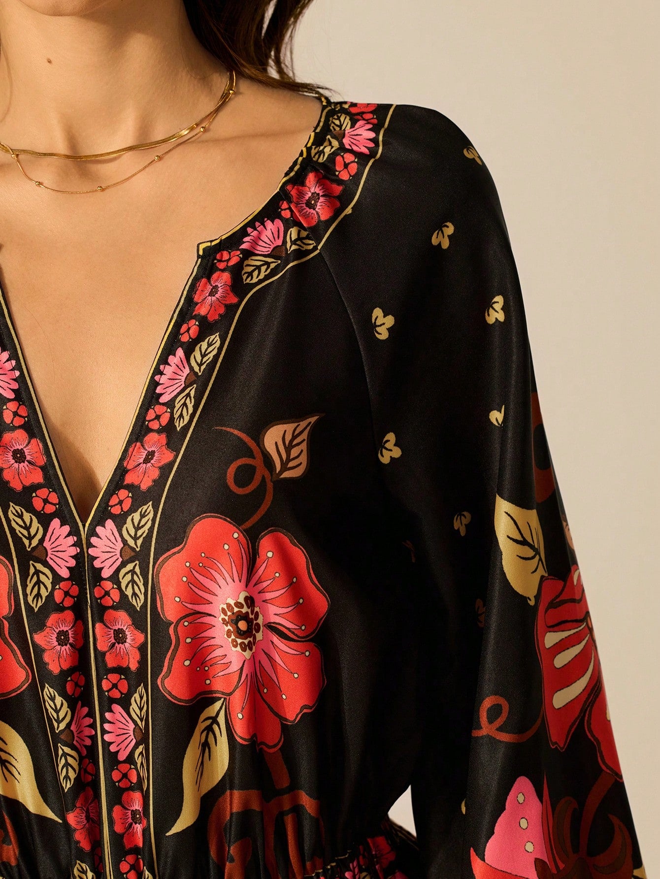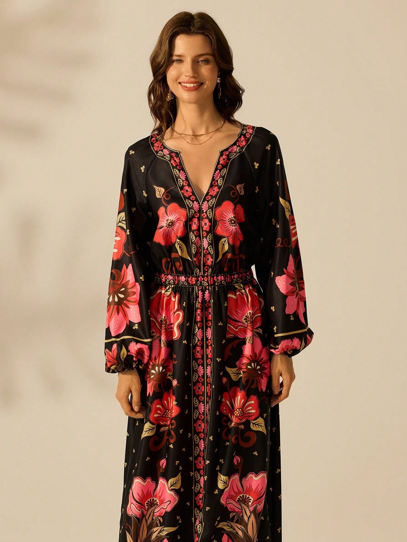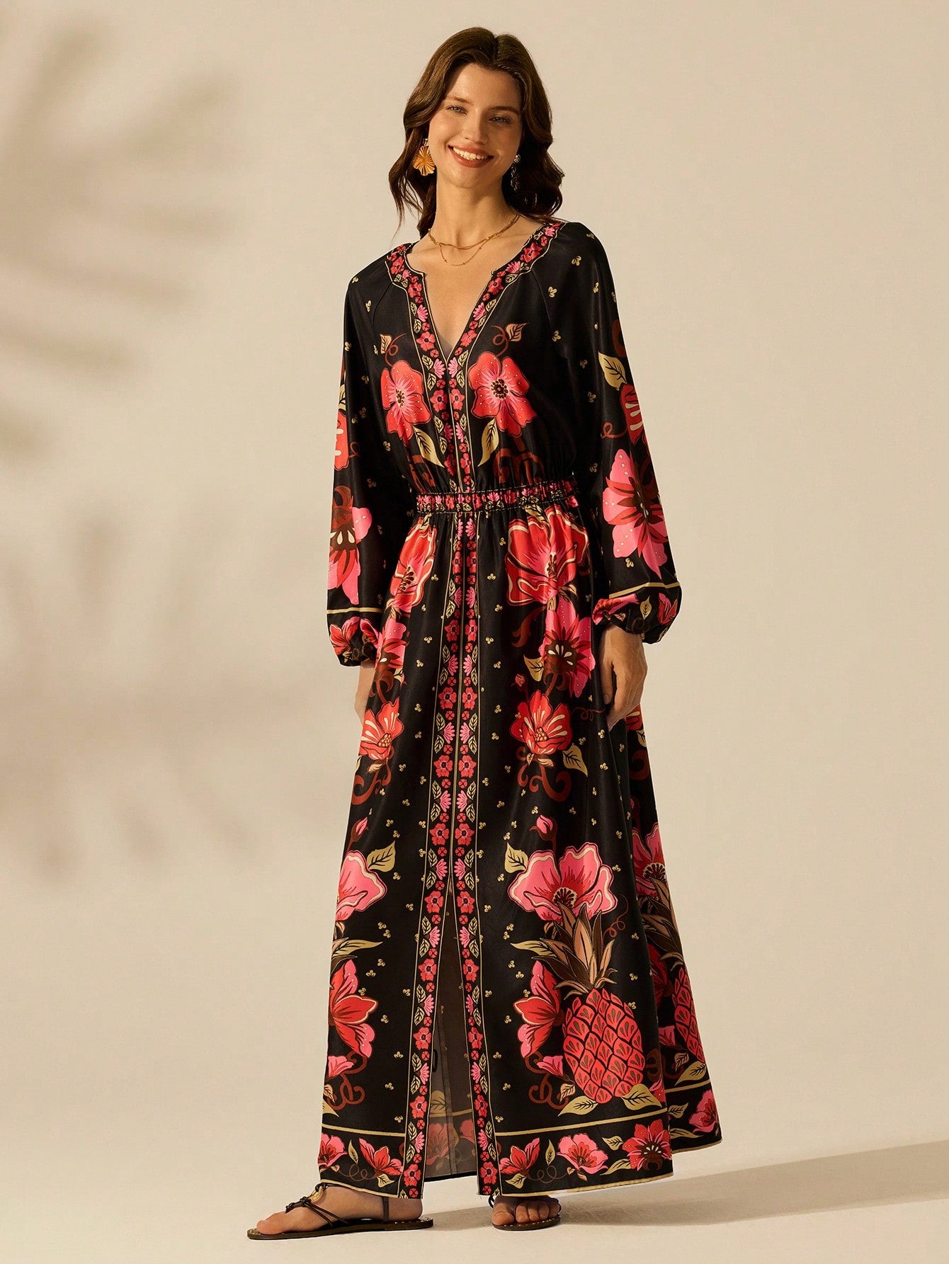 CAJUNI Women's Boho Tropical Floral Print Puff Sleeve V-Neck Dress
