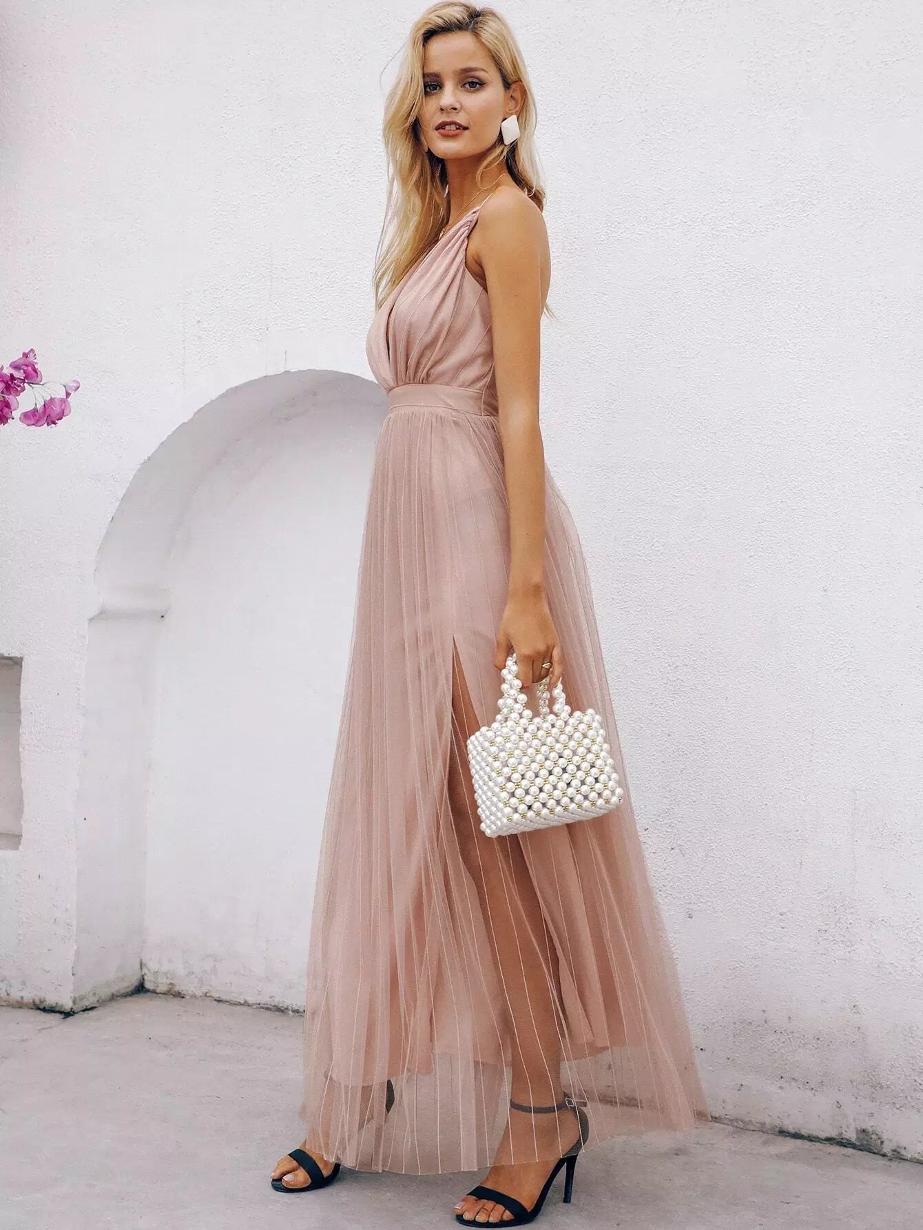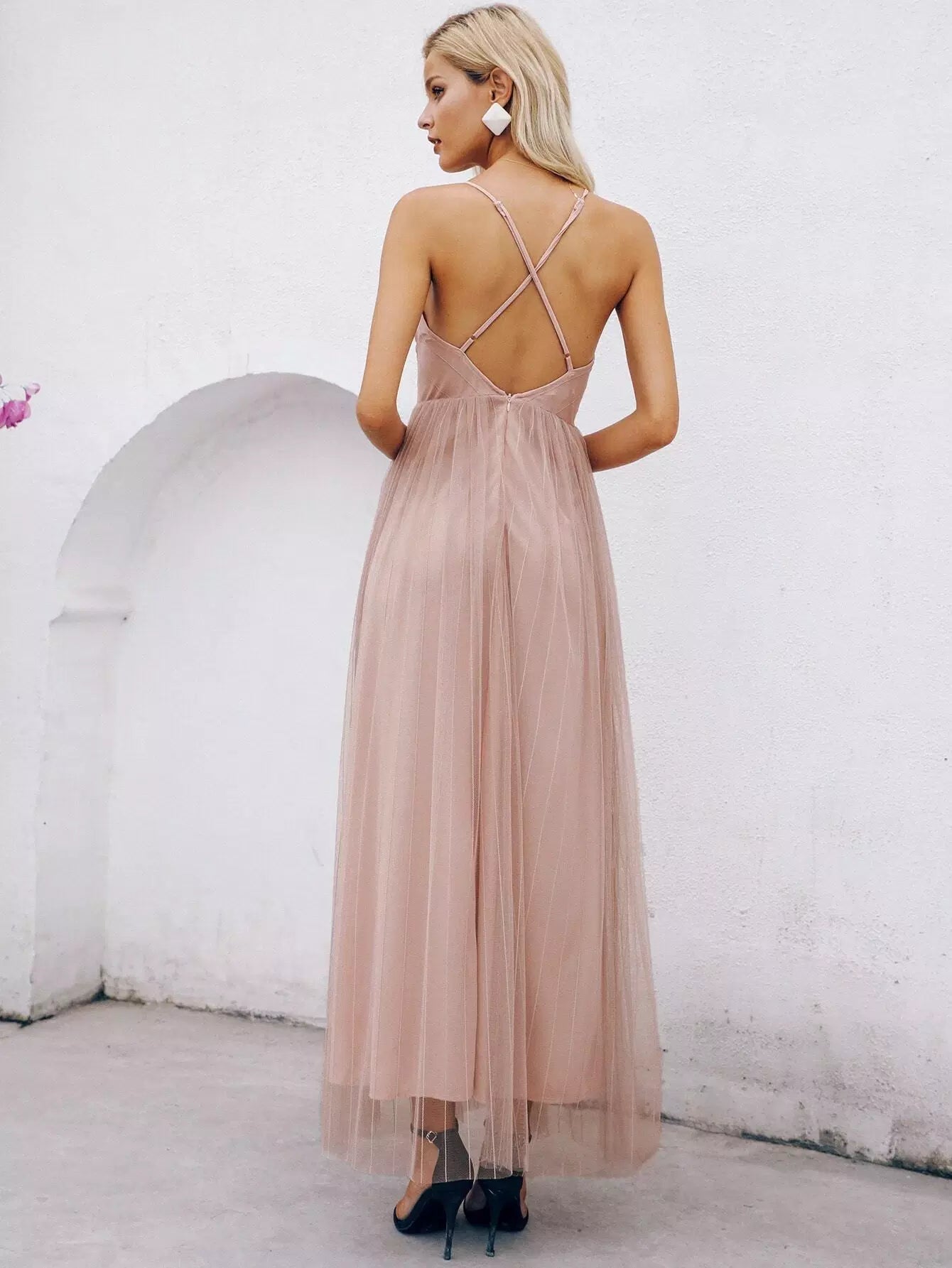 Criss-cross Backless Split Thigh Mesh Slip Dress