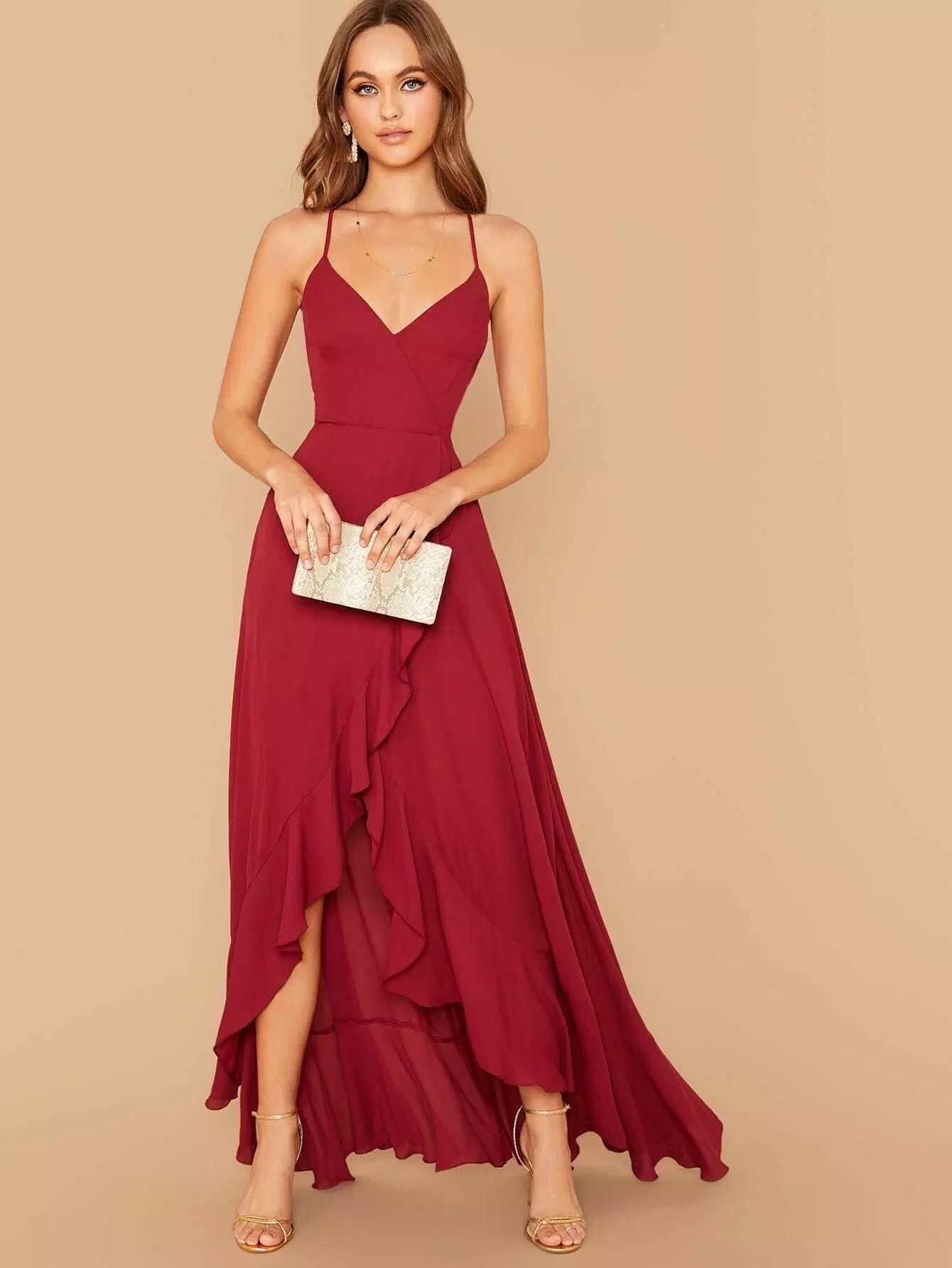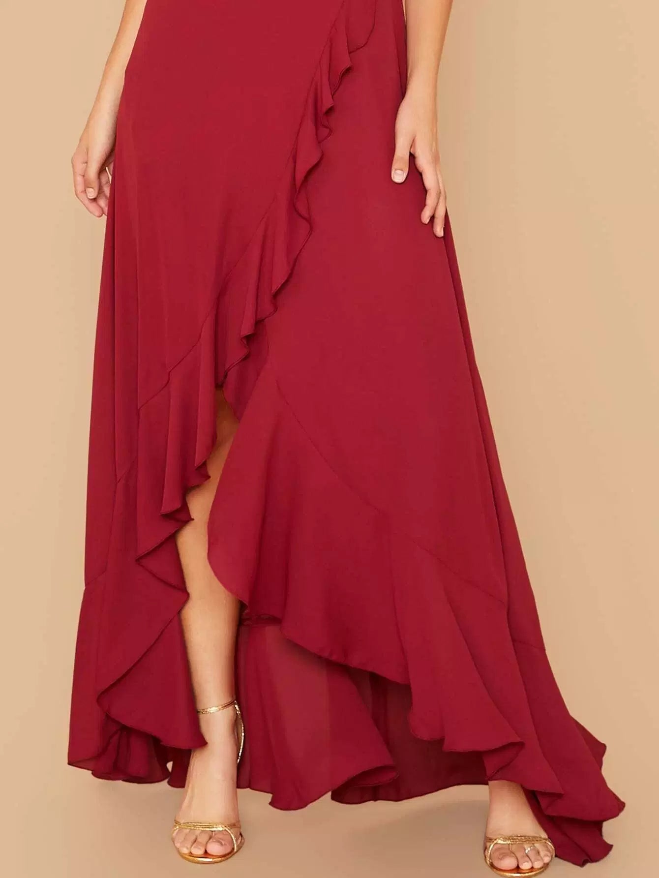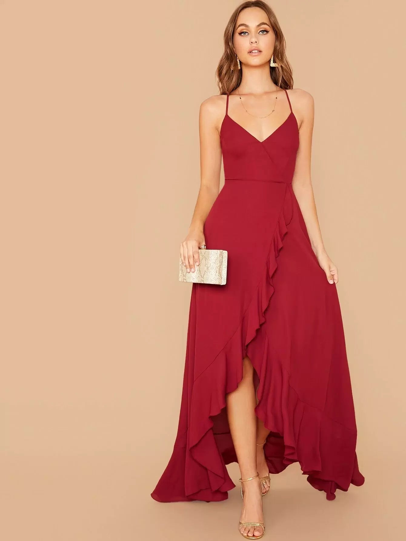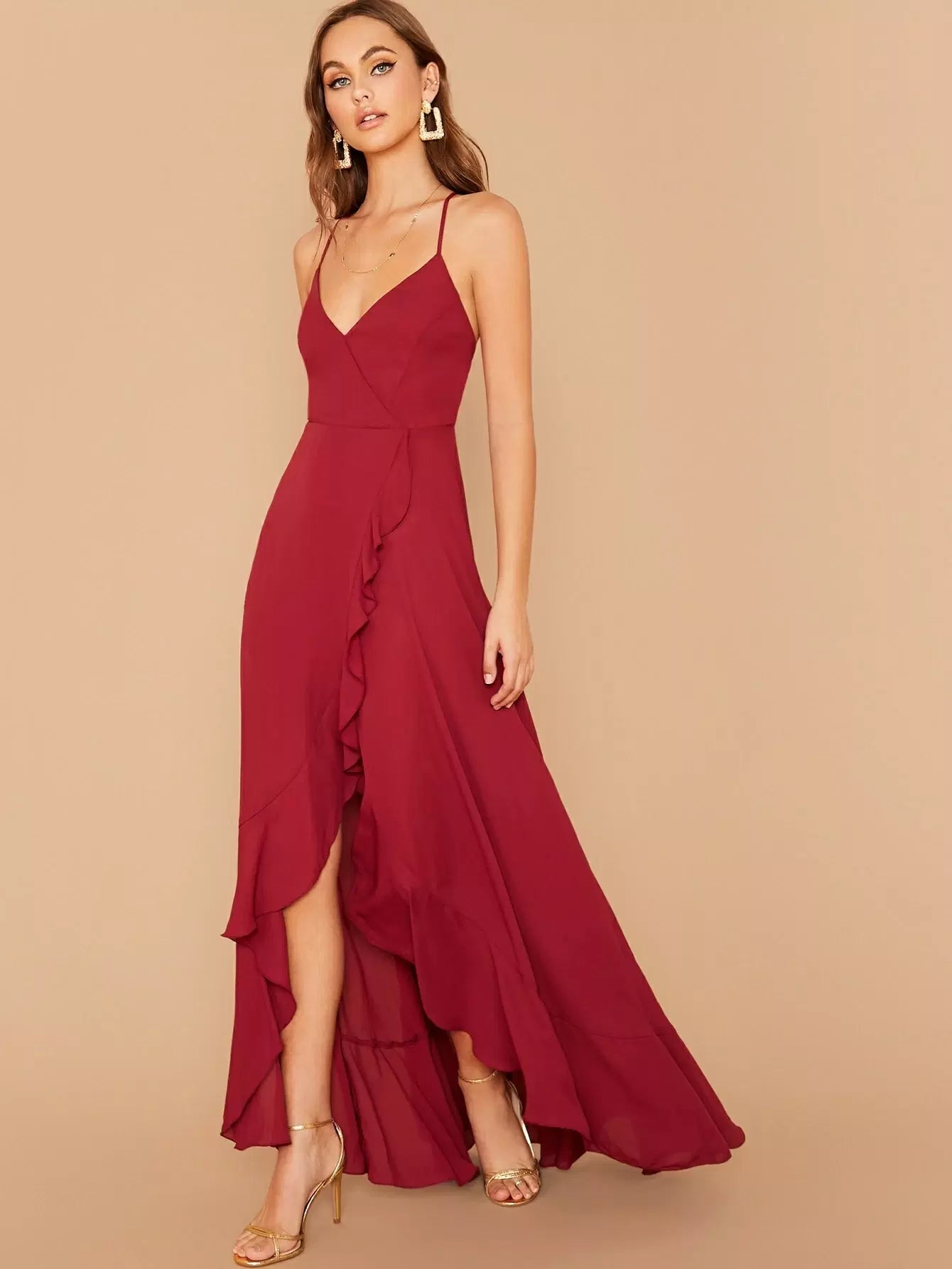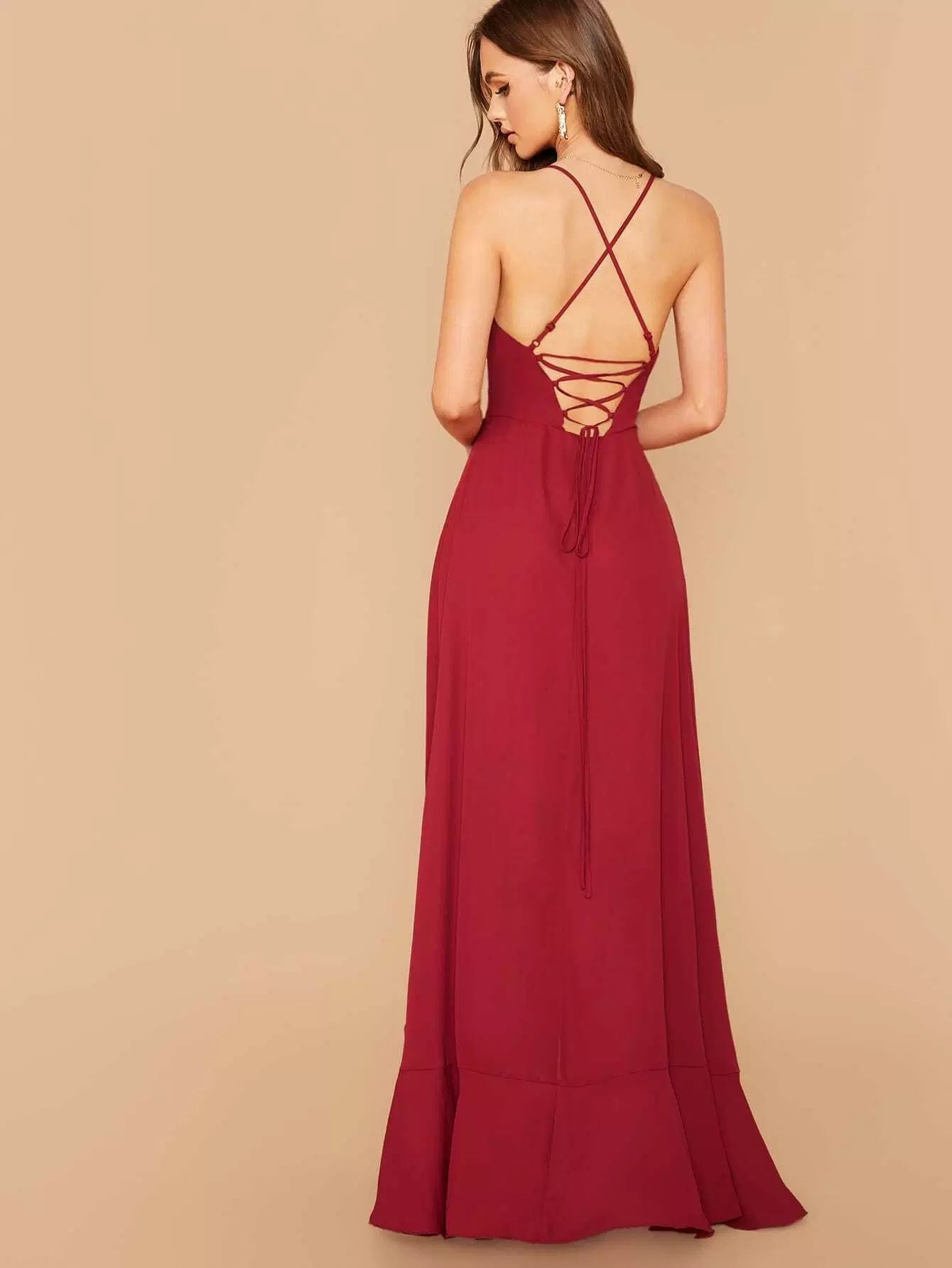 Crisscross Lace Up Back Ruffle Asymmetrical Hem Slip Dress