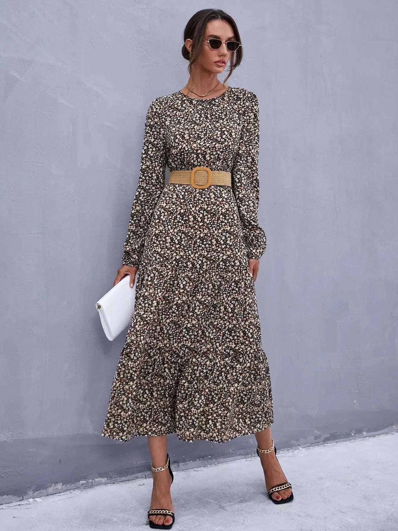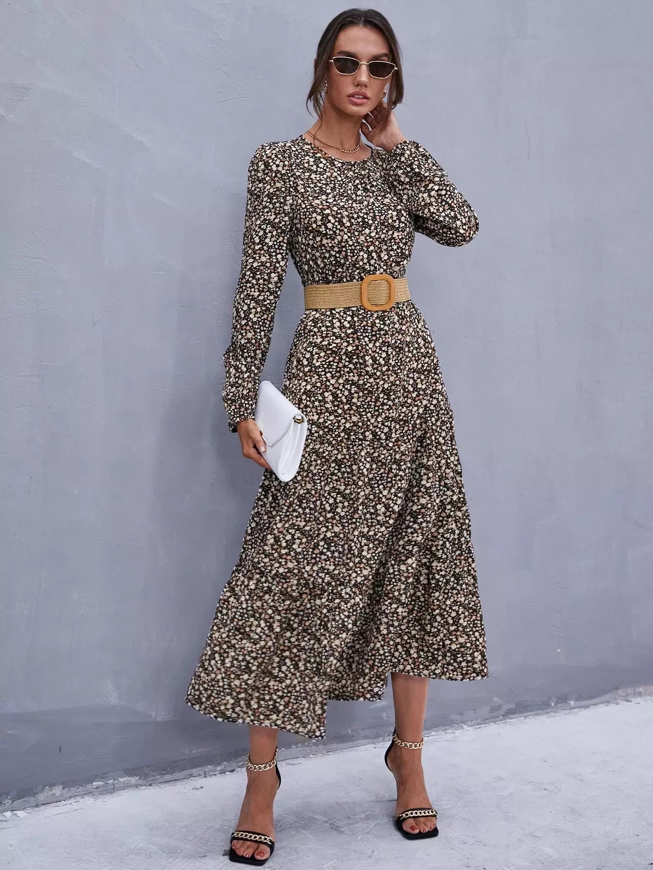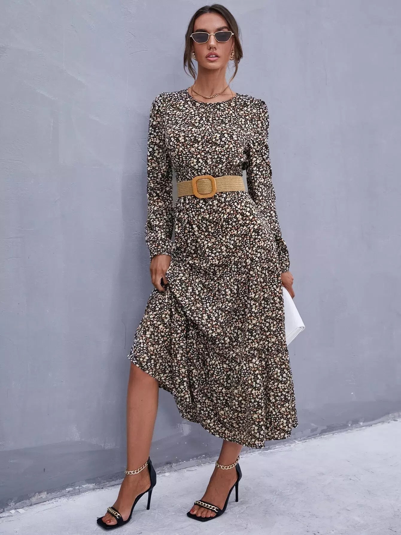 Ditsy Floral Bishop Sleeve Ruffle Hem Dress Without Belt
