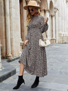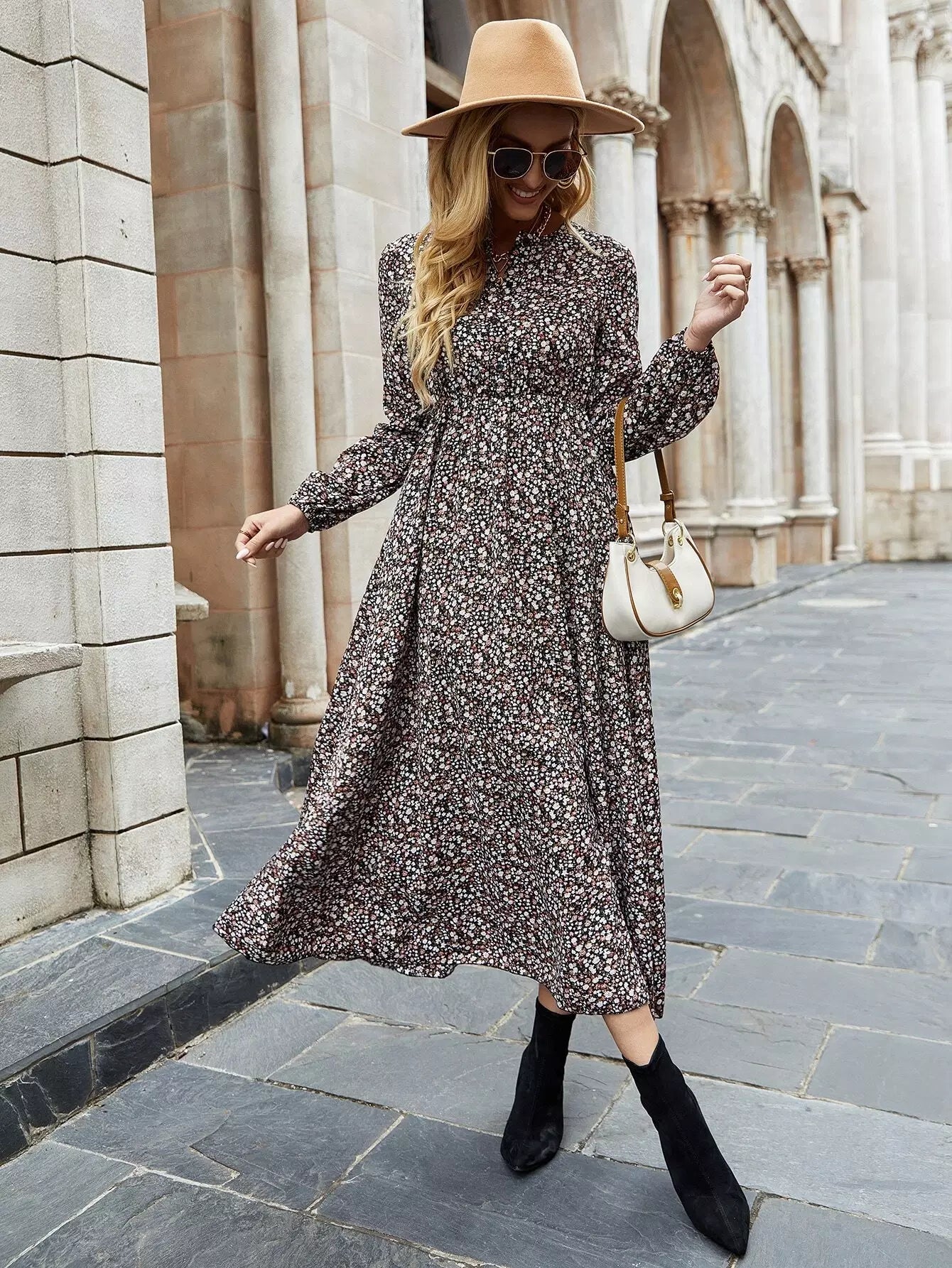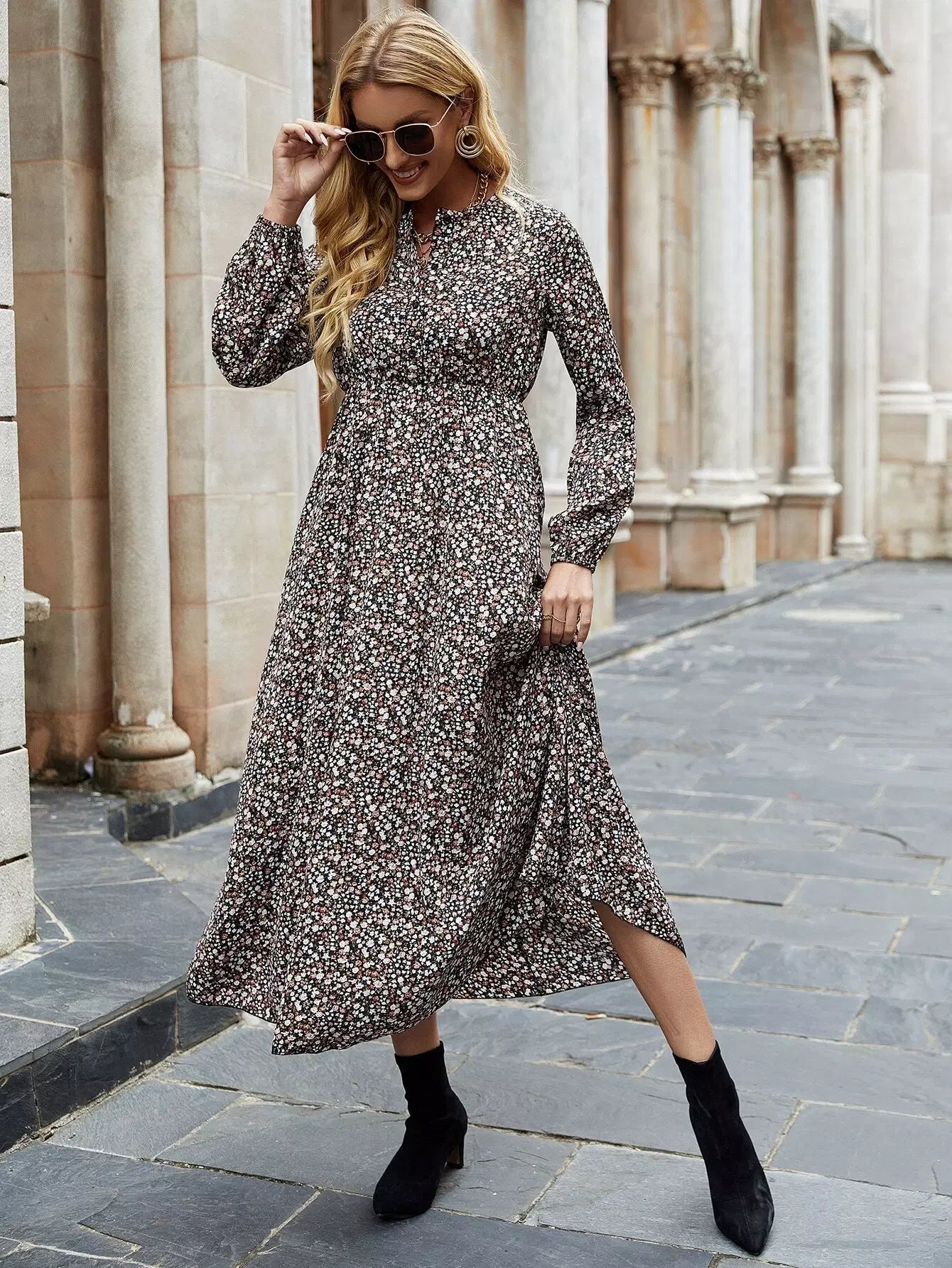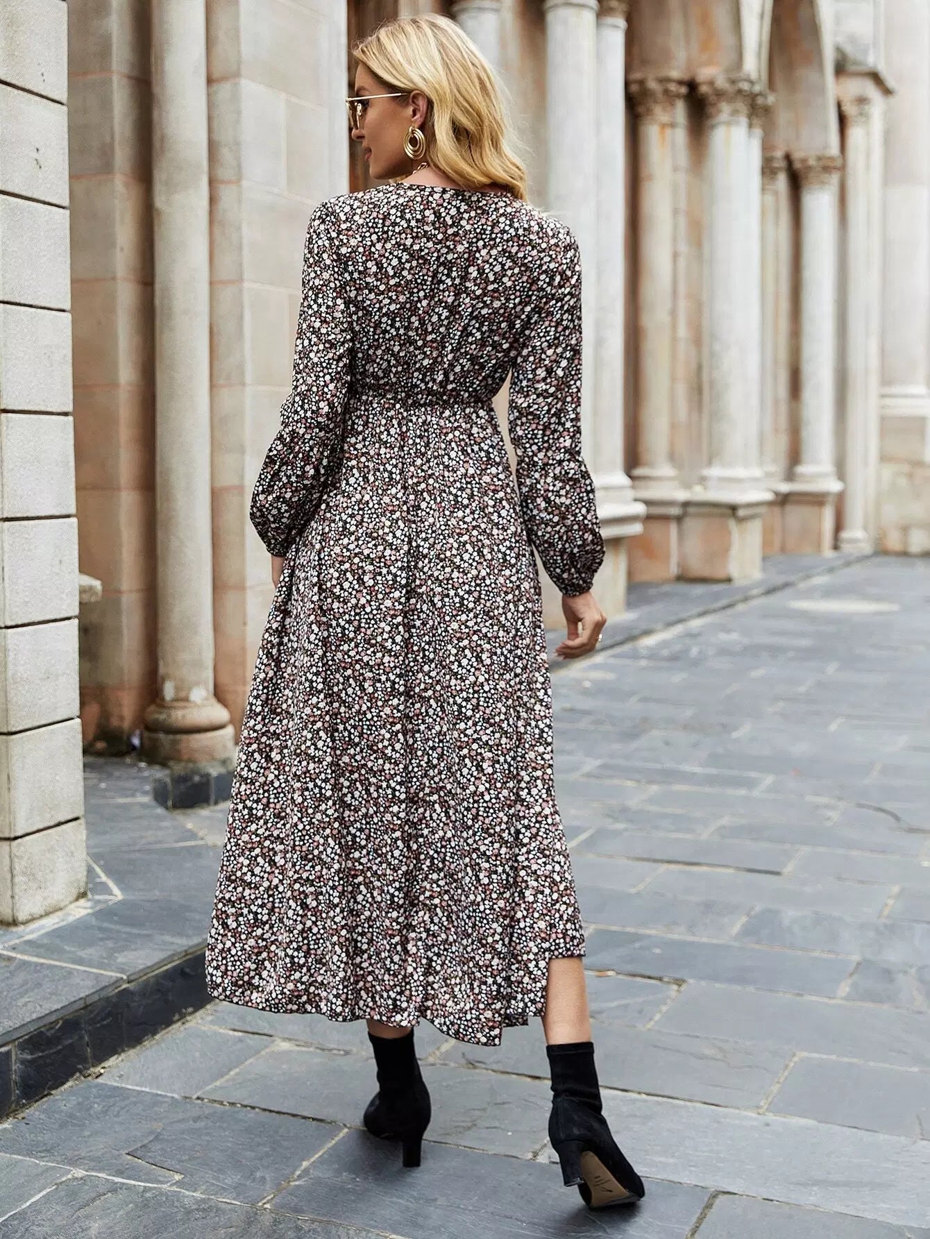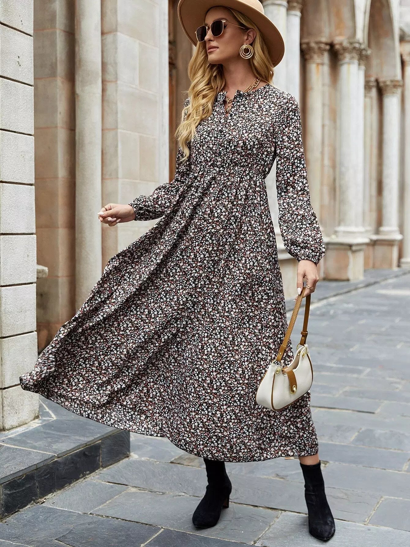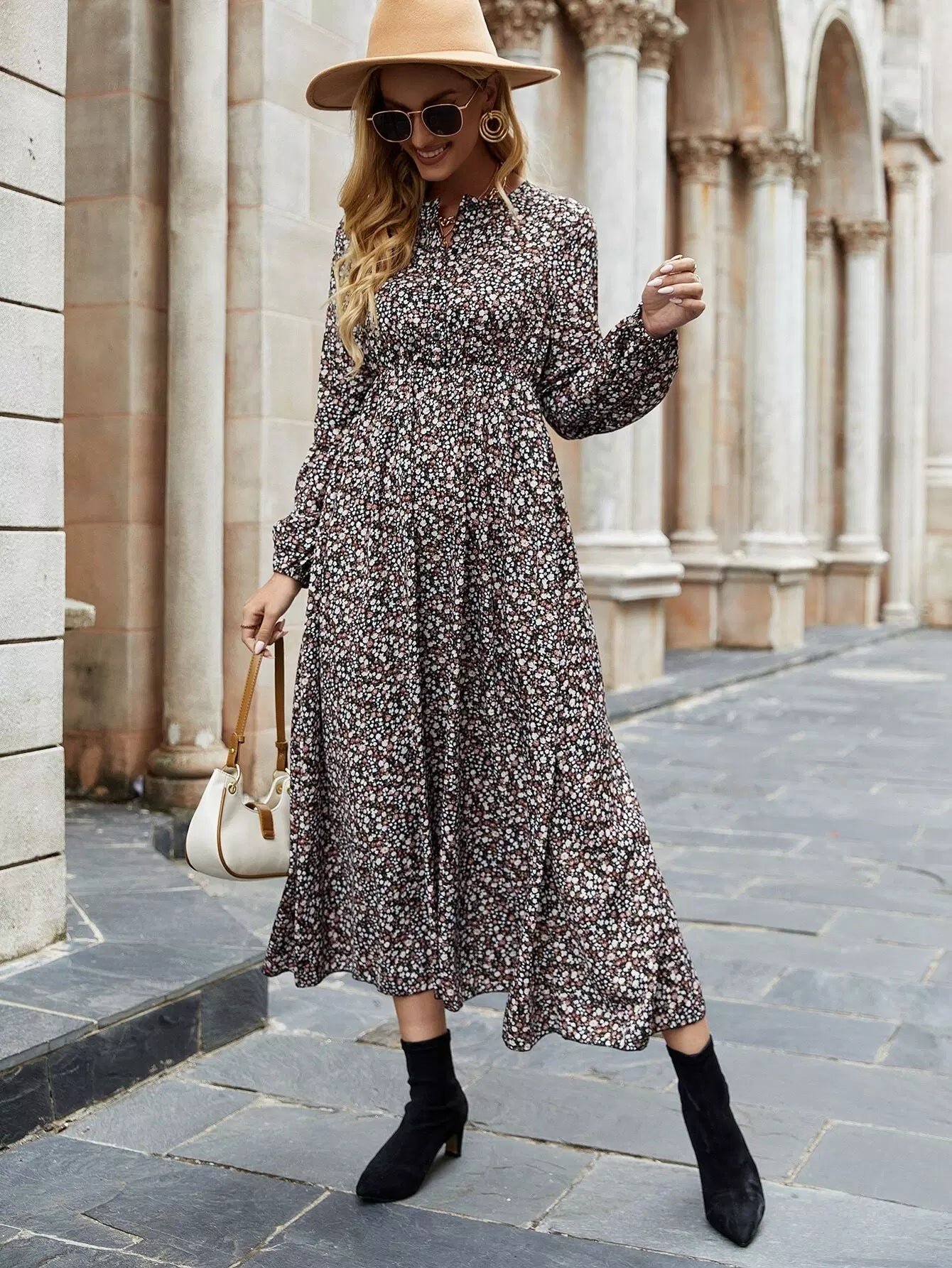 Ditsy Floral Quarter Button Lantern Sleeve A-line Dress