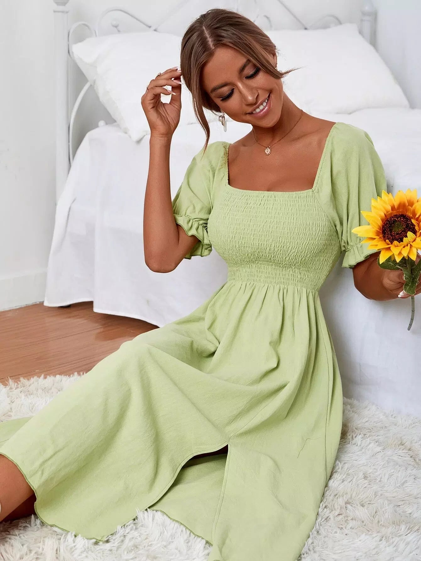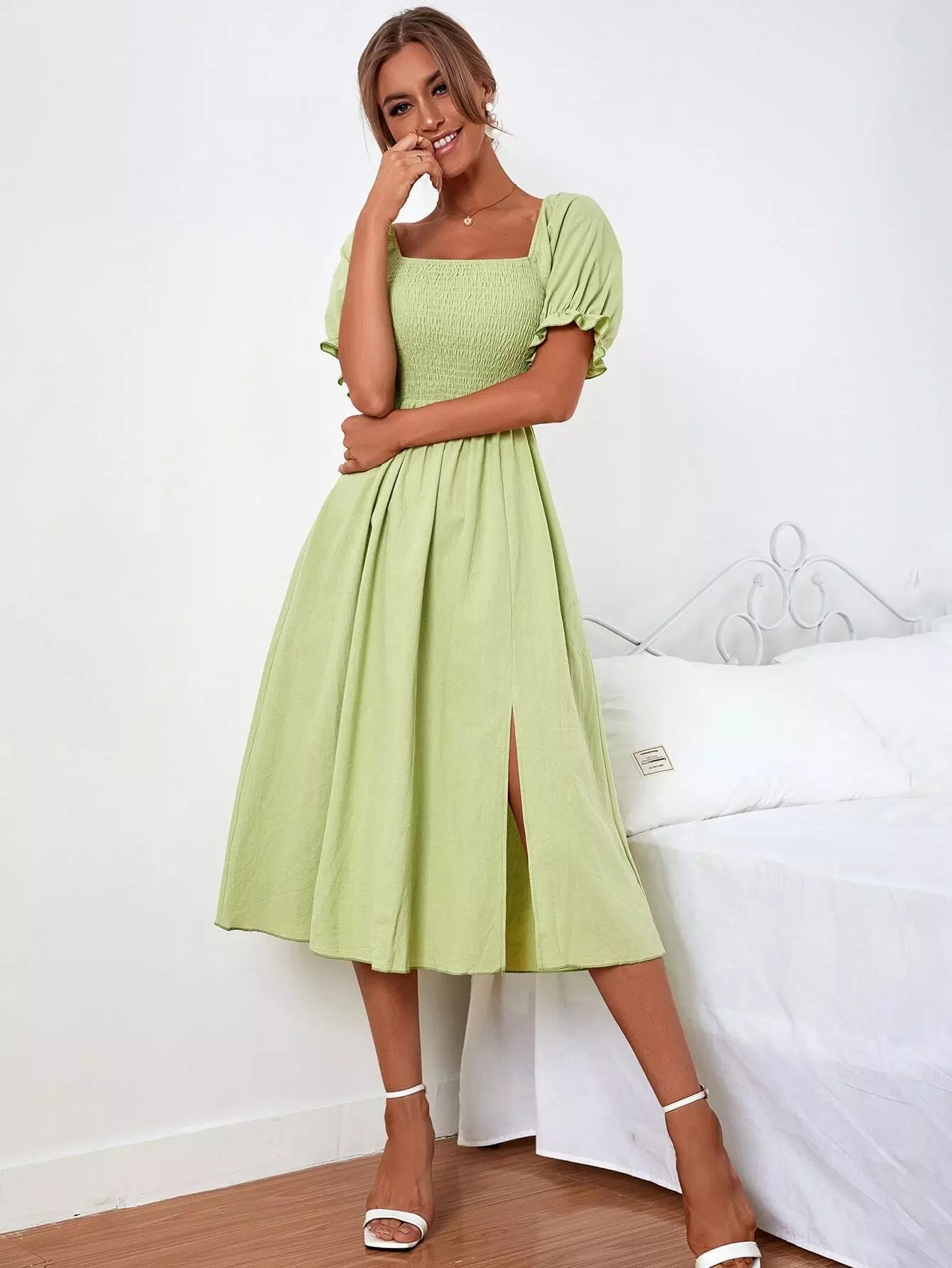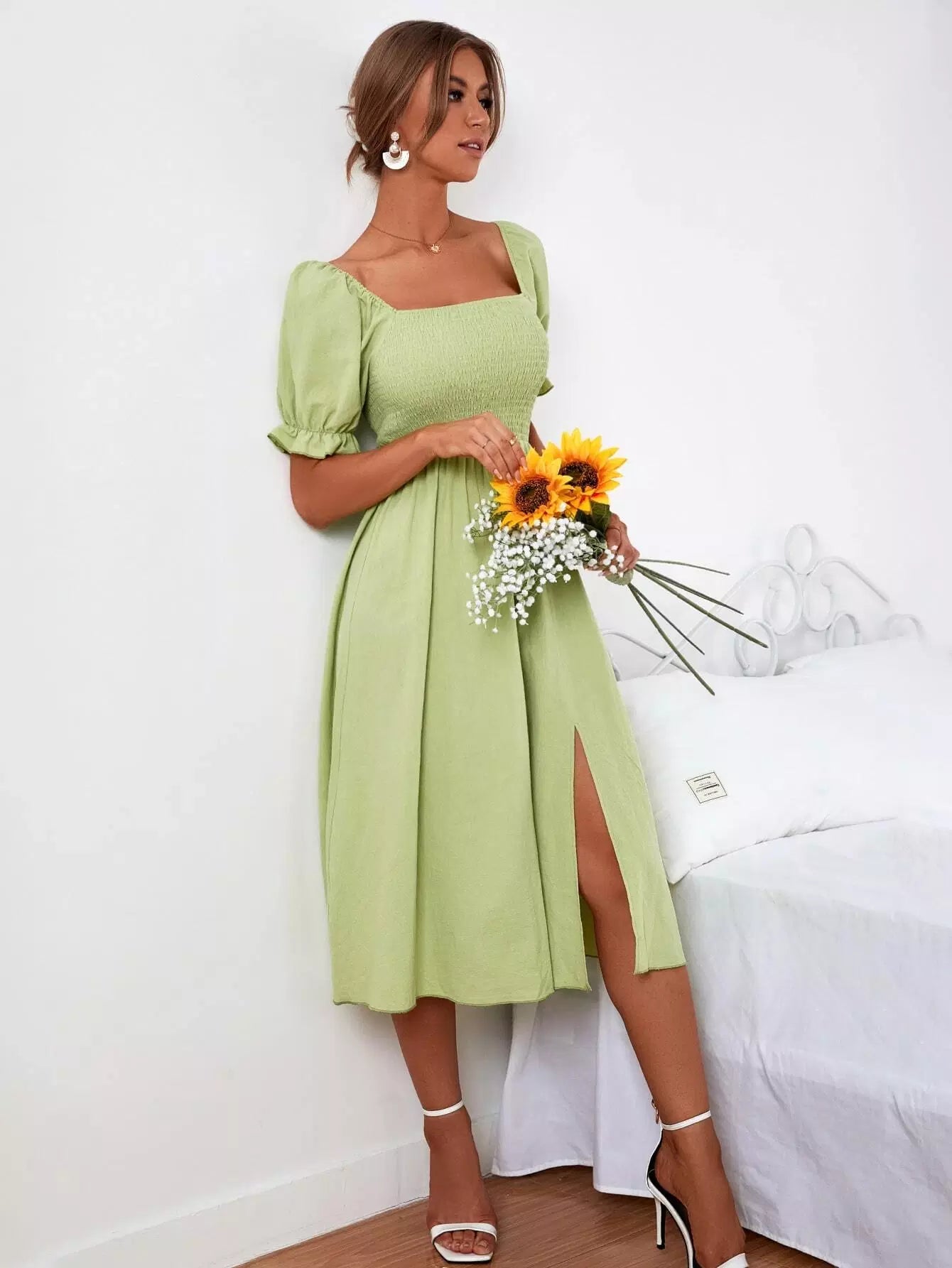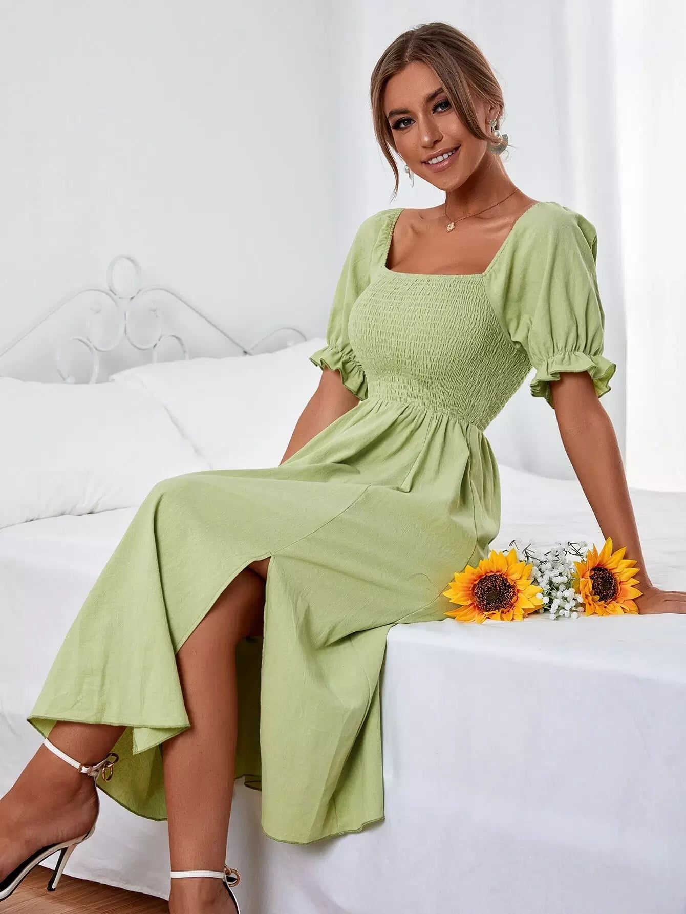 Flounce Sleeve Shirred Detail Split Thigh Dress