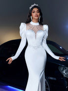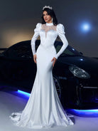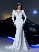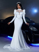 Glamrae Elegant Romantic Luxurious White Elastic Knitted Satin Stand Collar Gigot Sleeve Jeweled Fishtail Hem Maxi Wedding Dress