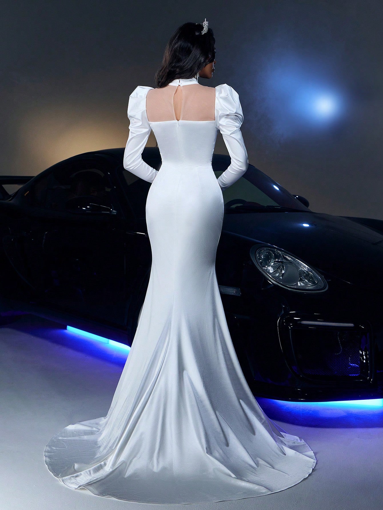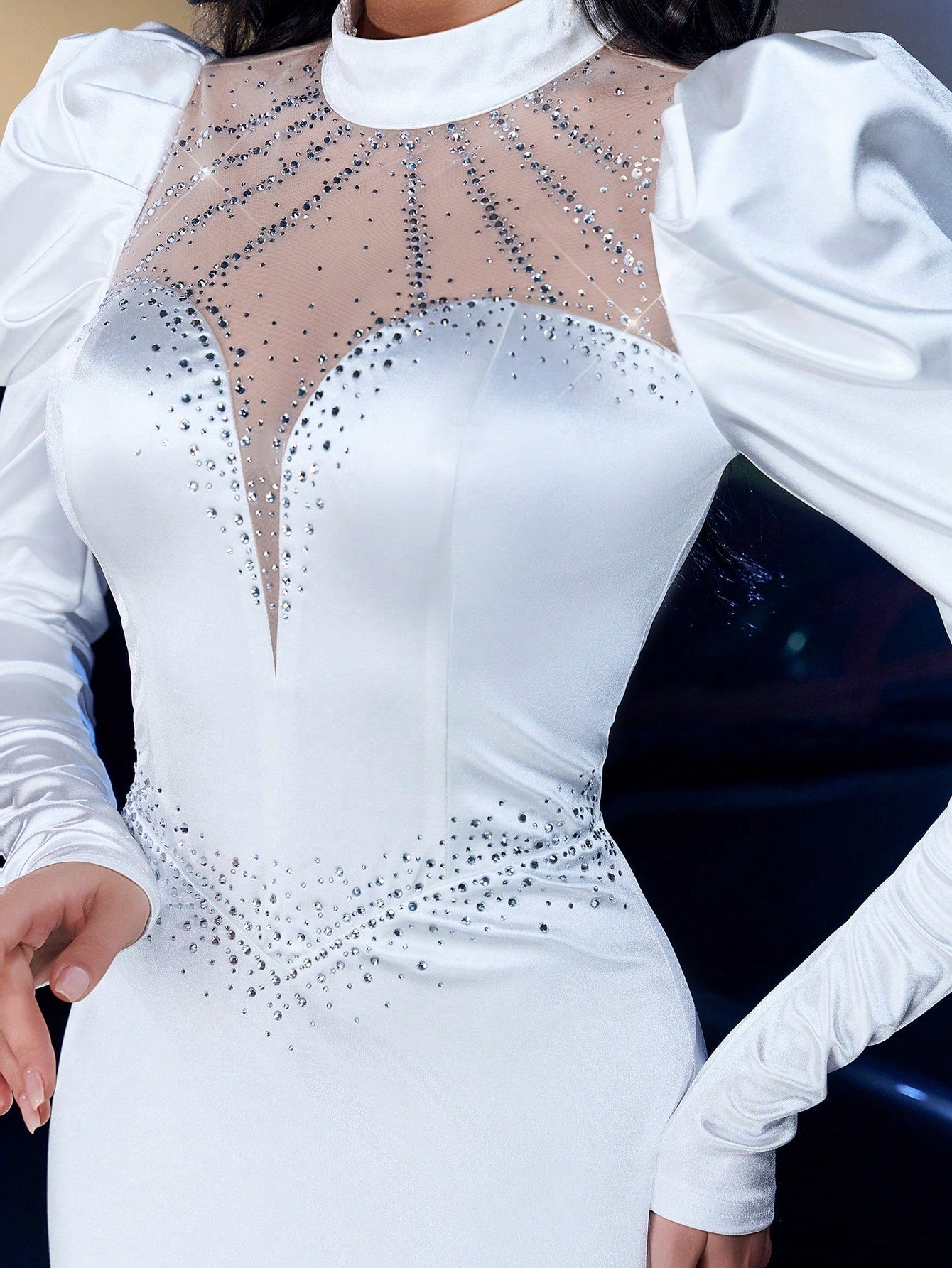 women Glamrae Elegant Romantic Luxurious White Elastic Knitted Satin Stand Collar Gigot Sleeve Jeweled Fishtail Hem Maxi Wedding Dress