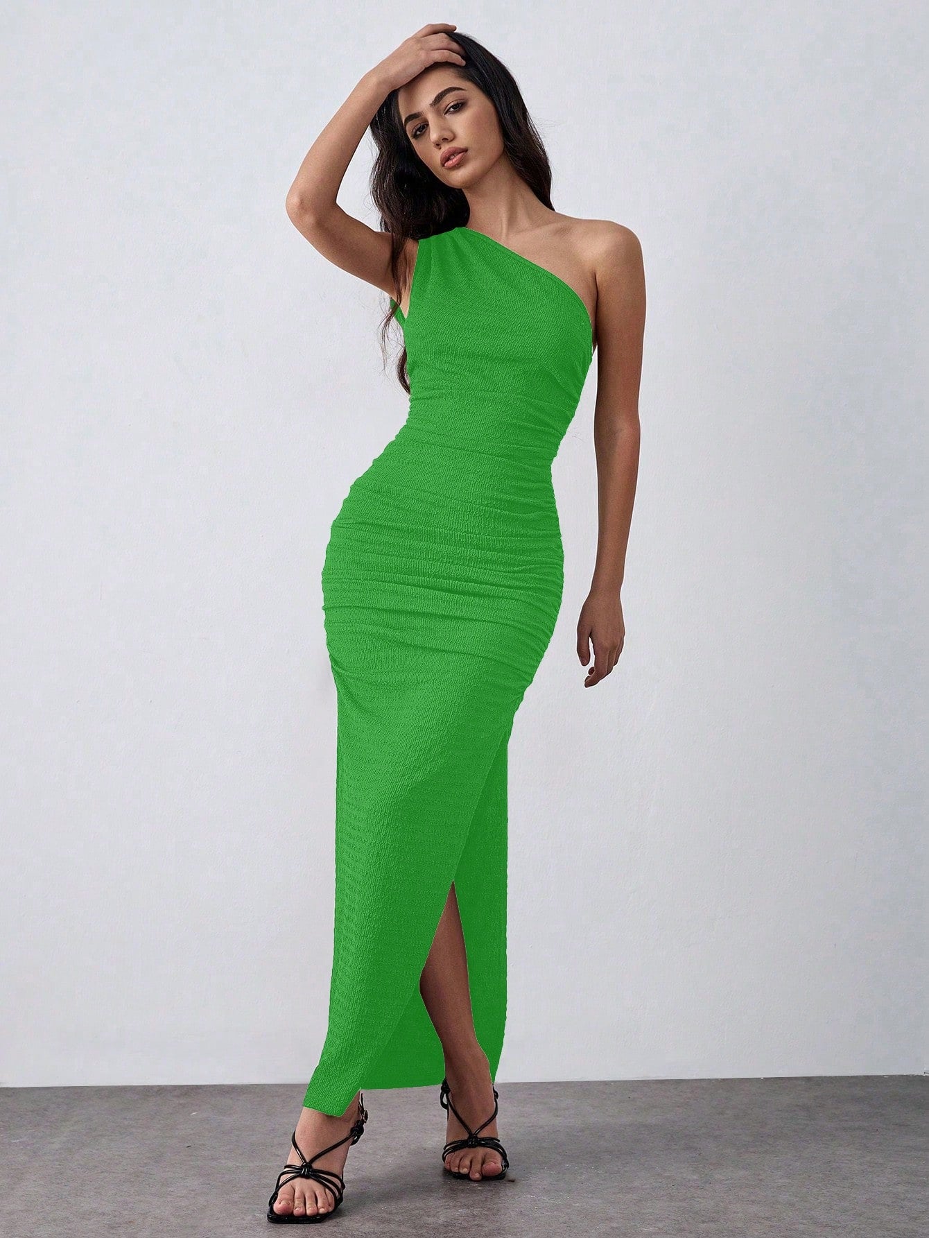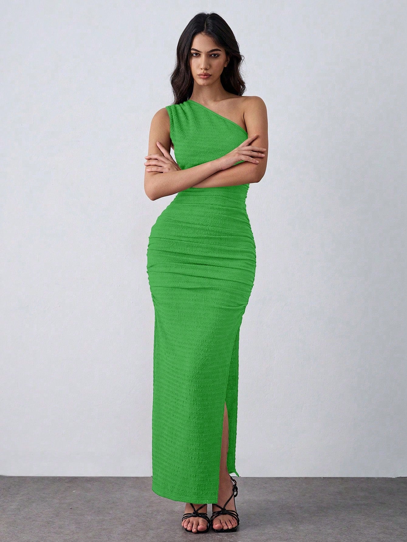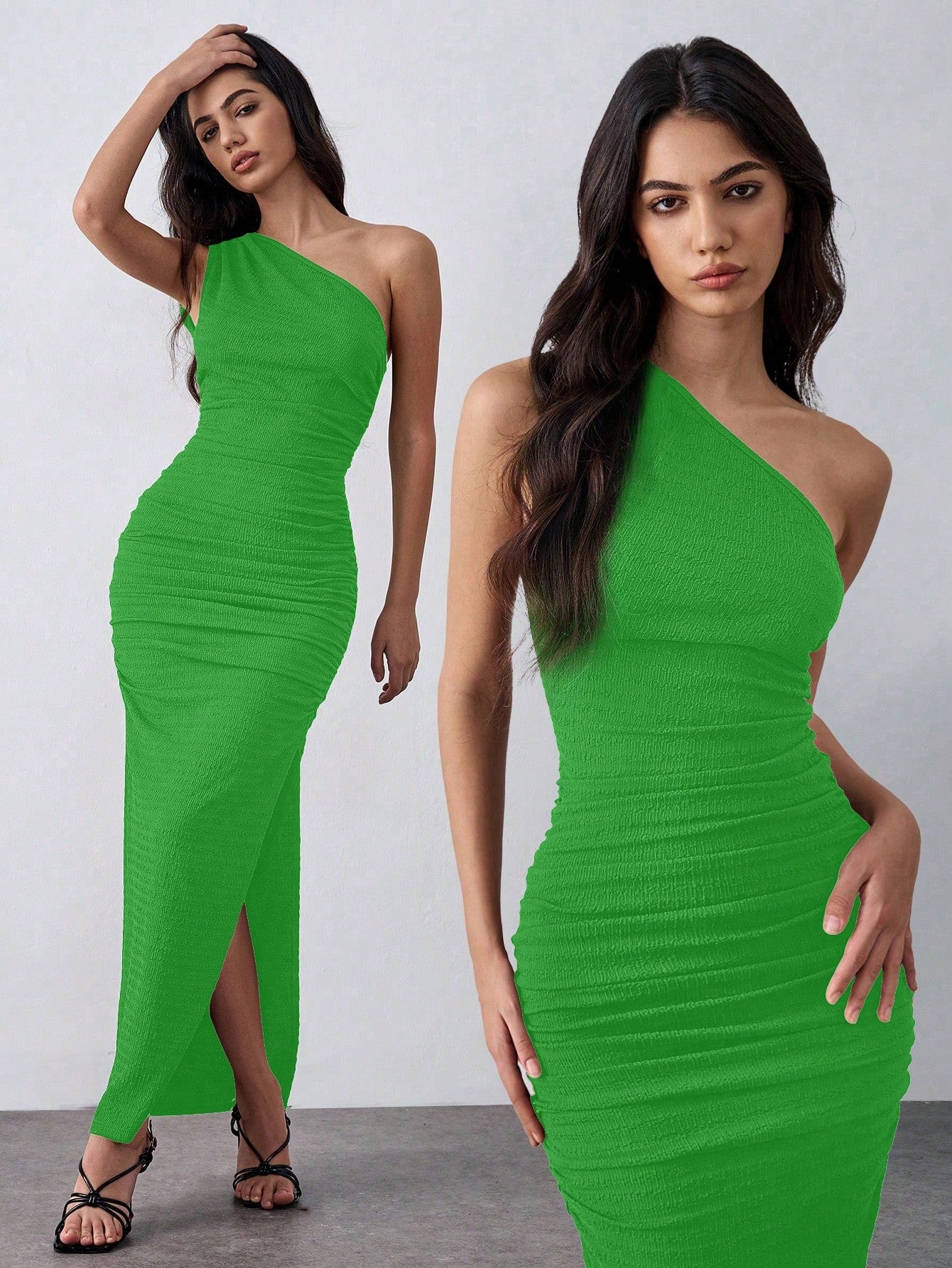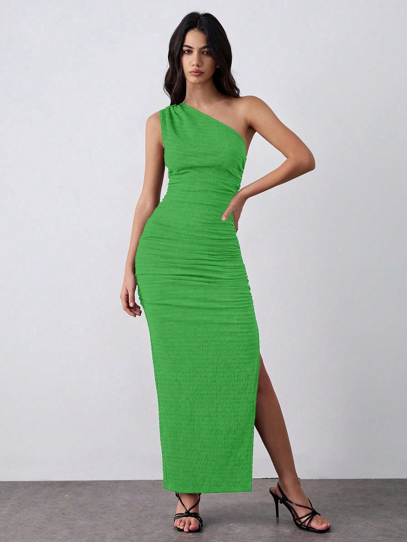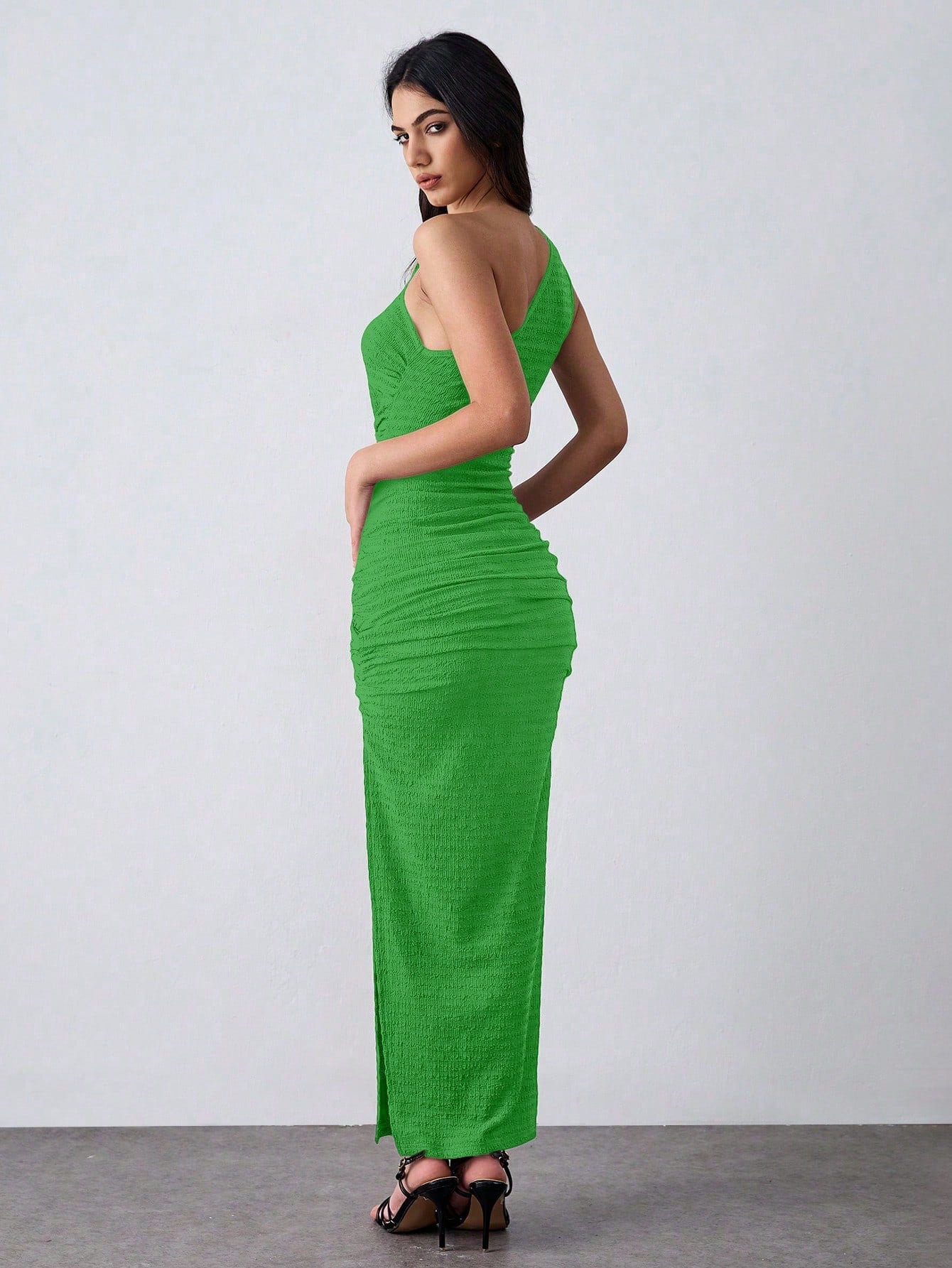 Lumivelle Knit Elastic Textured One-Shoulder Green Bodycon Dress