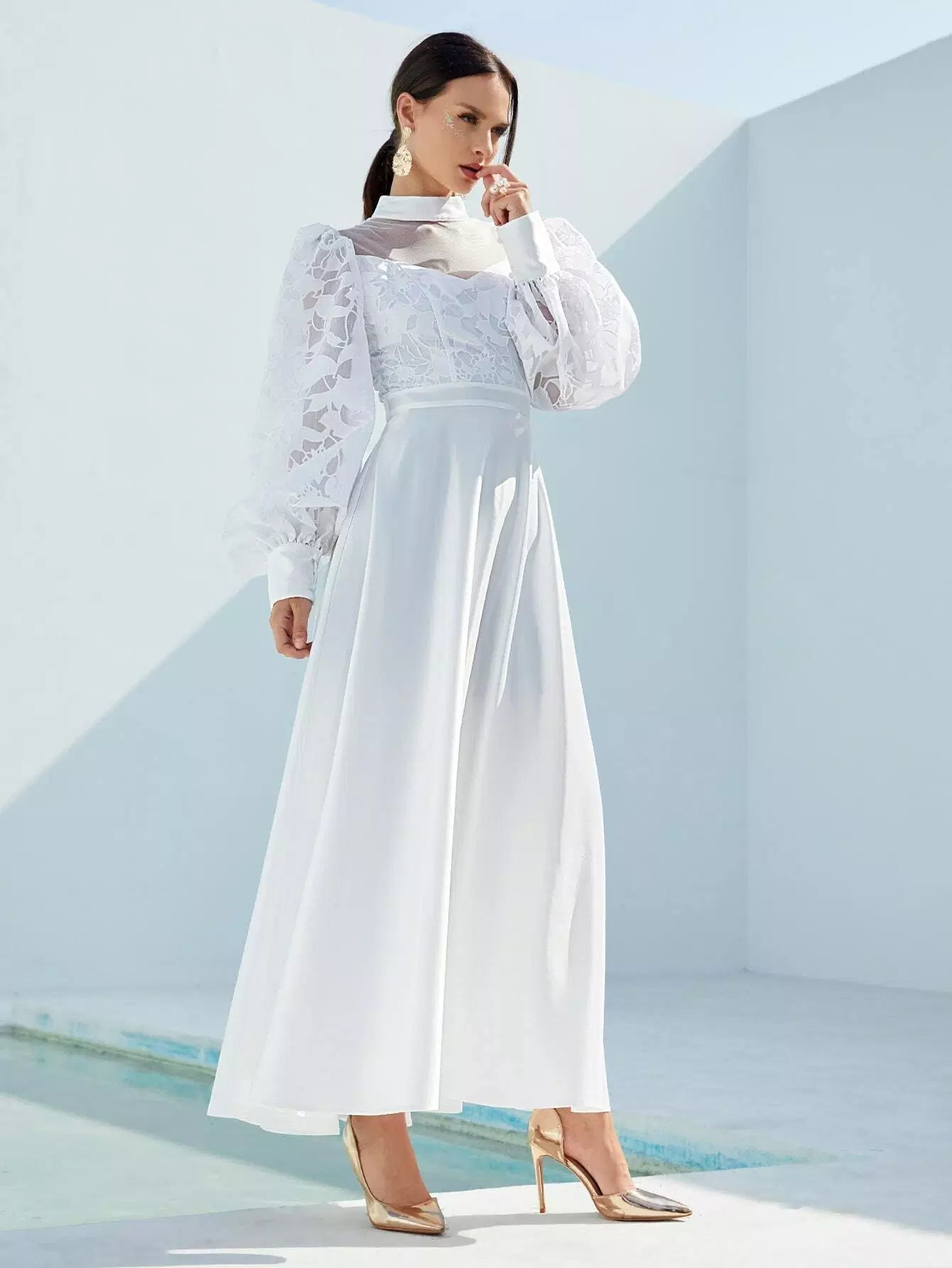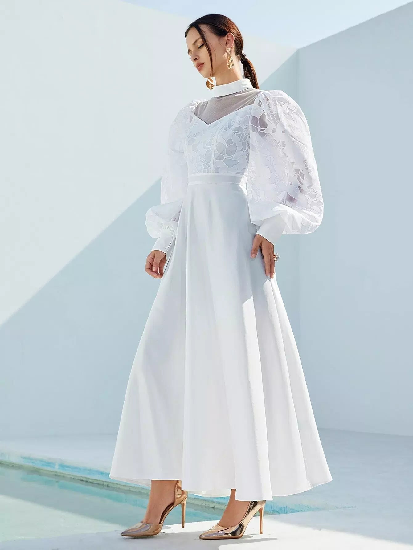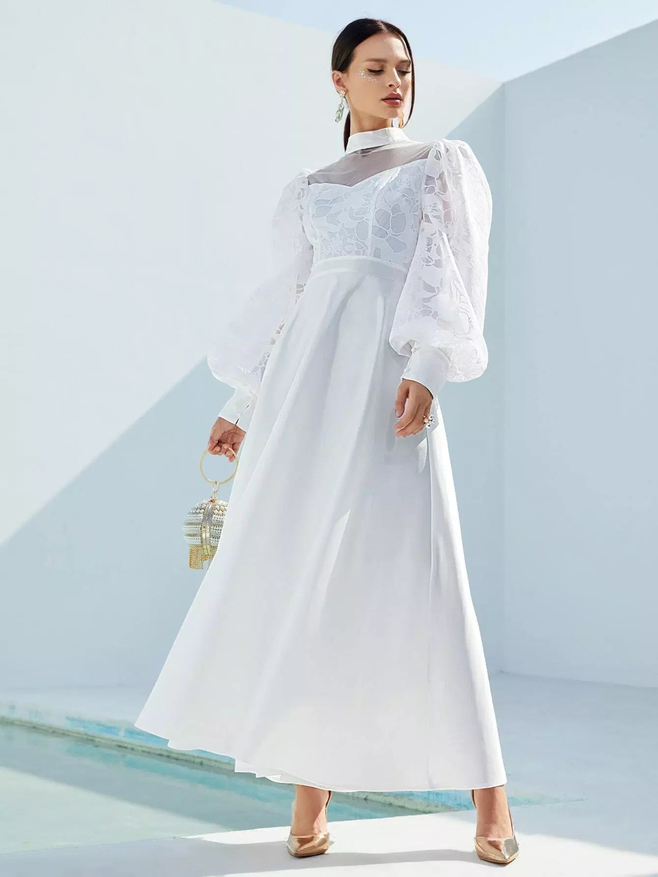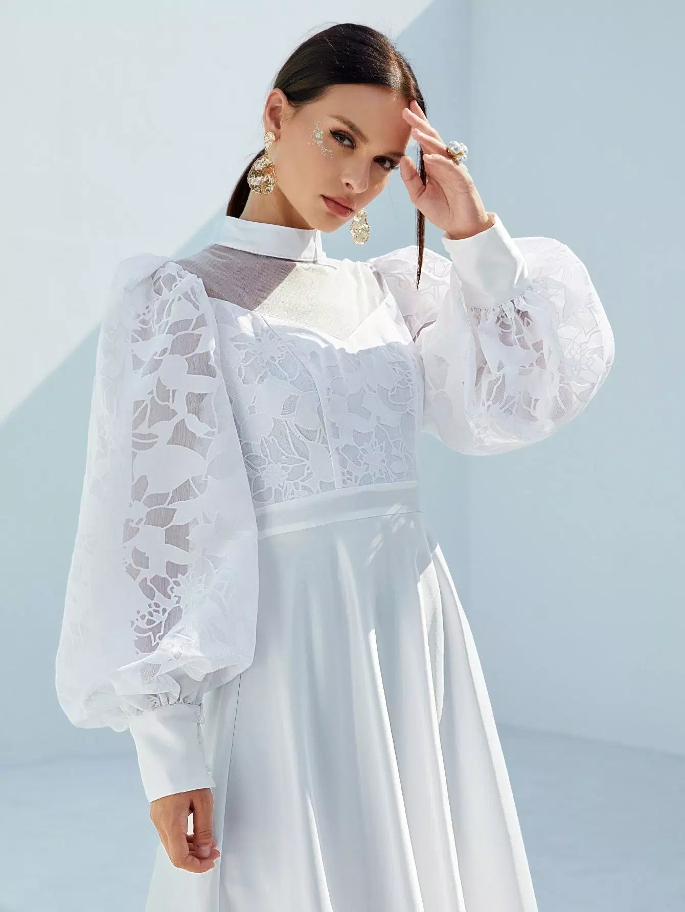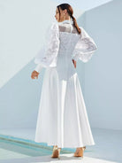 Mock-Neck Lantern Sleeve Mesh Yoke Appliques Dress
